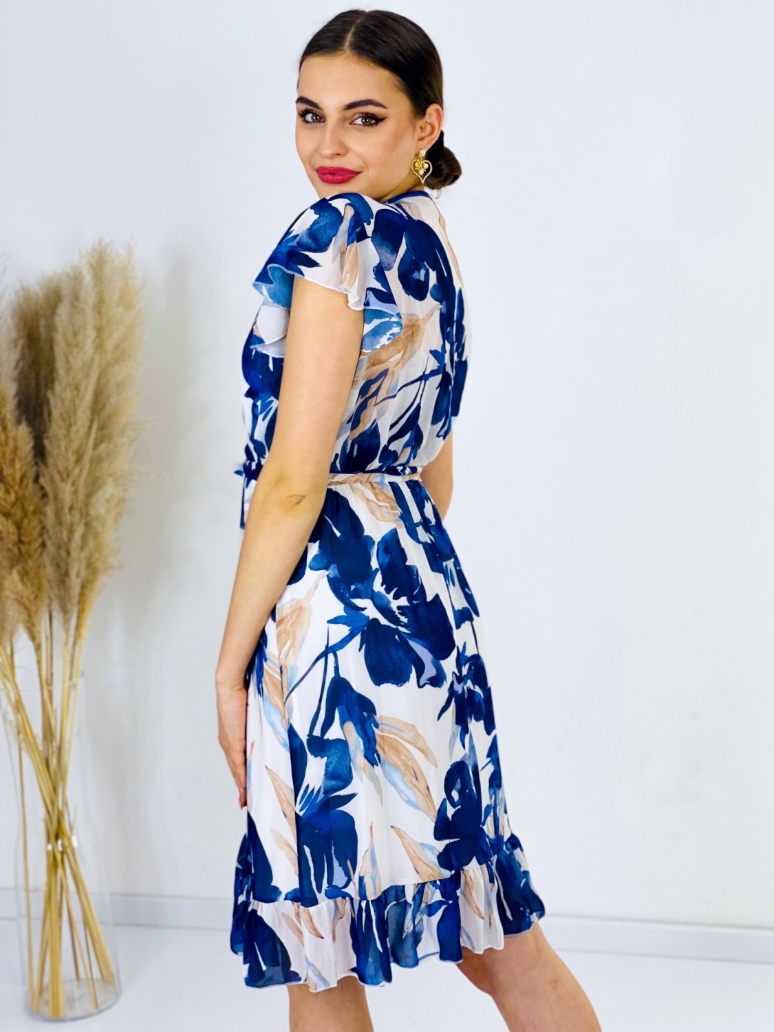 Dámske krátke šaty s kvetovanou potlačou a gumičkou v páse. Šaty sú vyrobené z príjemného a padavého materiálu. Tento model využijete napríklad aj na oslavy, ale aj na dlhé, letné, večerné prechádzky. Využijete ich na akúkoľvek príležitosť. Šaty sú bez zapínania a sú doplnené opaskom vo farbe šiat. Vďaka opasku si šaty rýchlo prispôsobite podľa seba. Prispôsobia sa viacerým typom postáv a veľkostiam od XS po L. Pôsobia pôvabne a sviežo. Modelka je vysoká 175 cm a má oblečenú veľkosť UNI.