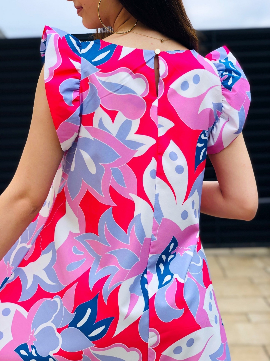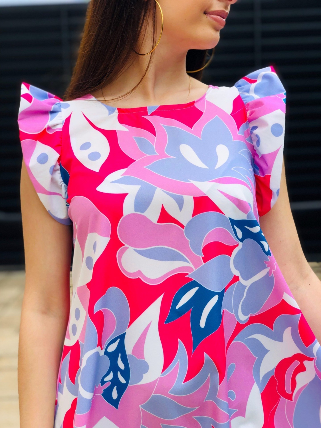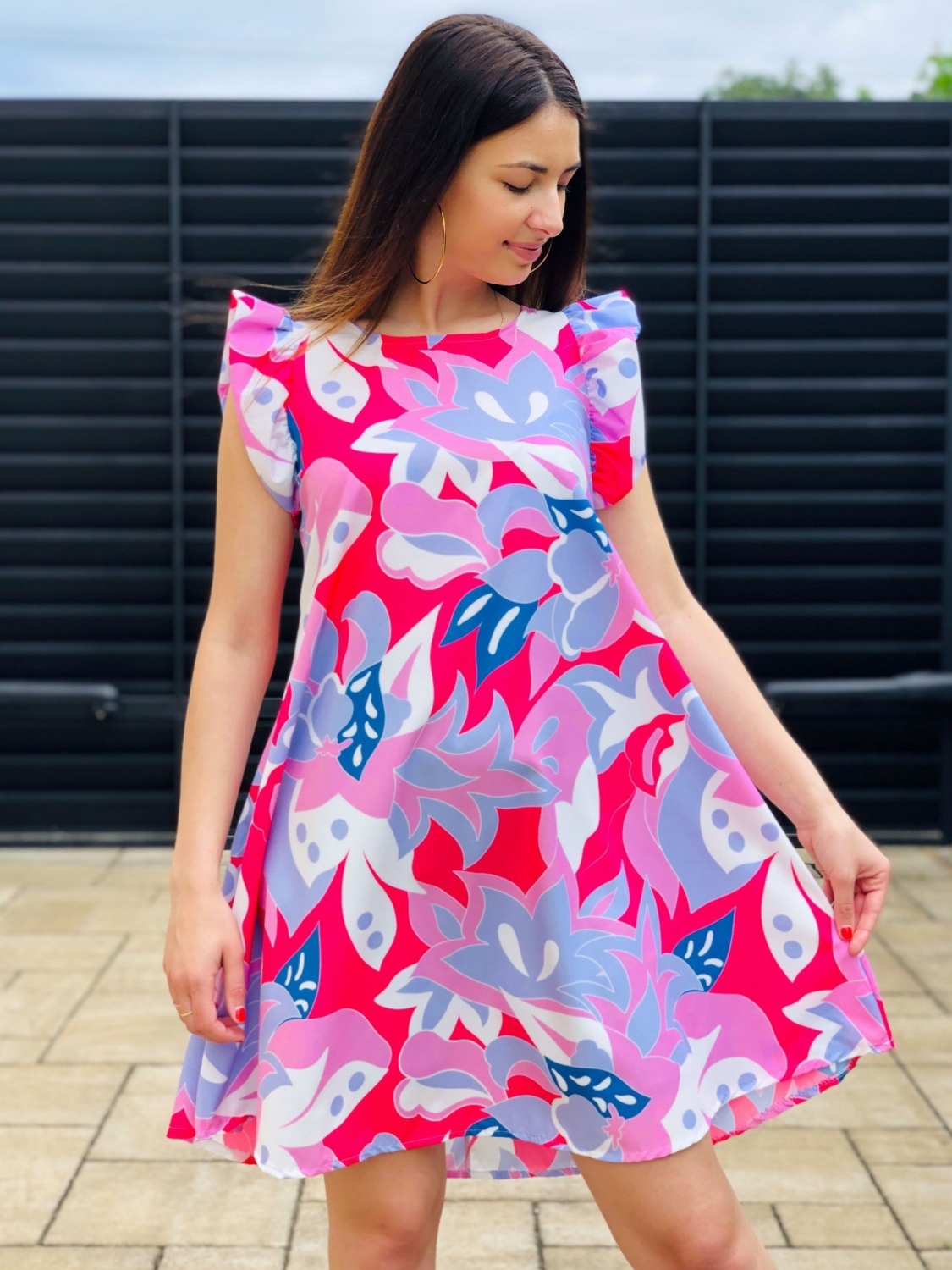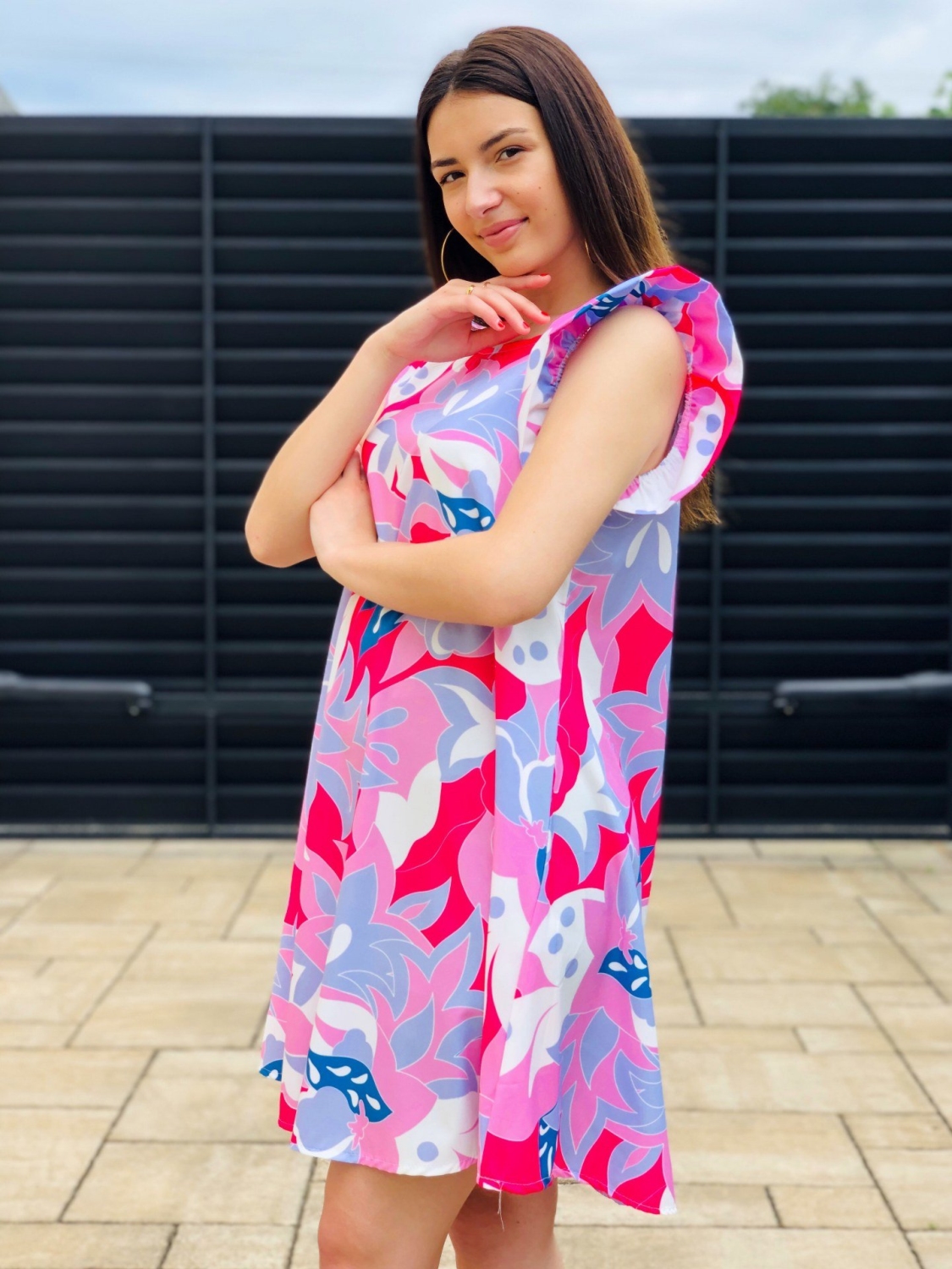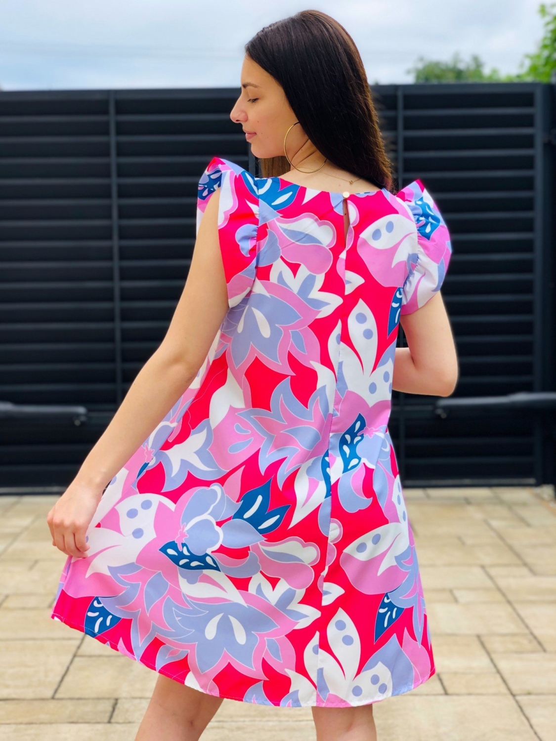 Vkusné elegantné krátke šaty s volánovými rukávmi a kvetovaným vzorom v zaujímavom prevedení s dĺžkou nad kolená. Vzadu zapínanie na gombík. Materiál je príjemný, pohodlný a skvelo padne na postave. Modelka meria 175 cm a má oblečenú veľkosť UNI.