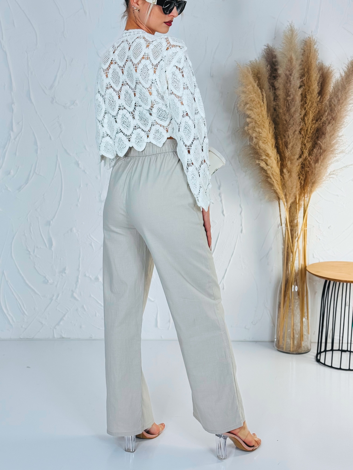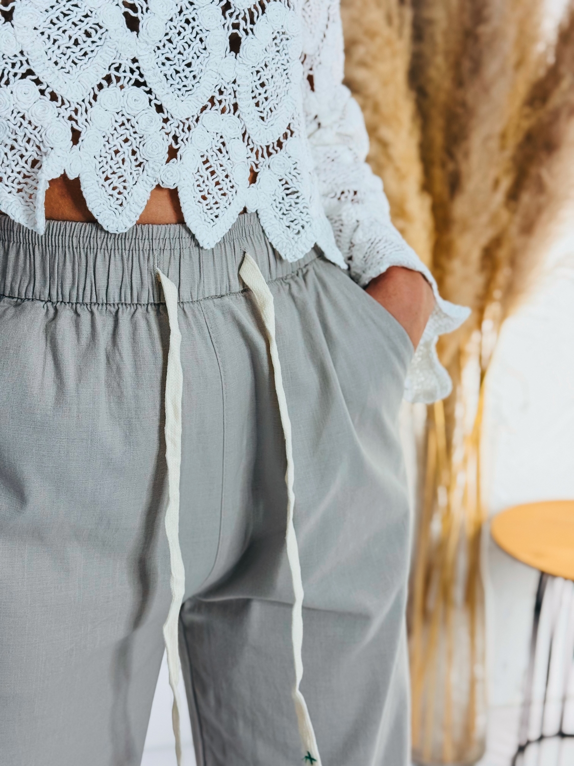 Dámske ľanové nohavice sú ideálnou voľbou pre ženy, ktoré hľadajú spojenie pohodlia, elegancie a nadčasového štýlu. Vyrobené sú z príjemného, ľahkého a priedušného materiálu, ktorý je ideálny najmä na teplejšie dni. Ľan je známy svojou prirodzenou schopnosťou dýchať, takže nohavice poskytujú maximálny komfort počas celého dňa, či už ich nosíte na prechádzku, do práce, na dovolenku alebo na bežné každodenné nosenie. Nohavice majú voľnejší, pohodlný strih, ktorý sa krásne prispôsobí postave a zároveň neobmedzuje v pohybe. Vďaka elastickému pásu sa ľahko obliekajú a perfektne sedia na rôznych typoch postavy. Pás je pružný a prispôsobivý, takže nohavice sú veľmi pohodlné aj pri dlhšom nosení. Tento typ strihu je obľúbený najmä pre svoju univerzálnosť a komfort. Minimalistický a elegantný dizajn umožňuje jednoduché kombinovanie s rôznymi kúskami oblečenia. Nohavice sa skvele hodia k jednoduchému tričku, ľahkej blúzke, topu alebo letnému svetru. Môžete ich nosiť s teniskami, sandálmi aj elegantnejšou obuvou, takže vytvoríte rôzne štýly – od ležérneho až po elegantnejší outfit.