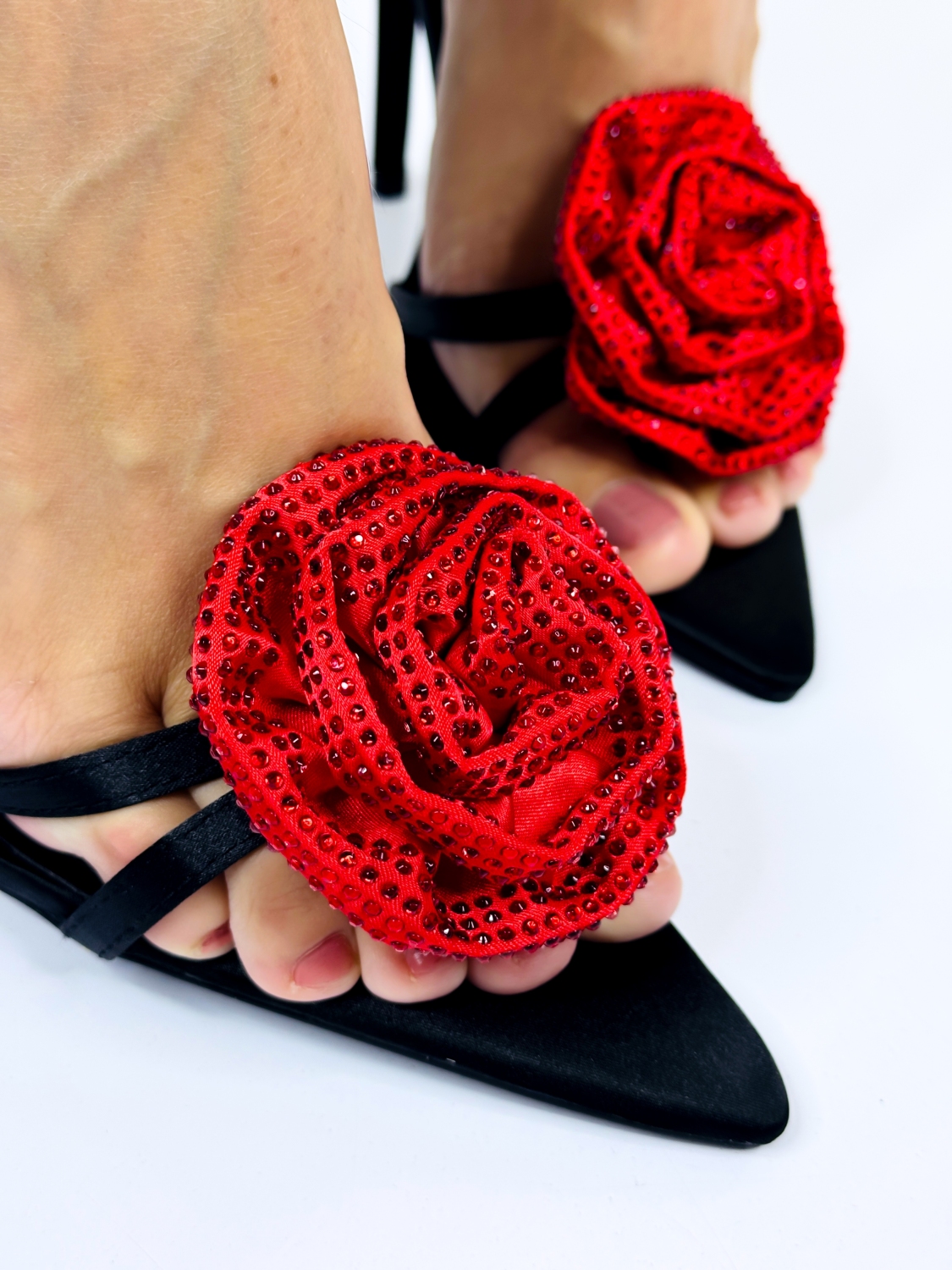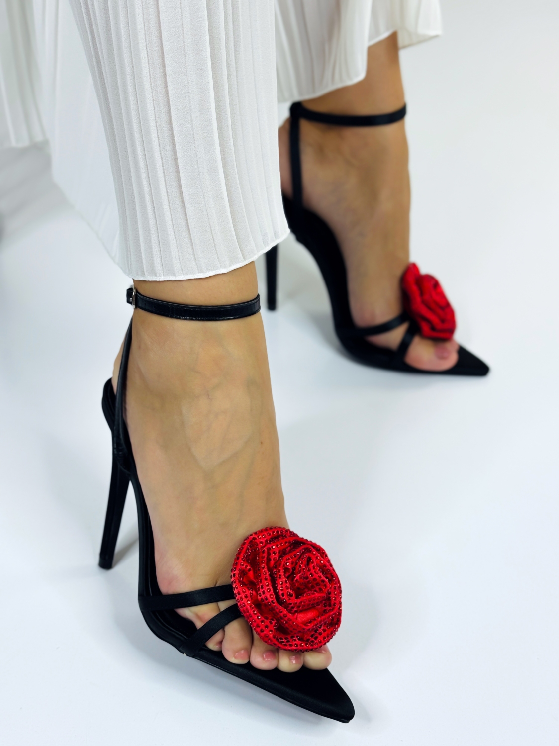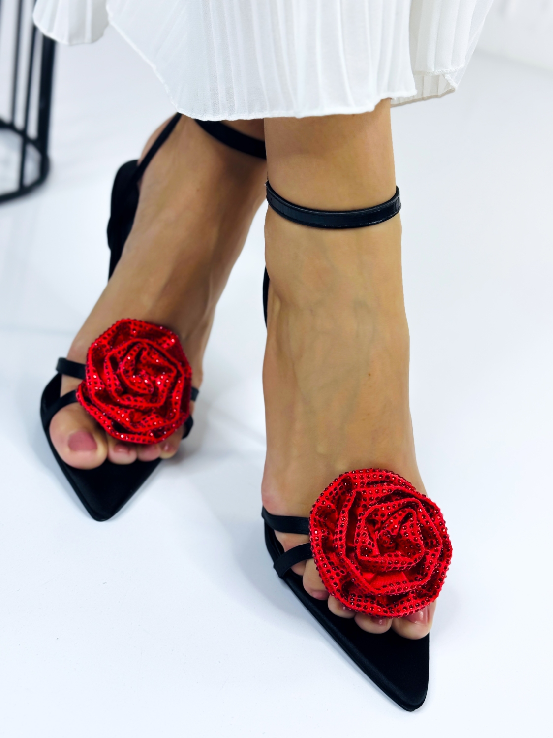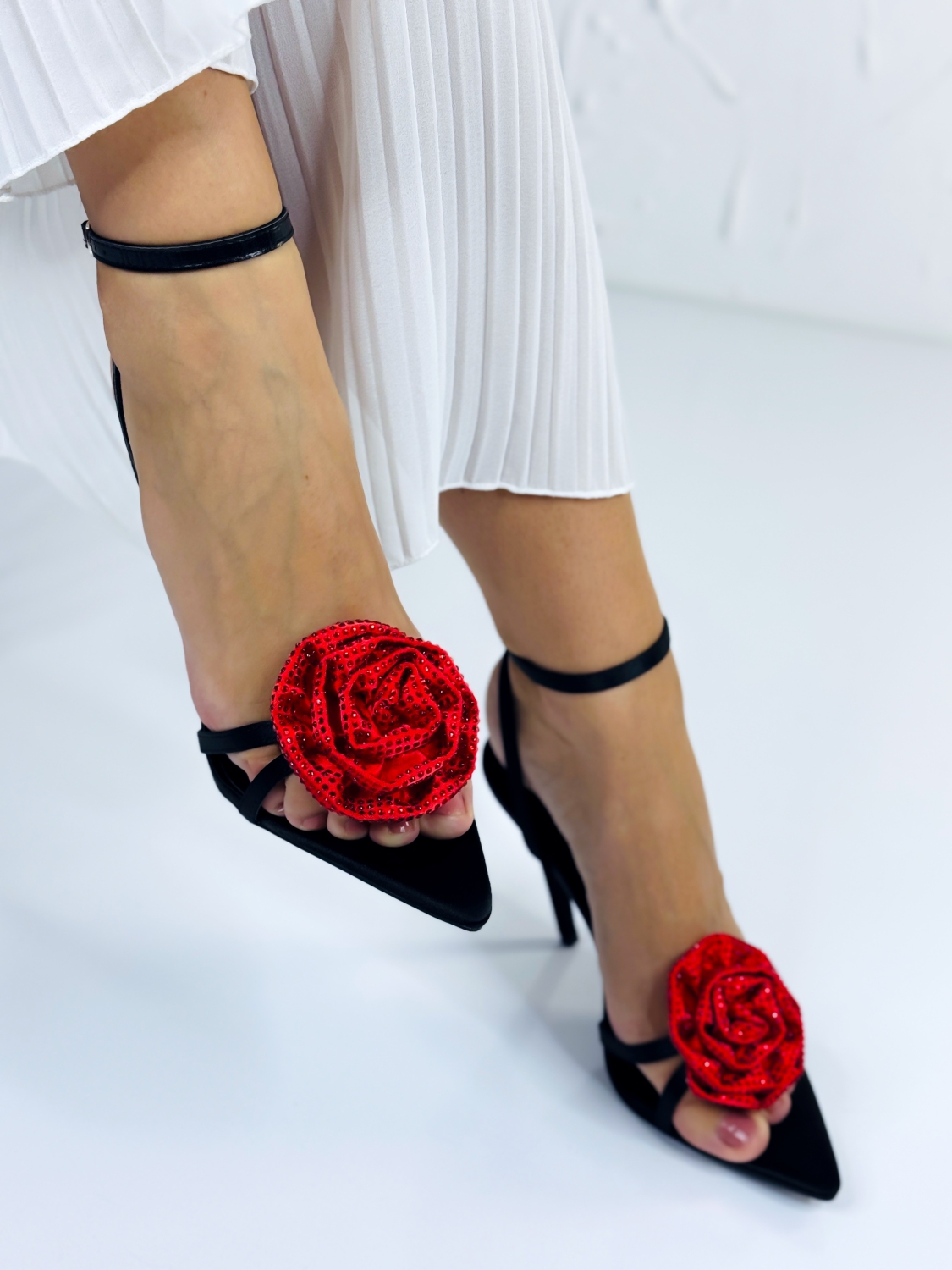 Zvýraznite svoju ženskosť a eleganciu s týmito nádhernými čiernymi sandálmi, ktoré na prvý pohľad upútajú pozornosť dekoratívnou červenou ružou umiestnenou vpredu. Tento originálny detail dodáva topánkam výnimočný, romantický a zároveň zmyselný nádych – ideálny pre ženy, ktoré milujú výnimočné doplnky a dokonalý štýl. Sandále sú vyrobené z kvalitného materiálu s jemným leskom, ktorý pôsobí luxusne a elegantne. Čierny základ dodáva modelu nadčasovosť a ľahkú kombinovateľnosť – skvele ladí s červenou, zlatou, béžovou aj bielou farbou. Červená ruža v prednej časti pôsobí ako šperk, ktorý z obyčajného outfitu vytvorí módny statement. Majú pohodlný opätok. Remienkové zapínanie okolo členka zabezpečuje dokonalé prispôsobenie a stabilitu pri chôdzi, pričom opticky predlžuje nohy.