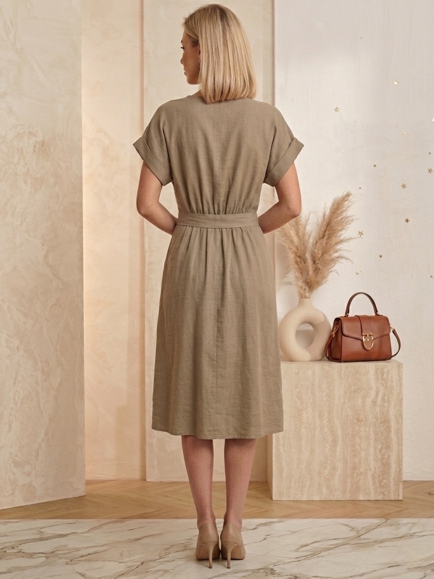 Dámske midi letné šaty s opaskom a ozdobnými gombíkmi v zlatej farbe predstavujú elegantný a zároveň praktický kúsok vhodný na každodenné nosenie aj menej formálne spoločenské príležitosti. Ich strih je navrhnutý tak, aby lichotil postave, pričom zvýrazňuje pás pomocou opasku a vytvára vyváženú siluetu. Midi dĺžka pôsobí decentne a nadčasovo, siaha približne do polovice lýtok a je ideálna pre rôzne typy postáv. Krátky rukáv zabezpečuje pohodlie počas teplých dní a zároveň dodáva šatám upravený vzhľad vhodný napríklad do práce, na stretnutia alebo bežné denné nosenie. Zlaté gombíky predstavujú jemný, ale výrazný detail, ktorý dodáva šatám nádych elegancie a originality. V kombinácii s opaskom vytvárajú harmonický celok, ktorý pôsobí žensky a sofistikovane bez zbytočnej výraznosti. Šaty sa zapínajú spravidla v prednej časti, čo zvyšuje ich praktickosť a zároveň umožňuje jednoduché obliekanie. Materiál je ľahký, príjemný na dotyk a vhodný na letné obdobie.