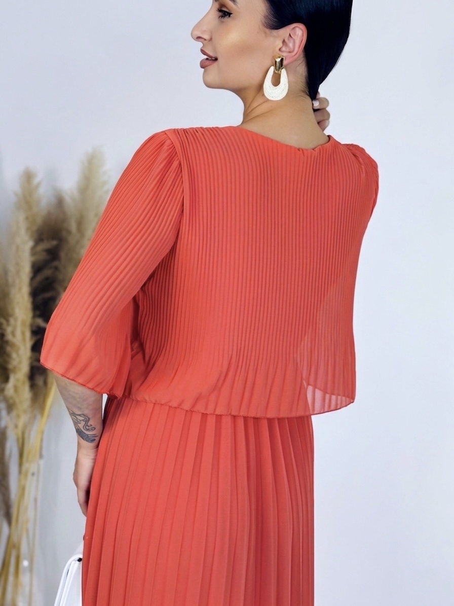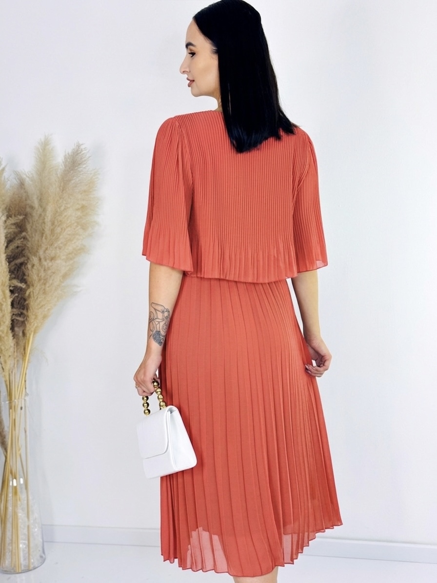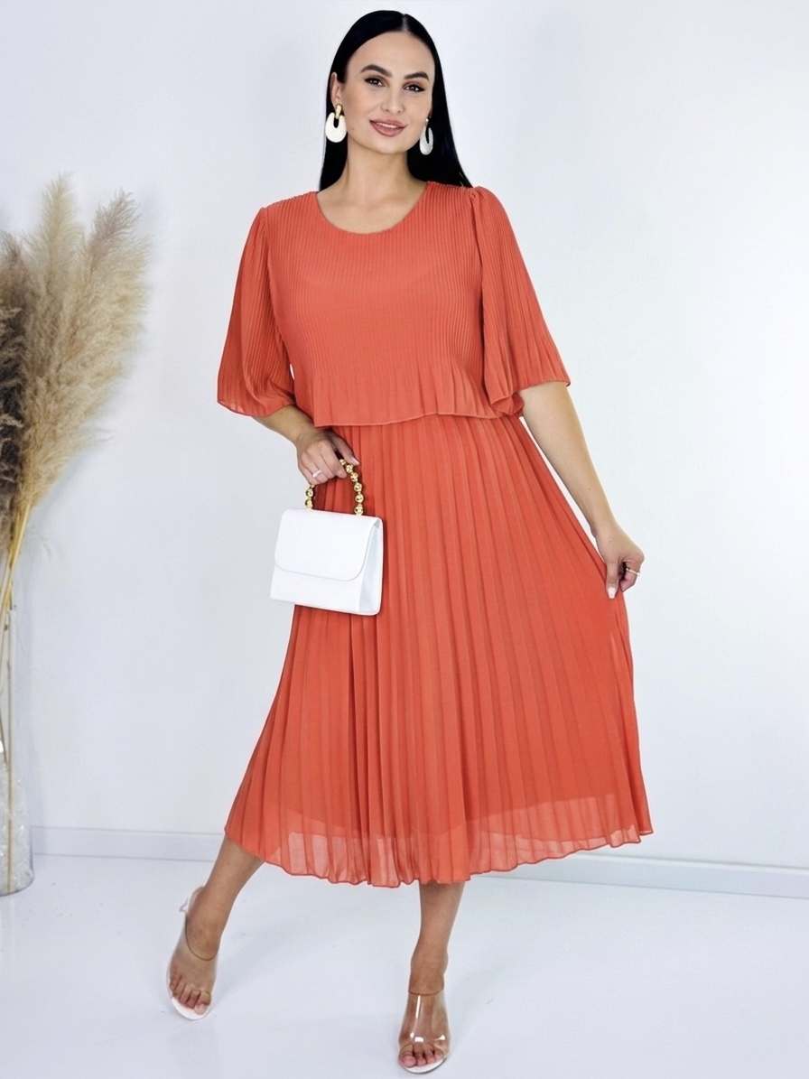 Dámske plisované šaty v midi dĺžke predstavujú ideálnu kombináciu elegancie a pohodlia, vďaka čomu sú vhodné na rôzne príležitosti – od každodenného nosenia až po slávnostné udalosti. Šaty sú navrhnuté s dôrazom na jemnú ženskosť a sofistikovaný štýl, pričom plisovaná látka vytvára pôsobivý vizuálny efekt, ktorý pôsobí ľahko a vzdušne. Vďaka midi dĺžke, ktorá končí približne pod kolenami, šaty elegantne zdôrazňujú postavu a umožňujú voľný pohyb bez obmedzení. Model je navrhnutý bez zapínania, takže sa jednoducho oblieka cez hlavu a zachováva hladký, nenarušený vzhľad, ktorý ladí s minimalistickým, moderným dizajnom. Jemný strih zabezpečuje pohodlné nosenie, zatiaľ čo plisovanie pridáva šatám šmrnc a dynamiku pri každom pohybe. Tieto šaty sú ideálne pre ženy, ktoré chcú kombinovať komfort a štýl. Hodia sa na formálne stretnutia, pracovné udalosti, večerné prechádzky alebo rodinné oslavy. Vďaka univerzálnemu dizajnu je možné ich skombinovať s rôznymi doplnkami – elegantnými lodičkami, sandálmi, kabelkou alebo jemným opaskom, ktorý zvýrazní pás. Materiál šiat je jemný na dotyk, ľahko sa udržiava a zabezpečuje priedušnosť počas celého dňa. Ich nadčasový štýl zaručuje, že budú stálo elegantnou súčasťou vášho šatníka, ktorú môžete nosiť sezónu po sezóne. Plisovanie dodáva šatám štruktúru a pohyb, ktorý pôsobí luxusne, no zároveň nenútene.
