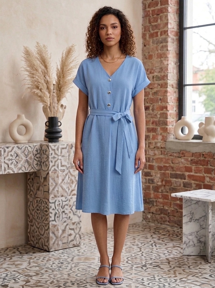 Dámske midi letné šaty s opaskom a ozdobnými gombíkmi v zlatej farbe predstavujú elegantný a zároveň praktický kúsok vhodný na každodenné nosenie aj menej formálne spoločenské príležitosti. Ich strih je navrhnutý tak, aby lichotil postave, pričom zvýrazňuje pás pomocou opasku a vytvára vyváženú siluetu. Midi dĺžka pôsobí decentne a nadčasovo, siaha približne do polovice lýtok a je ideálna pre rôzne typy postáv. Krátky rukáv zabezpečuje pohodlie počas teplých dní a zároveň dodáva šatám upravený vzhľad vhodný napríklad do práce, na stretnutia alebo bežné denné nosenie. Zlaté gombíky predstavujú jemný, ale výrazný detail, ktorý dodáva šatám nádych elegancie a originality. V kombinácii s opaskom vytvárajú harmonický celok, ktorý pôsobí žensky a sofistikovane bez zbytočnej výraznosti. Šaty sa zapínajú spravidla v prednej časti, čo zvyšuje ich praktickosť a zároveň umožňuje jednoduché obliekanie. Materiál je ľahký, príjemný na dotyk a vhodný na letné obdobie.