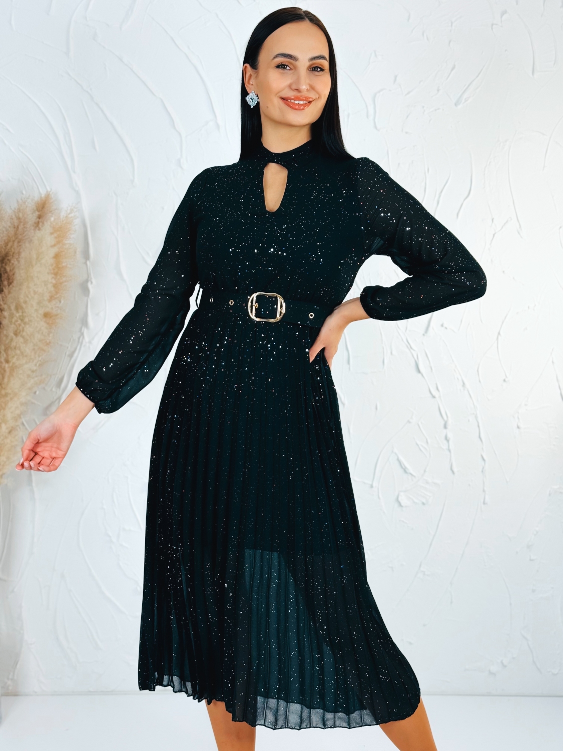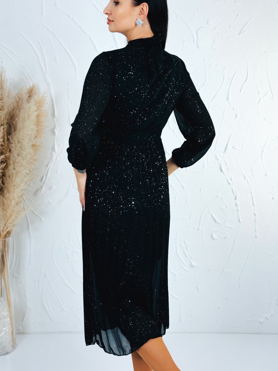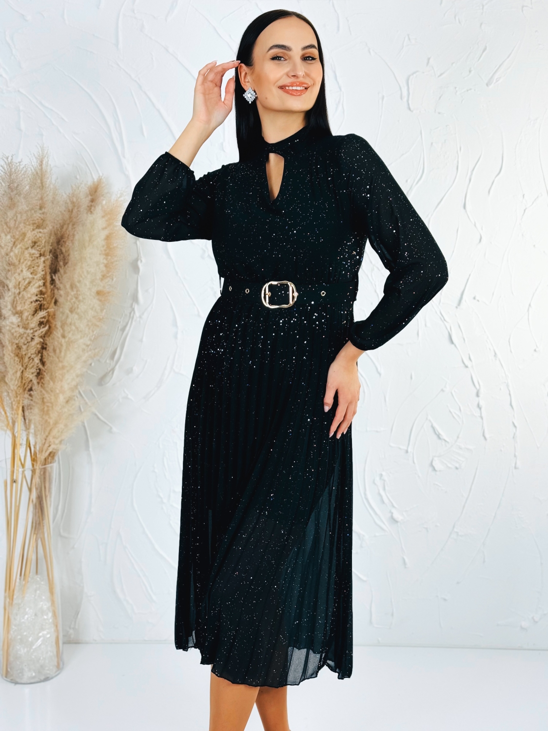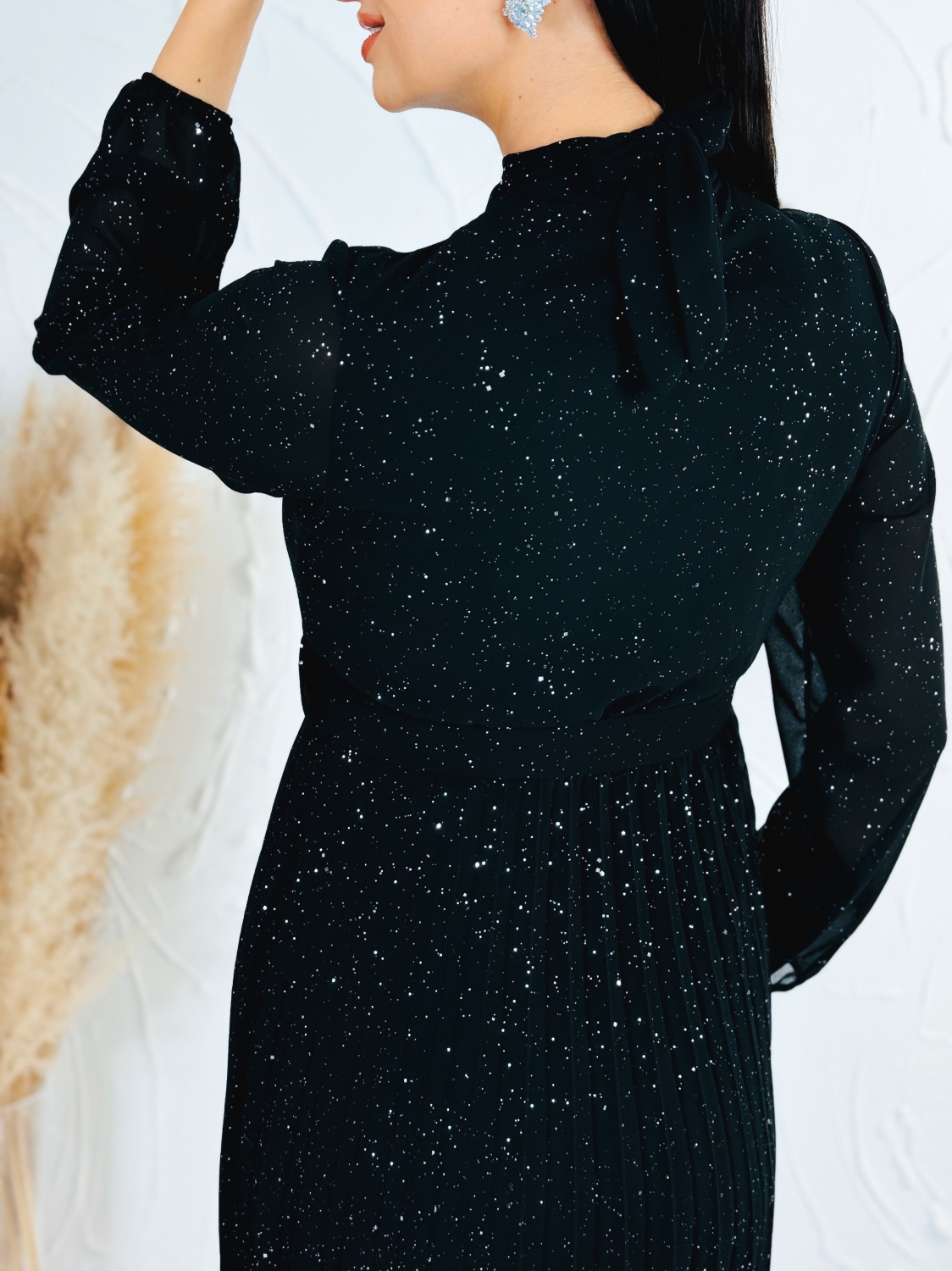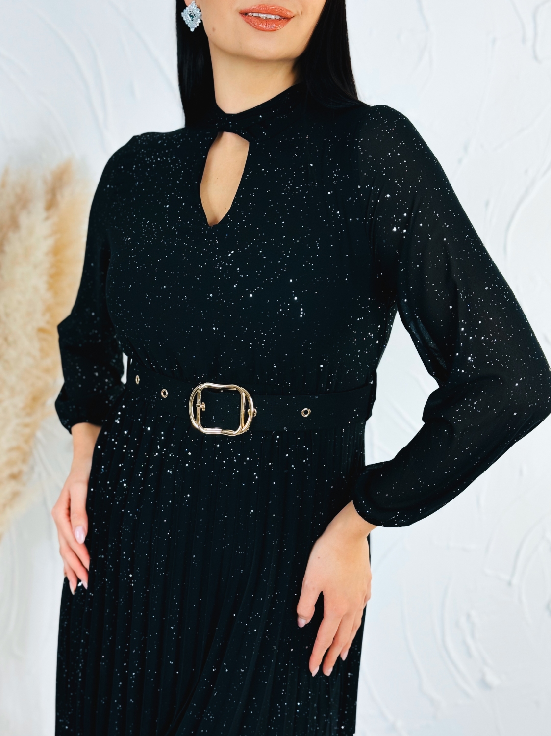Dámske trblietavé midi šaty Elora sú stelesnením elegancie, ženskosti a jemného luxusu. Už na prvý pohľad zaujmú ich nežným trblietavým efektom, ktorý vytvára dojem hviezdnej oblohy. Šaty kombinujú sofistikovaný štýl s moderným dizajnom – sú ideálne pre ženy, ktoré chcú pôsobiť noblesne, ale zároveň moderne a neprehliadnuteľne. Horná časť šiat je jemne voľná, s dlhými rukávmi a elegantným viazaním pri krku, ktoré dopĺňa decentný kvapkový výstrih. Táto kombinácia pôsobí veľmi žensky a opticky predlžuje postavu. V páse sa nachádza výrazný opasok so zlatou prackou, ktorý krásne zvýrazní pás a dodá celému outfitu luxusný akcent. Spodná časť je plisovaná – čo šatám dodáva ľahkosť, pohyb a nesmierne elegantný vzhľad pri každom kroku. Midi dĺžka je ideálna pre spoločenské udalosti, pretože pôsobí decentne, štýlovo a nadčasovo. Šaty Elora sú perfektnou voľbou na silvestrovské oslavy, vianočné večierky, rodinné oslavy, svadby hostí, firemné podujatia, romantické večere či akékoľvek elegantné udalosti.