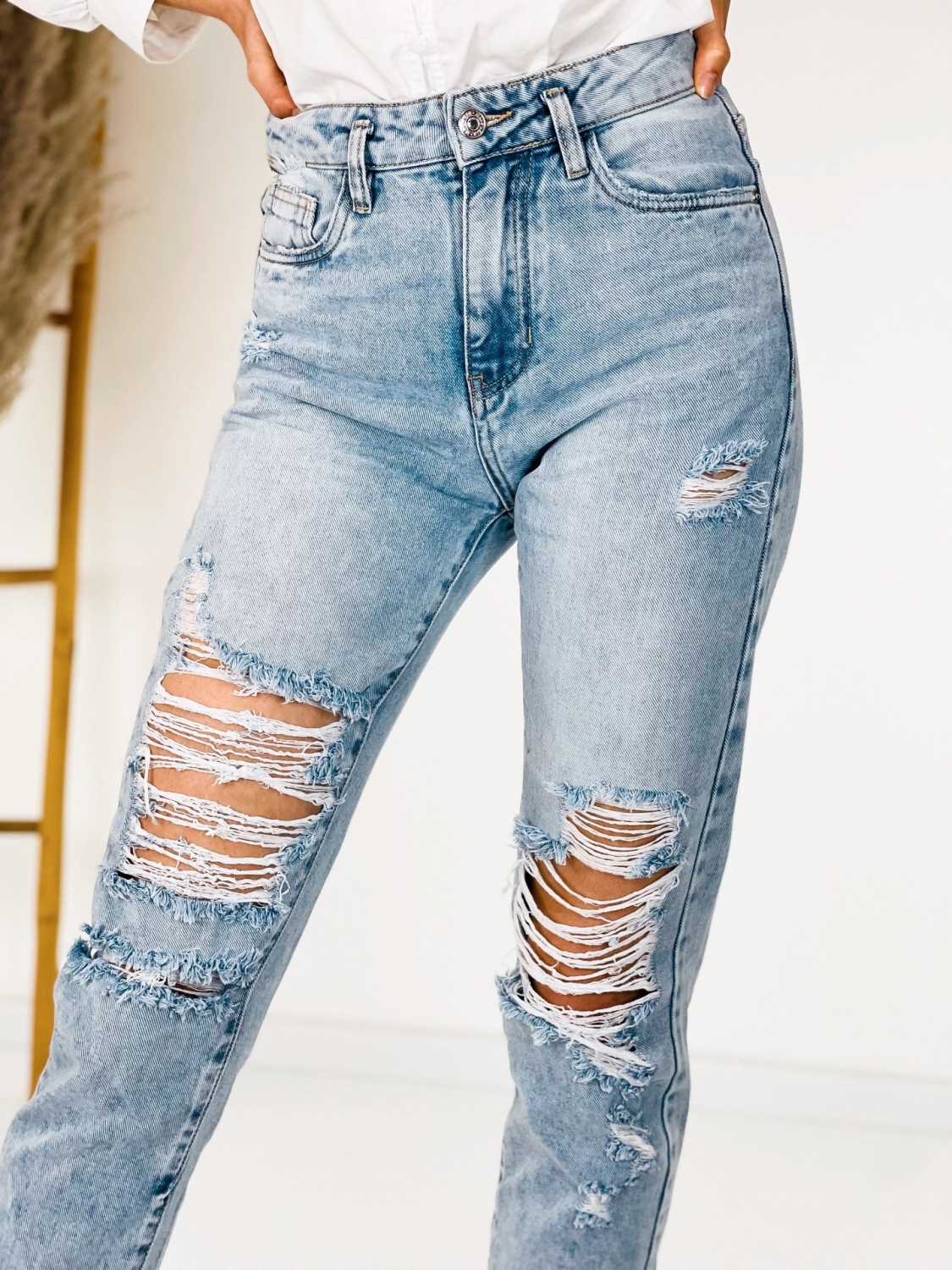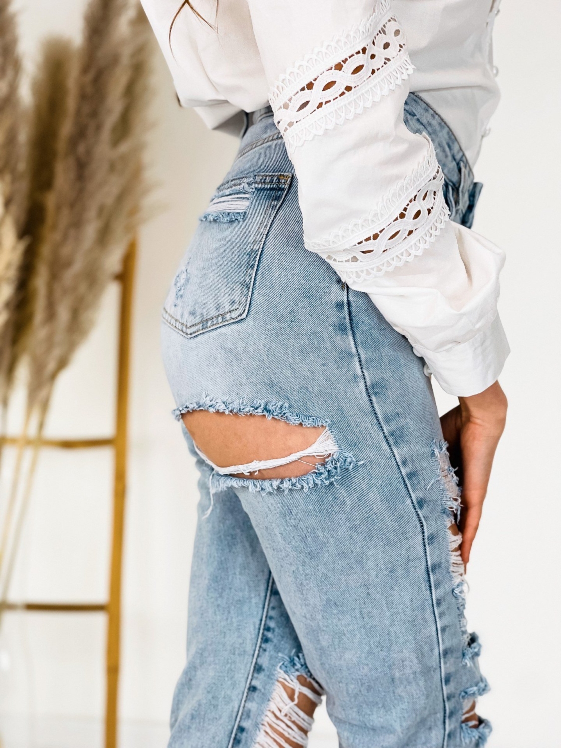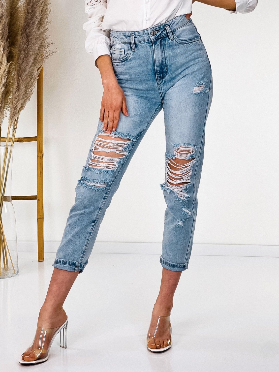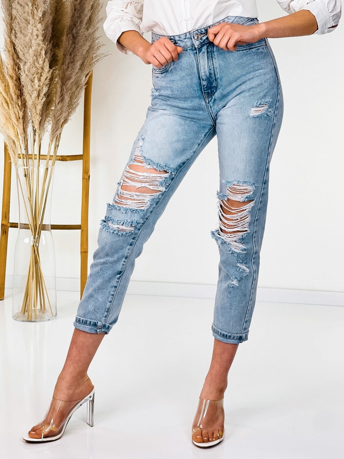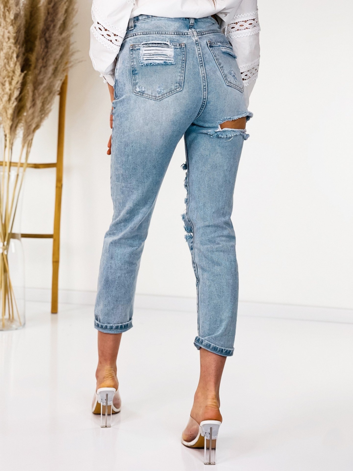 Dámske boyfriend rifle vo veľmi modernom prevedení. Jeansy majú modrú farbu. Vyrobené z kvalitnej rifľoviny a z pevného materiálu. Budete sa v nich cítiť pohodlne a príjemne. Na prednej a zadnej časti má vrecká a pevný pás. Zapínanie vpredu na gombík. Môžete ich kombinovať s hocijakým topom alebo blúzkou. Rifle, ktoré by nemali chýbať v žiadnom šatníku. Modelka je vysoká 173 cm a oblečenú veľkosť M.