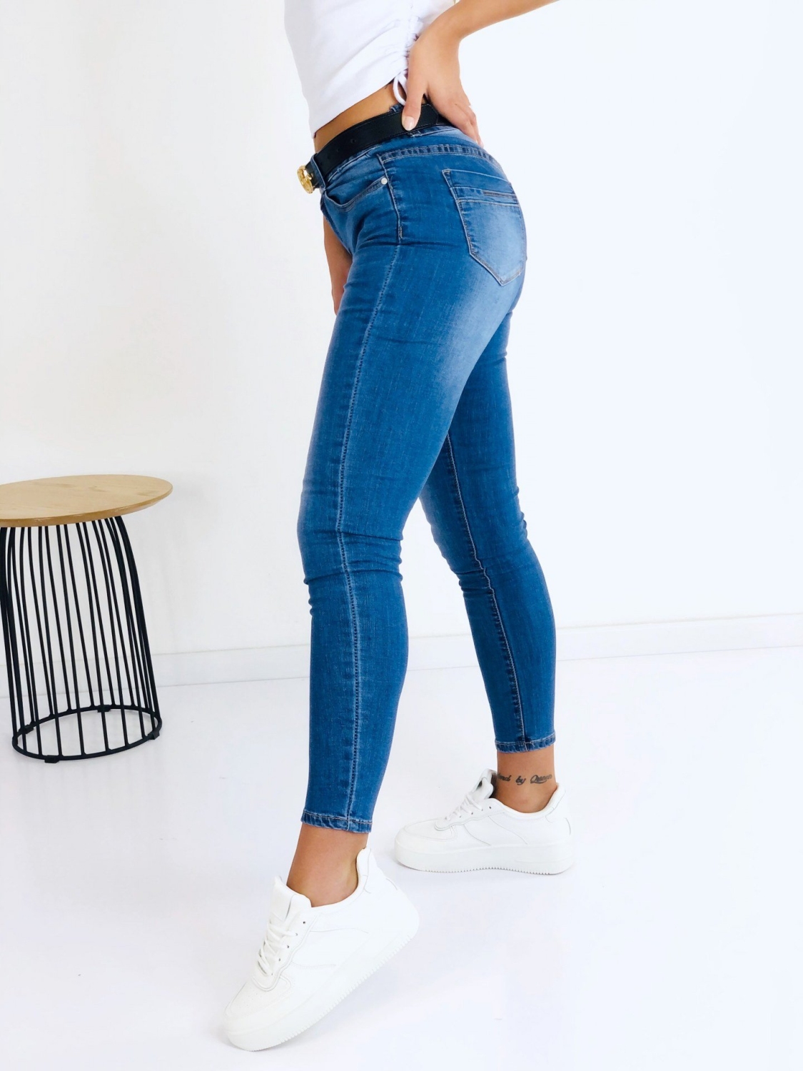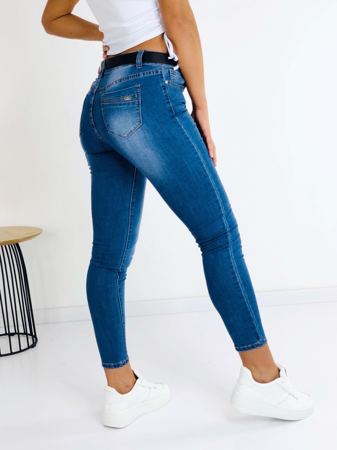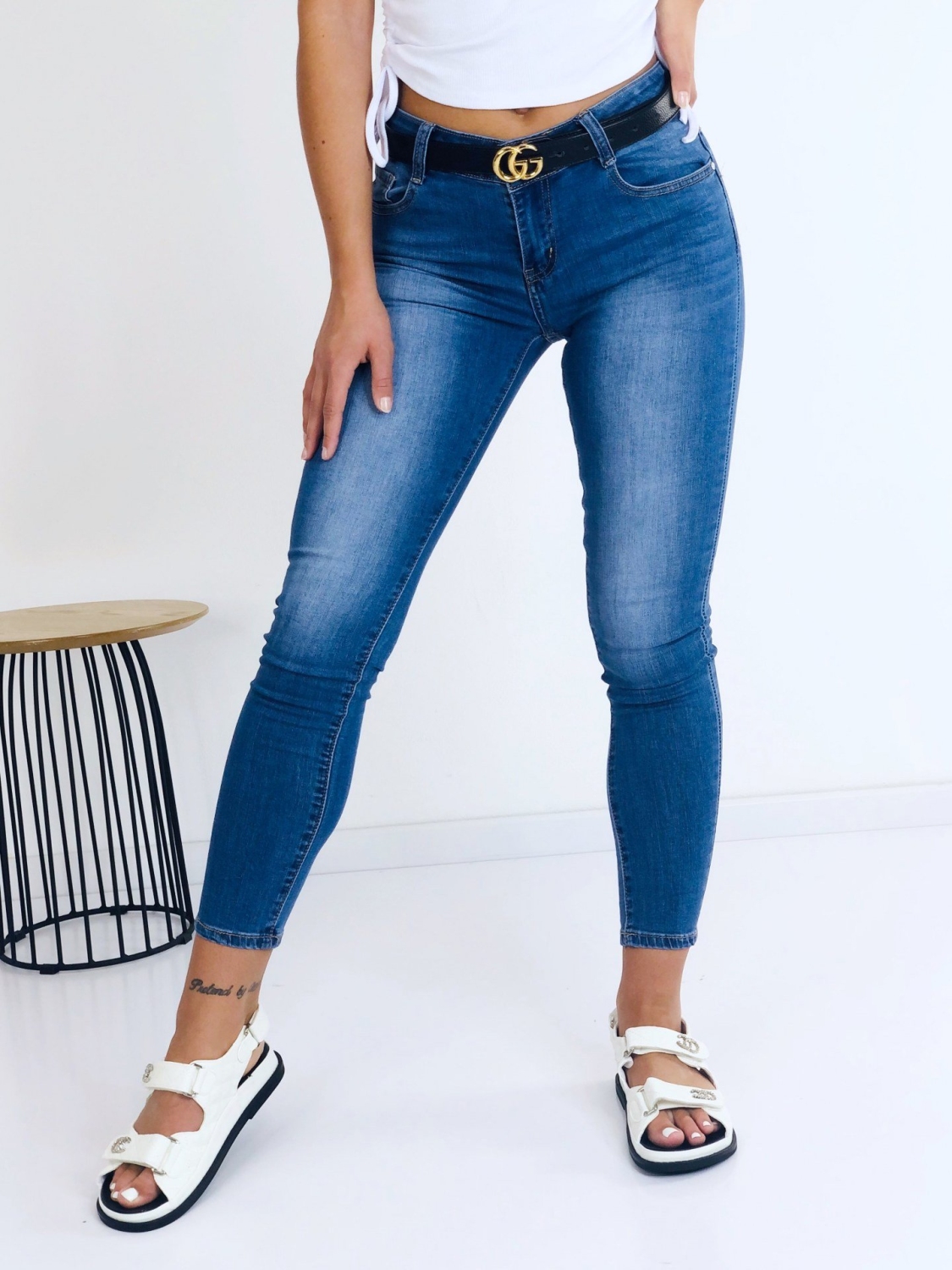 Dámske elastické rifle vo veľmi modernom prevedení. Jeansy majú modrú farbu. Vyrobené z kvalitnej rifľoviny a z elastického materiálu. Budete sa v nich cítiť pohodlne a príjemne. Na prednej a zadnej časti má vrecká a pružný pás. Zapínanie vpredu na gombík. Môžete ich kombinovať s hocijakým topom alebo blúzkou. Rifle, ktoré by nemali chýbať v žiadnom šatníku. Modelka je vysoká 175 cm a oblečenú veľkosť 28 .