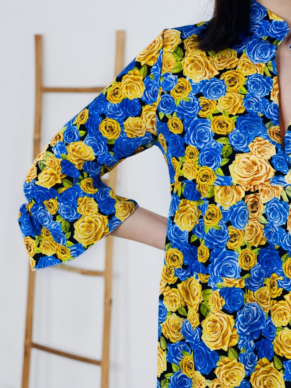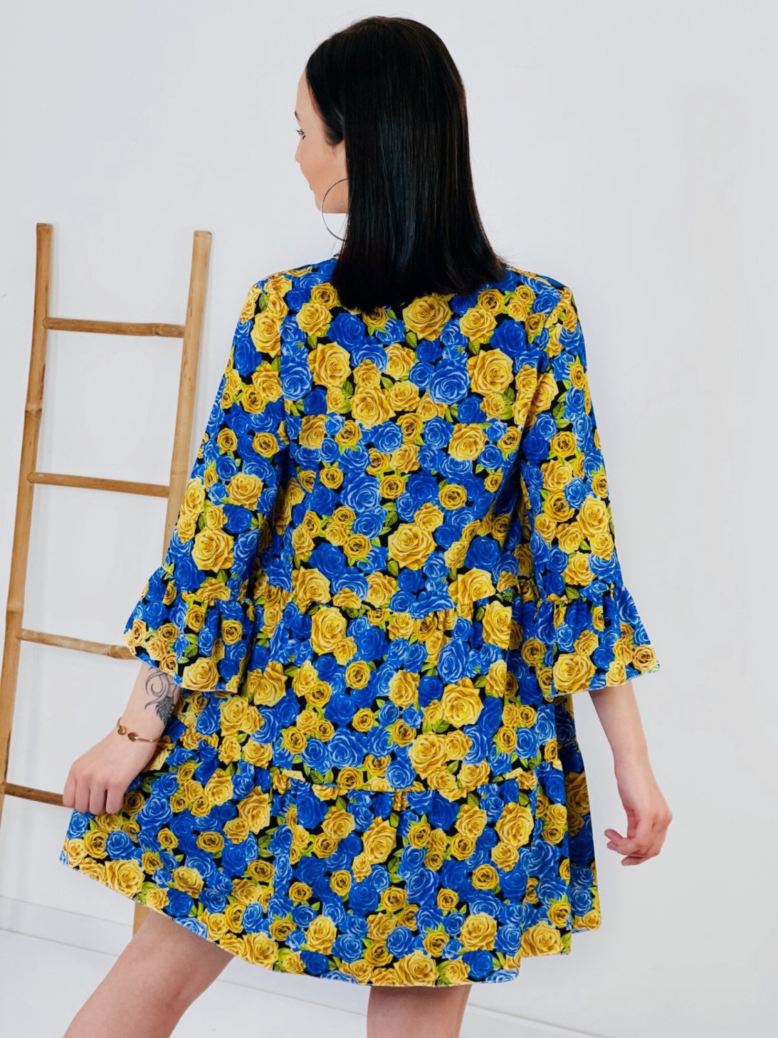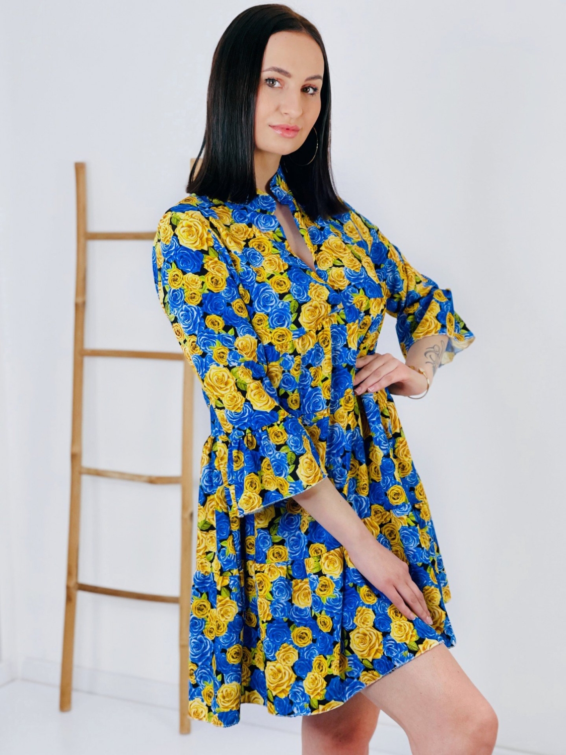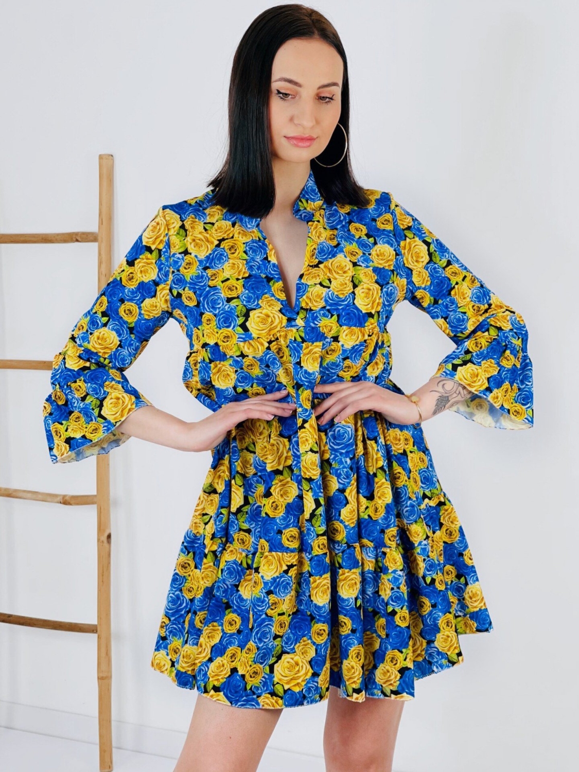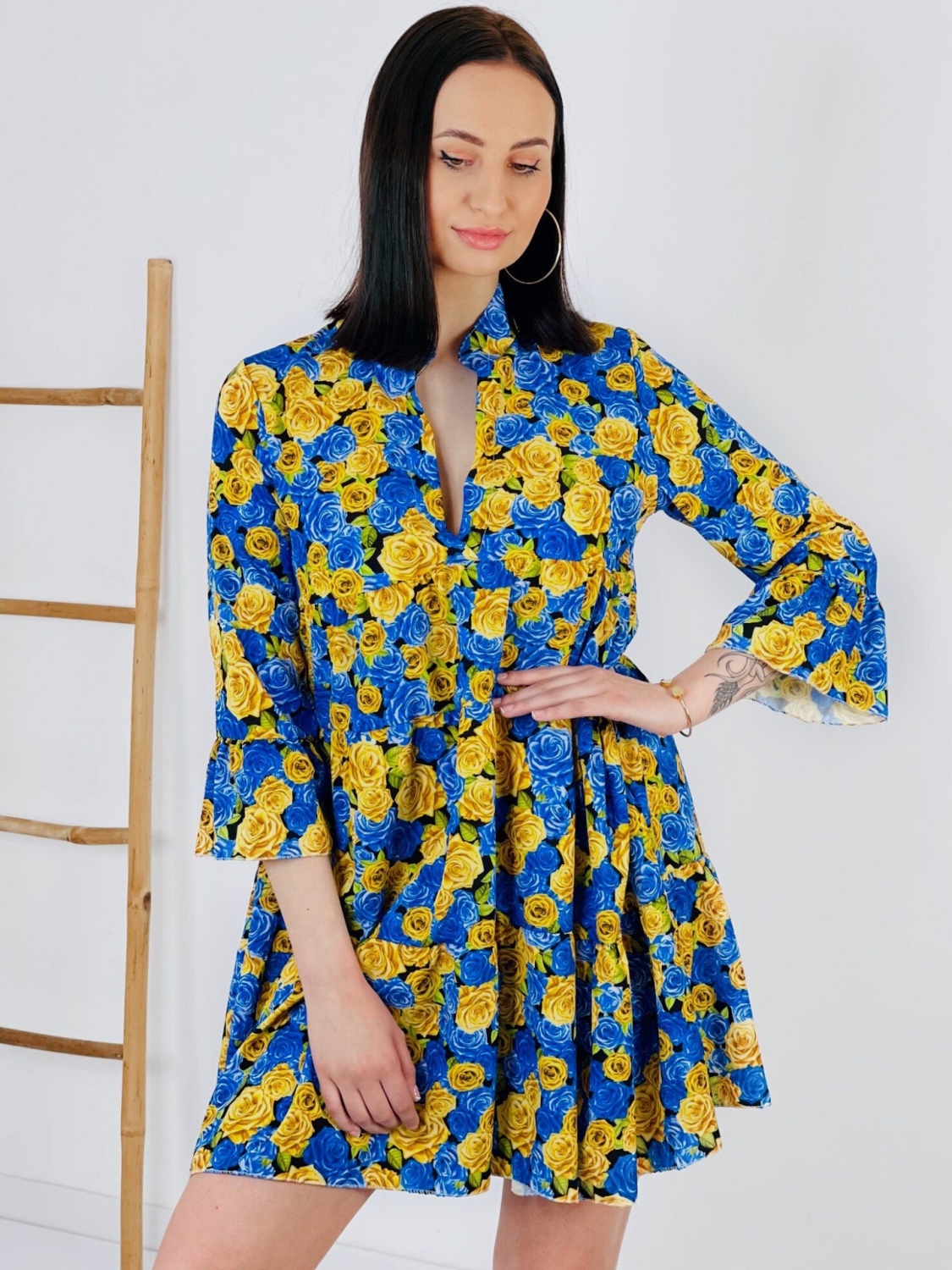 Dámske elegantné šaty v modrej farbe a s kvetovaným vzorom. Áčkový strih. Príjemný a kvalitný materiál je zárukou spokojnosti. Dokonale sa prispôsobia viac veľkostiam. Pôsobia pôvabne, sviežo a príťažlivo. Kvetované šaty sú módnou klasikou sezón jari, leta a už aj jesene. Kvety ženám skrátka pristanú. Šaty, ktoré do outfitu vnesú závan nehy. Modelka je vysoká 175 cm a oblečenú má veľkosť UNI.