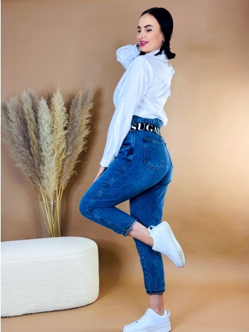 Dámske rifle vo veľmi modernom prevedení a s vysokým pásom. Jeansy majú modrú farbu. Vyrobené z kvalitnej rifľoviny a z mierne elastického materiálu. Budete sa v nich cítiť pohodlne a príjemne. Na prednej a zadnej časti majú vrecká a mierne elastický pás. Zapínanie vpredu na zips a gombíky. Rifle sú doplnené s nápisom SUGAR na zadnej časti. Môžete ich kombinovať s hocijakým topom alebo blúzkou. Rifle, ktoré by nemali chýbať v žiadnom šatníku. Modelka je vysoká 175 cm a oblečenú veľkosť M.
