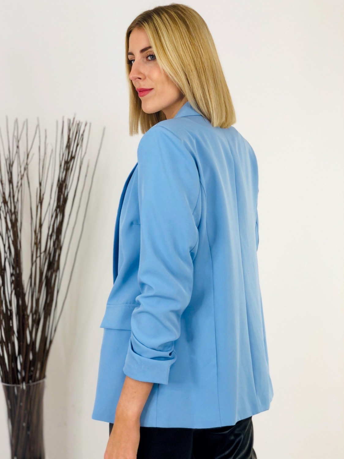 Dámske exkluzívné modré sako, ktoré je v jednoduchom prevedení a bez zapínania. Sako vhodné do práce i na rande do mesta. Zaujímavá je aj štruktúra saka, ktorá Vás dostane. Nadčasové a mimoriadne praktické. Vyrobené z kvalitného a pohodlného materiálu. Vrecká na oboch stranách sú falošné. Dámske sako nemusíte nosiť výlučne k sukni, či elegantným nohaviciam. Môžete k nemu doladiť aj ležérny outfit s teniskami. Modelka je vysoká 175 cm a oblečenú má veľkosť UNI.