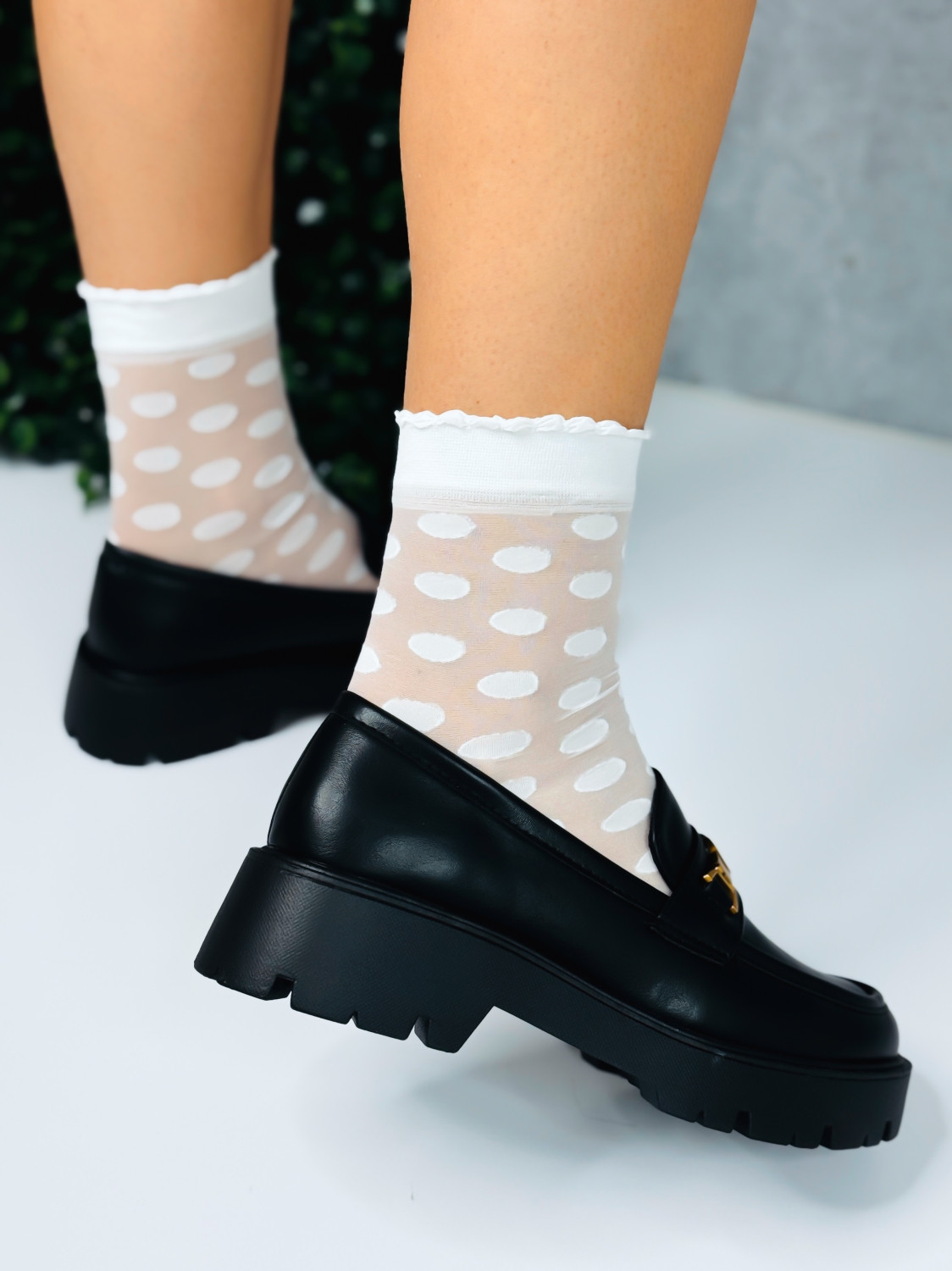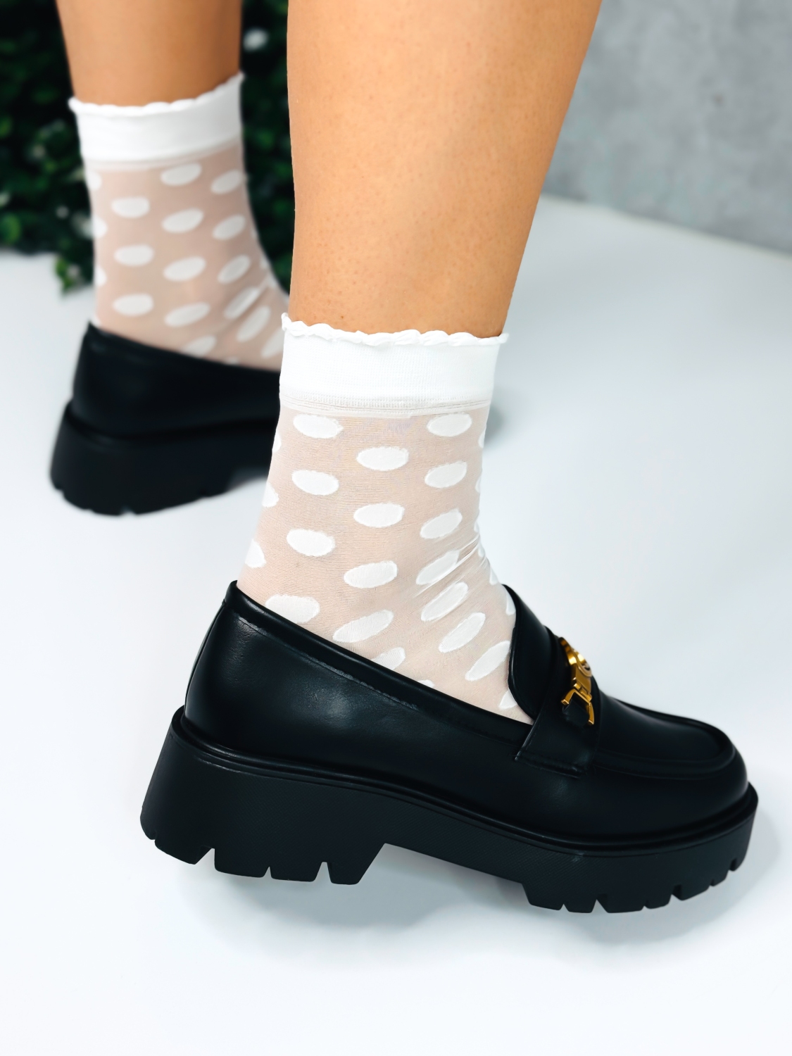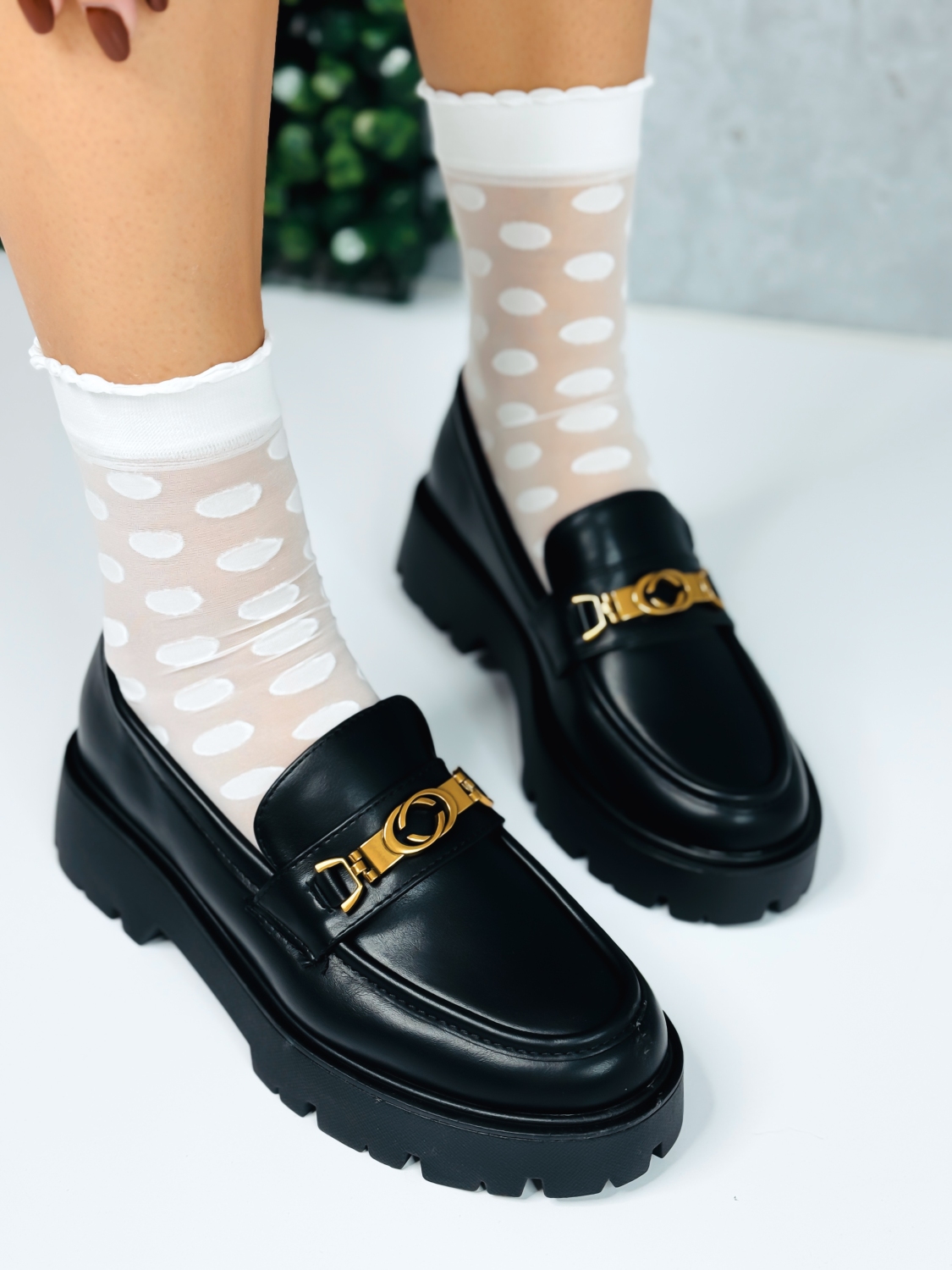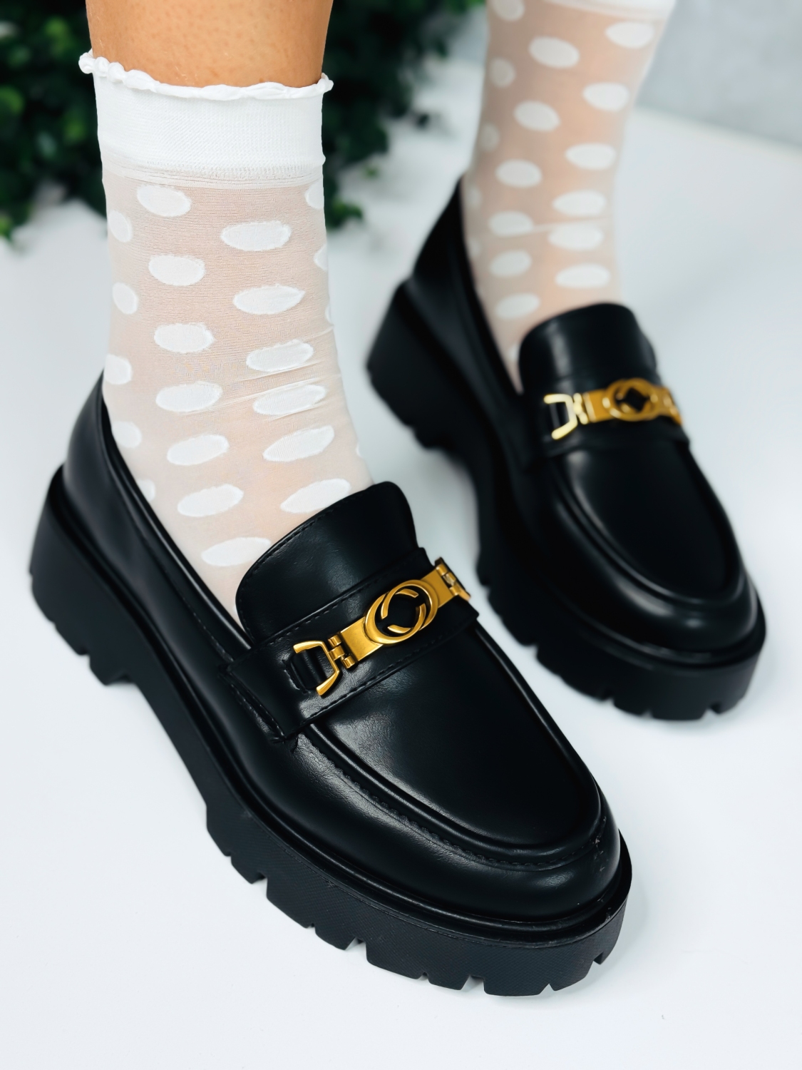 Buďte neprehliadnuteľná s týmto trendy kúskom sezóny! Mokasíny, ktoré poukazujú na pohodlie a originalitu. Čierna farba pôsobí moderne, pričom sa ľahko kombinuje s rôznymi outfitmi – od džínsov, cez šaty až po elegantnejšie nohavice.