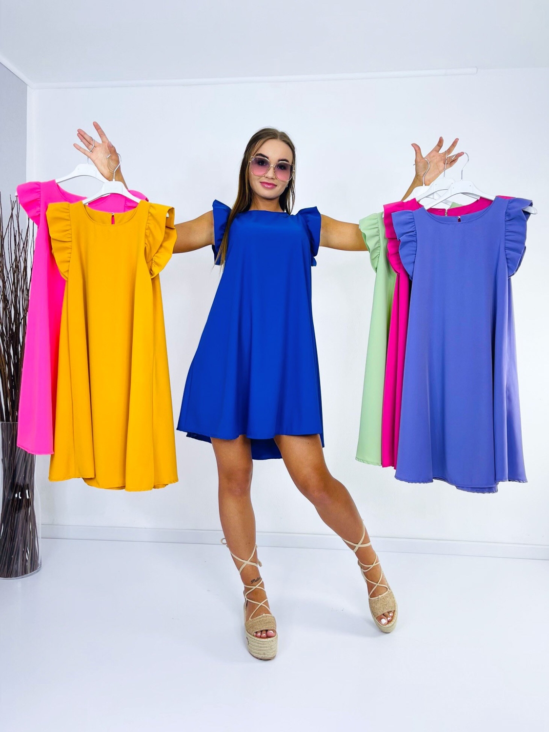 Spoločenské elegantné krátke šaty v neónovo ružovej farbe s volánovými rukávmi v zaujímavom prevedení s dĺžkou nad kolená. Vzadu zapínanie na gombík. Materiál je príjemný, pohodlný a skvelo padne na postave. Modelka meria 175 cm a má oblečenú veľkosť UNI.