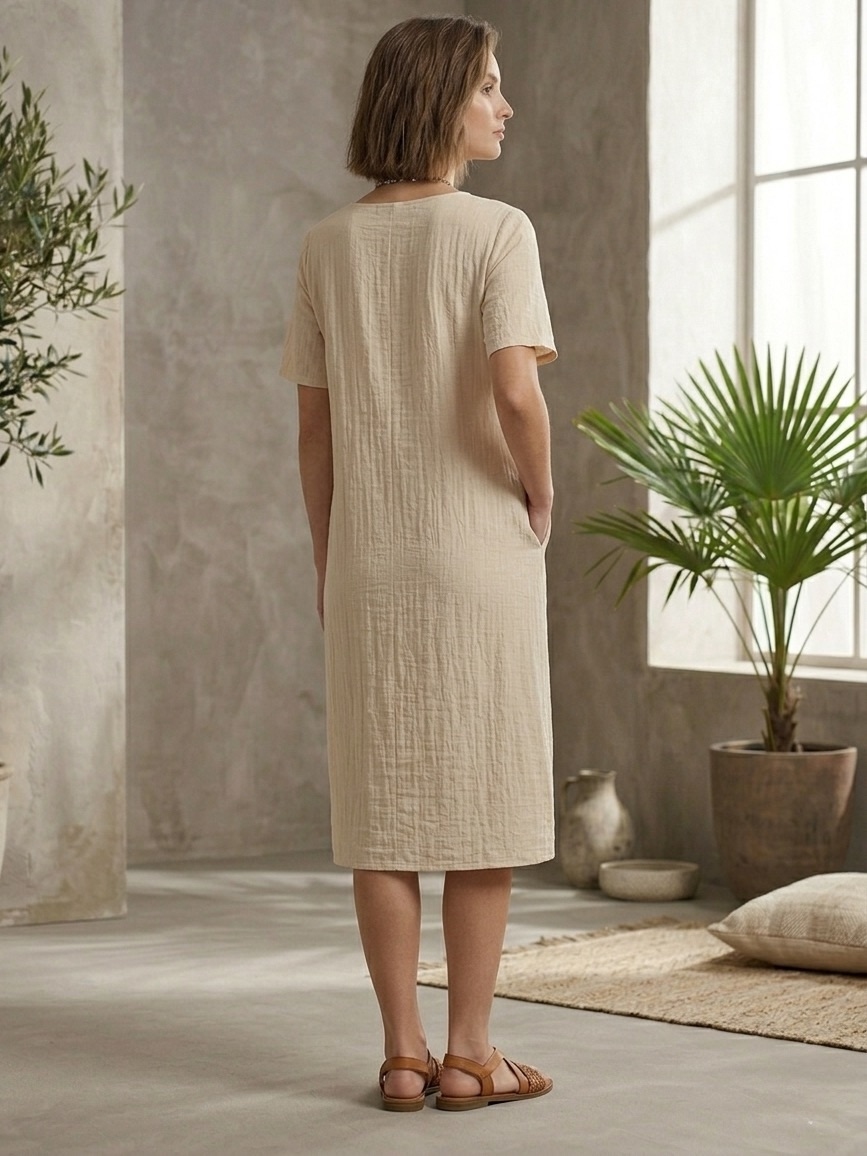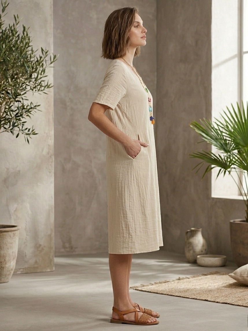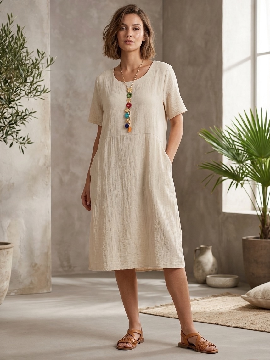 Dámske oversize letné šaty s vreckami vpredu sú ideálnou voľbou pre ženy, ktoré hľadajú spojenie maximálneho pohodlia, voľného strihu a štýlového vzhľadu počas teplých dní. Moderný oversize strih krásne padne rôznym typom postavy, poskytuje dostatok voľnosti pohybu a zároveň pôsobí ležérne, žensky a trendy. Vďaka vzdušnému prevedeniu sú šaty vhodné na každodenné nosenie aj počas horúcich letných dní. Praktické predné vrecká dodávajú šatám nielen zaujímavý detail, ale aj funkčnosť, ktorú oceníte pri bežnom nosení. Môžete si do nich odložiť drobnosti alebo jednoducho využiť ich pohodlný dizajn ako štýlový prvok. Voľnejší strih jemne splýva po postave, neobopína telo a zabezpečuje príjemný pocit počas celého dňa. Súčasťou šiat je farebný náhrdelník, ktorý krásne dopĺňa celkový vzhľad a dodáva modelu originalitu. Vďaka tomuto módnemu doplnku získate kompletný outfit bez potreby ďalšieho kombinovania.
