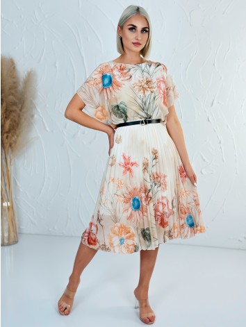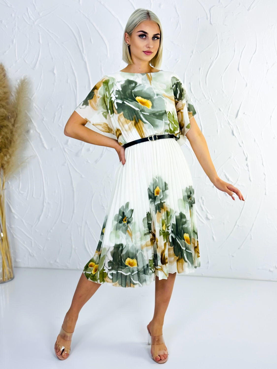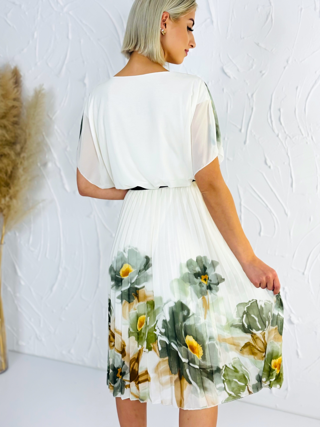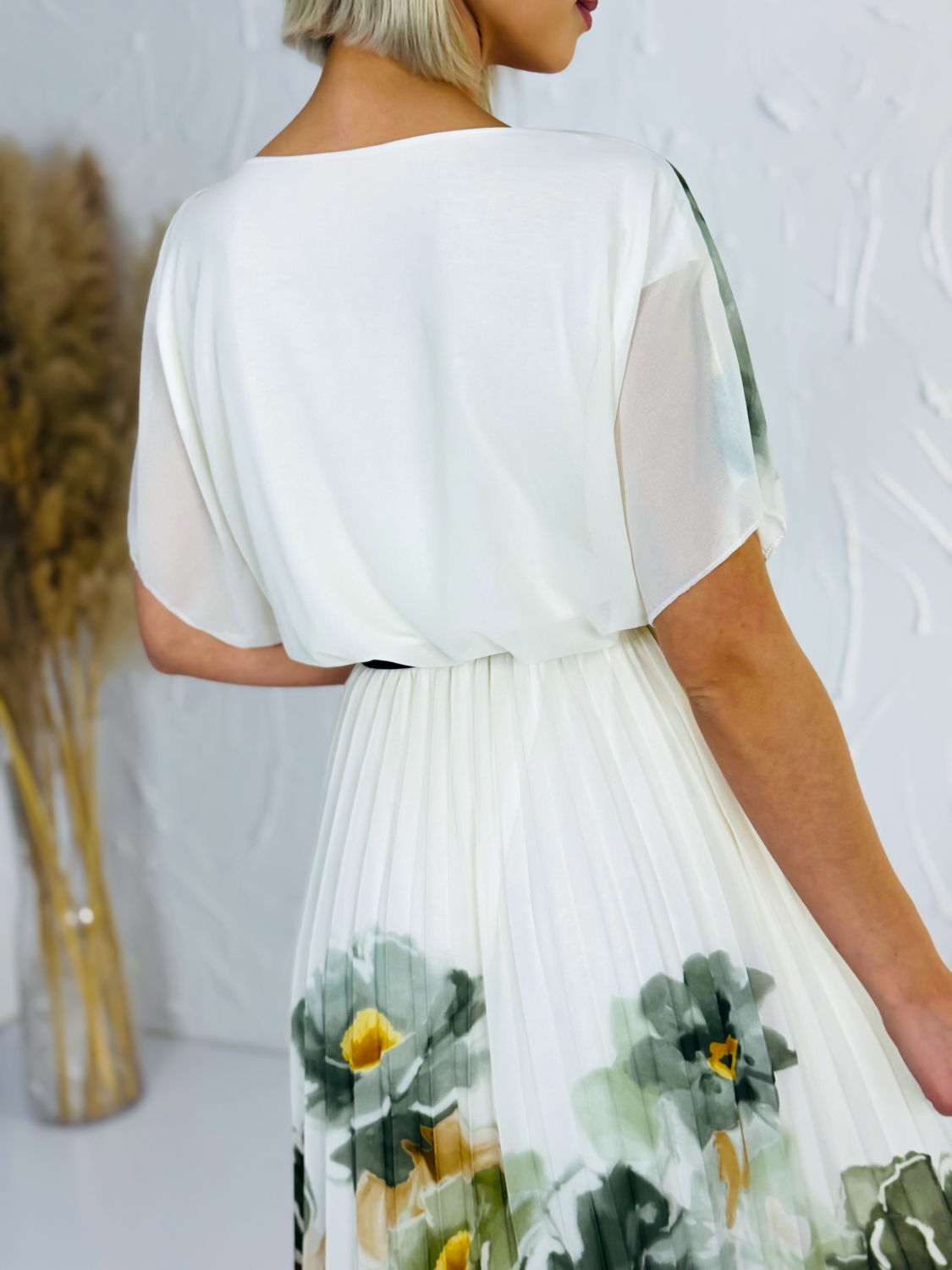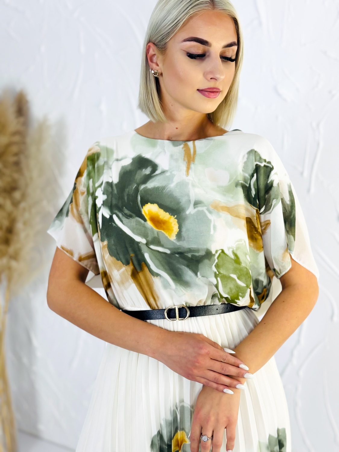 Tieto elegantné šaty s jemným kvetinovým vzorom sú dokonalou voľbou pre ženy, ktoré chcú spojiť pohodlie s nadčasovou eleganciou. Ľahký a vzdušný materiál pôsobí veľmi príjemne na tele, krásne splýva a pri pohybe vytvára jemný, ženský efekt. Vrchná časť šiat má voľnejší strih, ktorý lichotí postave a zároveň poskytuje maximálne pohodlie počas celého dňa. Krátke rukávy dodávajú modelu ležérny nádych, zatiaľ čo spodná plisovaná časť pôsobí elegantne a dodáva šatám štruktúru a šmrnc. Práve kombinácia voľného vrchu a jemne nariasenej sukne vytvára veľmi vyvážený a štýlový celok. Kvetinový vzor v prírodných tónoch pôsobí sviežo a zároveň decentne, vďaka čomu sú šaty vhodné na rôzne príležitosti. Využijete ich na bežné nosenie, do práce, na stretnutia aj letné udalosti, kde chcete pôsobiť upravene, no stále prirodzene. Stačí ich doplniť jednoduchými doplnkami, opaskom na zvýraznenie pásu alebo jemnými sandálmi a vytvoríte si outfit, v ktorom sa budete cítiť sebavedomo a pohodlne počas celého dňa.