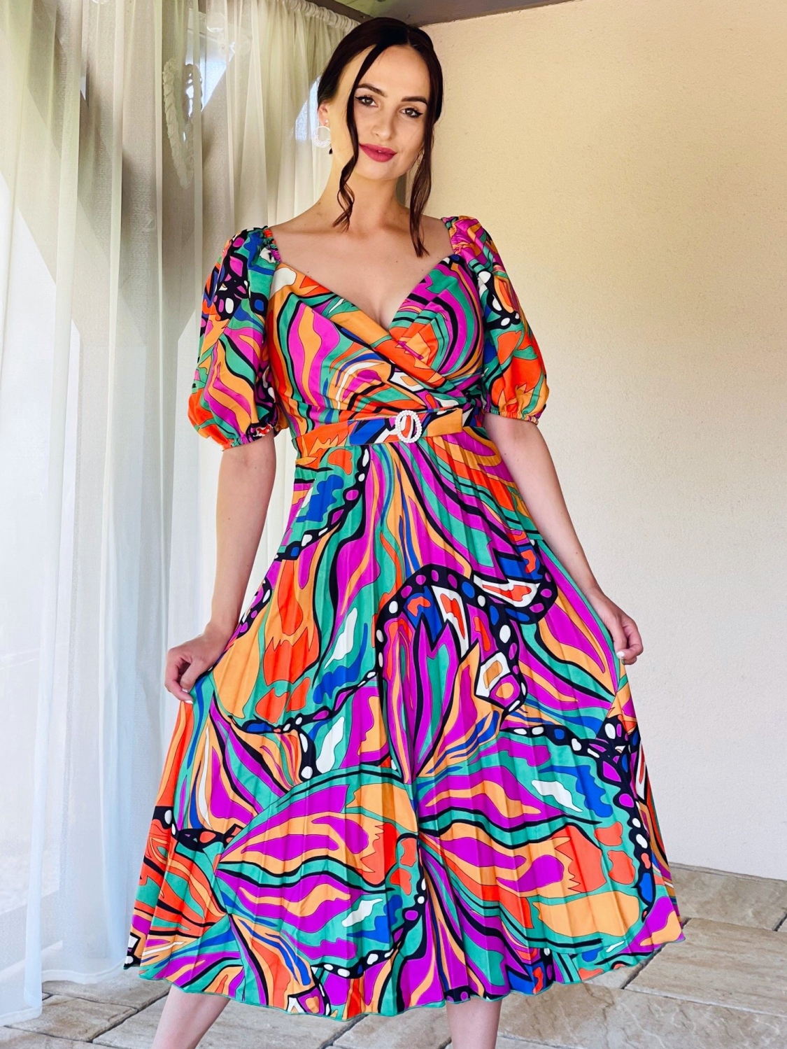 Midi dámske spoločenské šaty pre moletky v mix farbe s volánovými rukávmi a opaskom v ktorých zažiari každá dáma. Veľmi príjemný kúsok z našej ponuky, ktorý očarí každú z Vás a samozrejme aj ostatných okolo Vás. Vhodné sú na rôzne spoločenské udalosti ako je svadba, stužková slávnosť, oslava, či ples. Spoločenské šaty sa zapínajú vzadu na zips. Sú vyrobené z kvalitného materiálu. Materiál je príjemný na dotyk. Málo krčivý. Prsia sú vystužené. Modelka meria 175 cm a má oblečenú veľkosť 38.