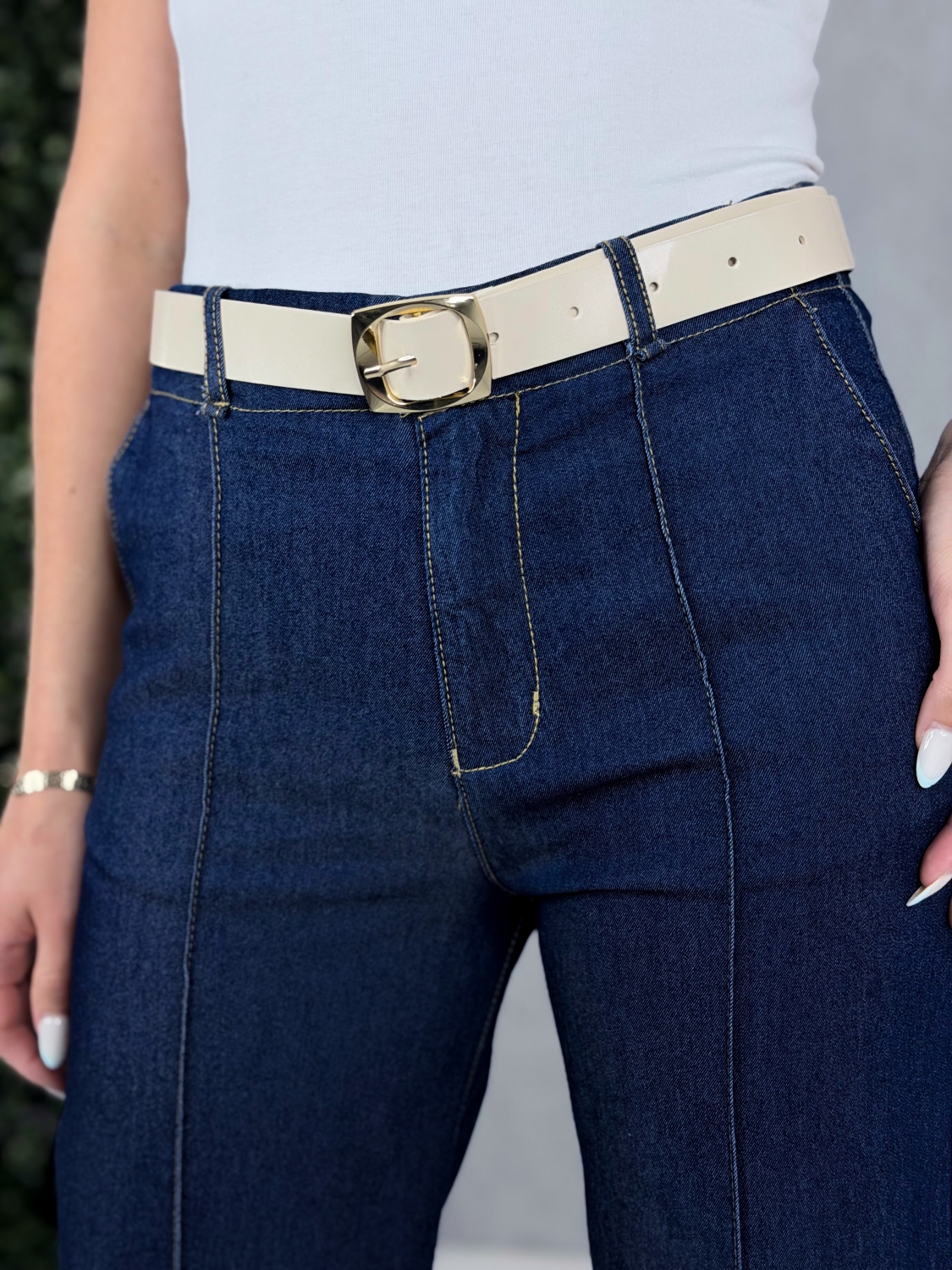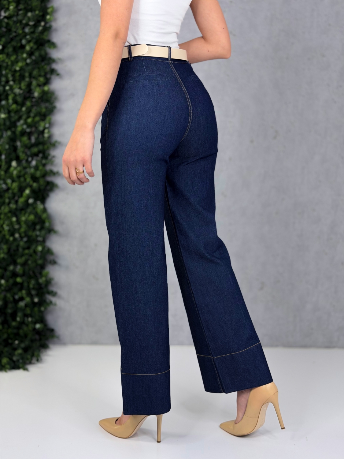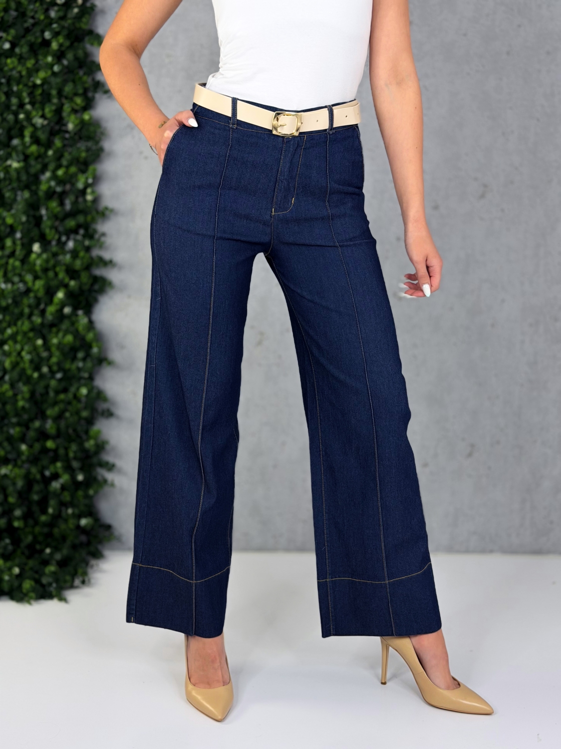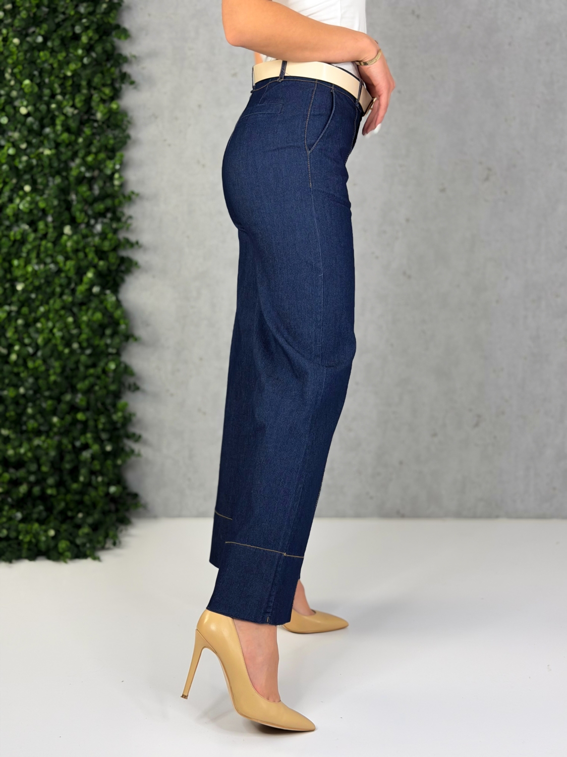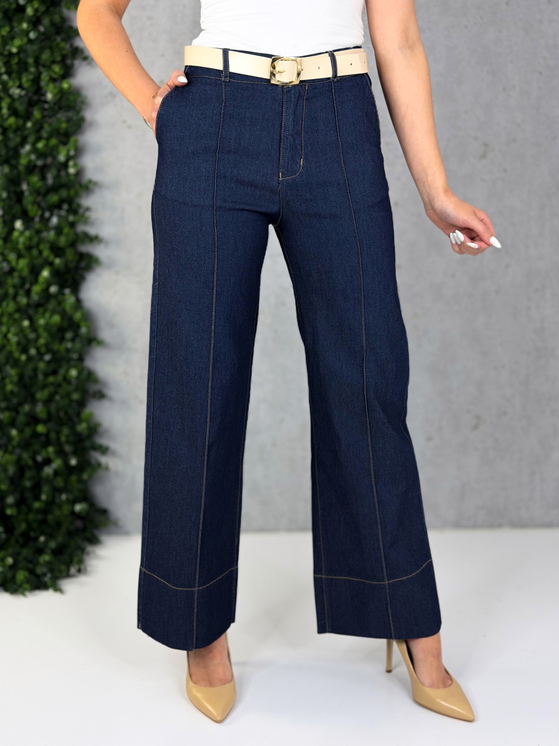 Dámske rifľové nohavice, ktoré spájajú ležérnu eleganciu s komfortom a nadčasovým dizajnom, vďaka čomu sa stanú univerzálnym kúskom vo vašom šatníku. Sú vyrobené z kvalitného tmavomodrého denimu, ktorý pôsobí upravene a zároveň sa ľahko kombinuje s rôznymi štýlmi oblečenia. Materiál má jemnú pružnosť, takže nohavice sa pohodlne prispôsobia postave, no zároveň si zachovávajú svoj tvar aj po dlhšom nosení. Model má vysoký pás, ktorý opticky predlžuje nohy a pekne formuje siluetu. Predná časť je zvýraznená dvoma zvislými švami, ktoré dodávajú nohaviciam originálny vzhľad a zároveň zoštíhľujúce línie. Strih nohavíc je rovný až mierne rozšírený, čo zabezpečuje voľnosť pohybu a elegantný pád látky. Dolný lem je precízne prešitý kontrastnou niťou, čo podčiarkuje kvalitu spracovania. Zapínanie je riešené klasicky – na zips a gombík – a doplnené pútkami na opasok. V kombinácii s lodičkami vytvoria sofistikovaný look, no rovnako dobre budú vyzerať aj s teniskami či sandálkami pre voľnejší štýl. Tieto rifľové nohavice sú ideálnou voľbou pre ženy, ktoré hľadajú kombináciu pohodlia, kvality a moderného dizajnu – či už na bežný deň, do práce, alebo na neformálne stretnutia.