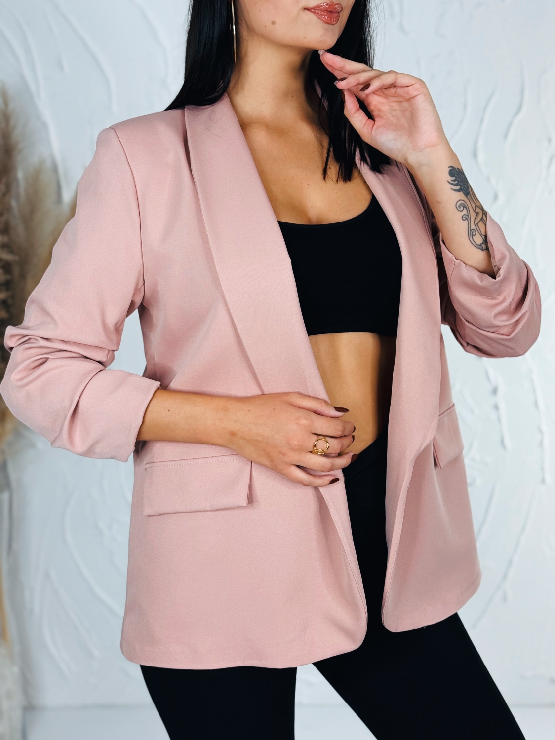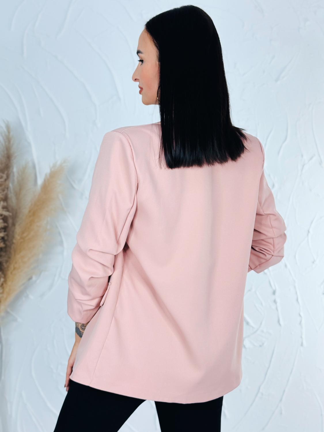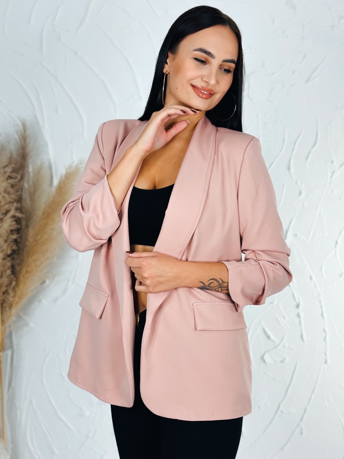 Dámske exkluzívne sako, ktoré je v jednoduchom prevedení a bez zapínania. Sako vhodné do práce aj na rande do mesta. Zaujímavá je aj štruktúra saka, ktorá Vás dostane. Nadčasové a mimoriadne praktické. Vyrobené z kvalitného a pohodlného materiálu. Vrecká na oboch stranách sú falošné. Dámske sako nemusíte nosiť výlučne k sukni či elegantným nohaviciam. Môžete k nemu doladiť aj ležérny outfit s teniskami. Modelka je vysoká 175 cm a oblečenú má veľkosť UNI.