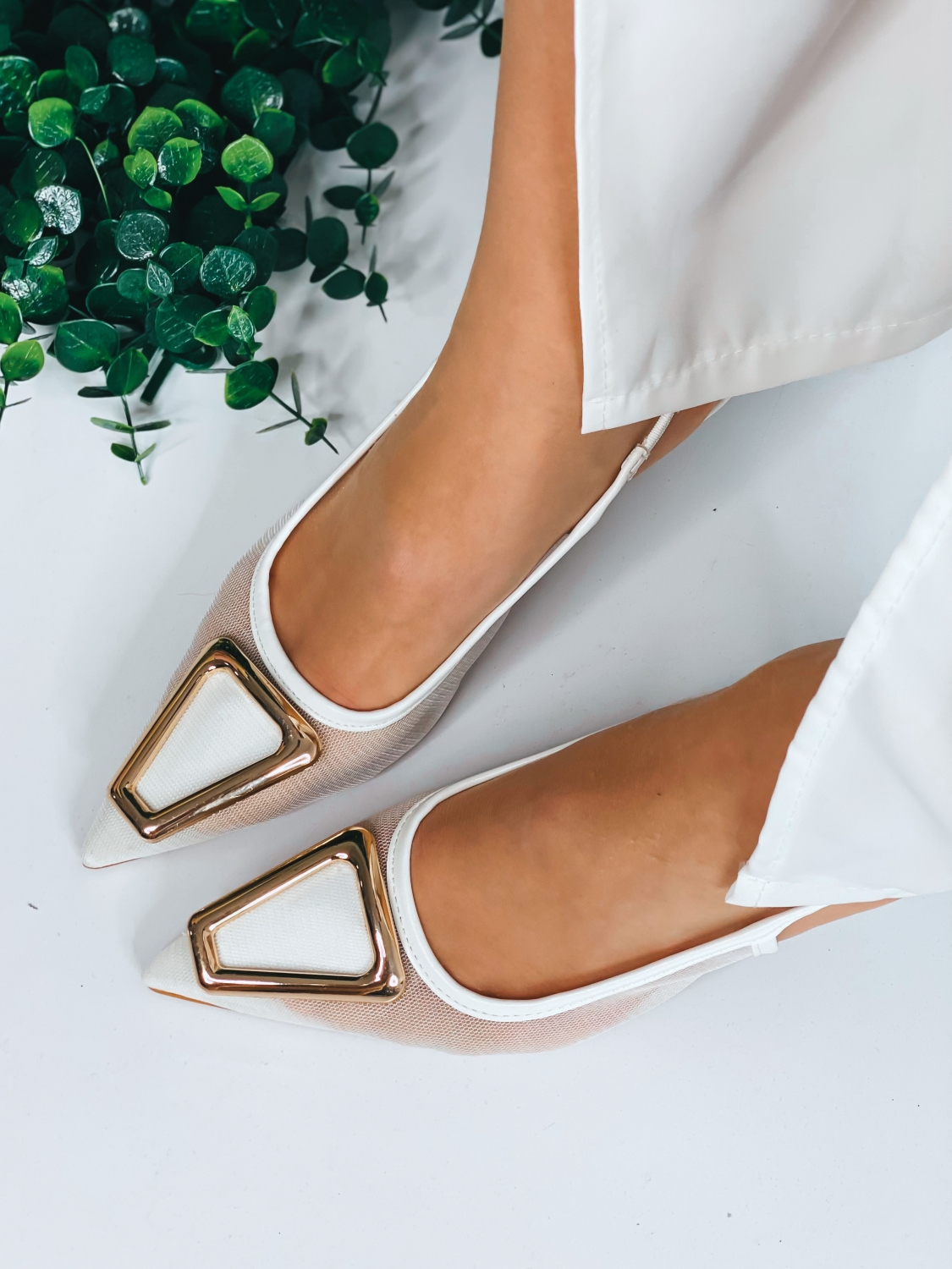 Tieto elegantné dámske sandále sú dokonalým spojením nadčasovej elegancie a každodenného komfortu. Prevedenie pôsobí univerzálne, vďaka čomu ich ľahko skombinujete s akýmkoľvek outfitom – od jednoduchých nohavíc až po šaty na špeciálnu príležitosť. Dominantným prvkom je výrazná zlatá spona v geometrickom tvare, ktorá dodáva topánkam luxusný a moderný nádych. Práve tento detail z nich robí neprehliadnuteľný módny kúsok. Sandále sú navrhnuté tak, aby sa jednoducho natiahli na nohu bez zapínania či zložitého nastavovania. Stačí obuť a môžete vyraziť. Praktický strih šetrí čas a zároveň zabezpečuje pohodlné nosenie počas celého dňa. Nízky opätok poskytuje jemné zvýšenie postavy, no zároveň zachováva stabilitu a komfort pri chôdzi. Sú ideálnou voľbou pre ženy, ktoré chcú vyzerať upravene a štýlovo bez toho, aby museli robiť kompromisy medzi eleganciou a pohodlím. Špicatá špička opticky predlžuje nohu a dodáva siluete ženskosť a noblesu.