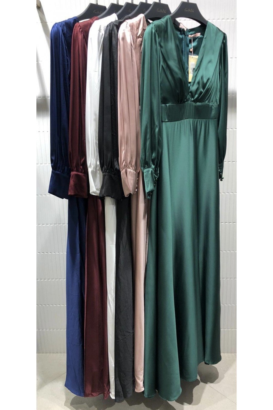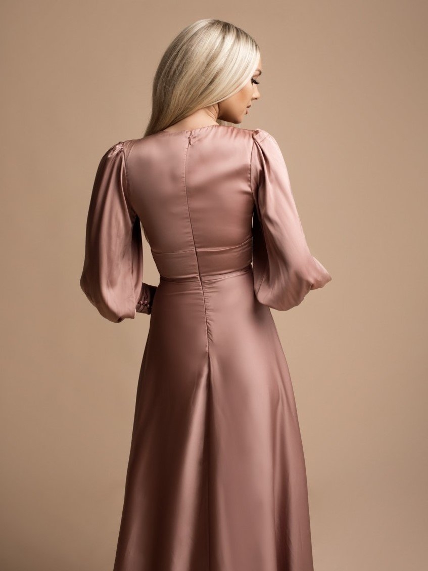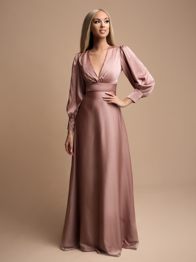Dámske saténové dlhé šaty s dlhým rukávom sú vyrobené z príjemného a padavého saténu. Tento model využijete na spoločenské príležitosti ako svadby a oslavy, ale aj stužkové slávnosti a ples. Vhodné aj ako šaty pre družičky na svadbu. Využijete ich na akúkoľvek príležitosť a neostanú bez povšimnutia. Šaty sa zapínaju na zips.
