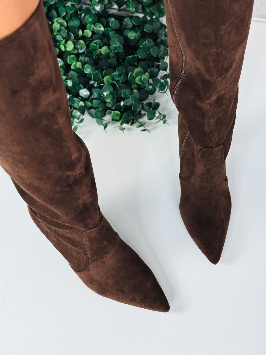 Dámské semišové hnědé kozačky na pohodlném podpatku jsou ideální kombinací stylu a komfortu. Vyrobené z kvalitního semiše působí elegantně a díky svému nadčasovému designu se snadno kombinují s různými outfity – od každodenních džínů až po šaty či sukně.