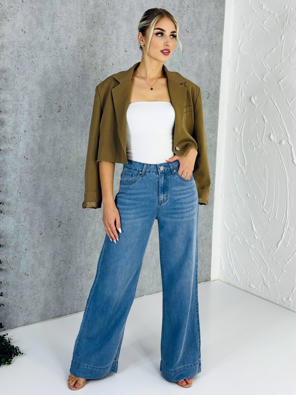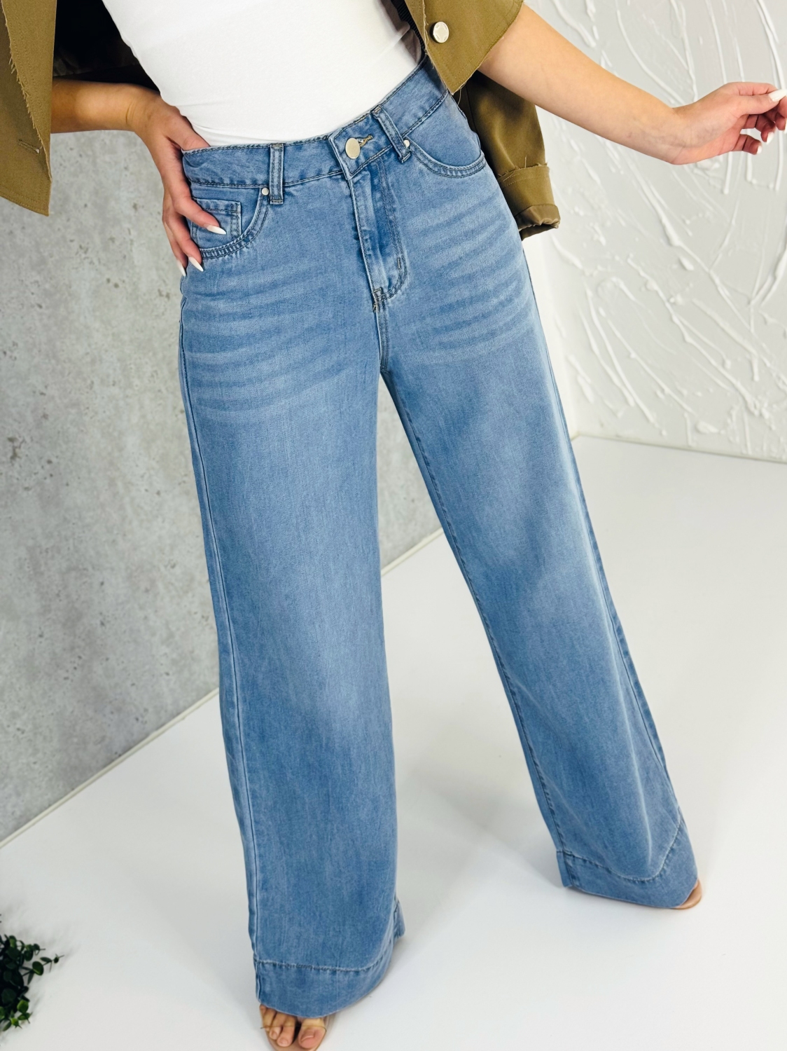 Tieto štýlové dámske rifle v svetlomodrom odtieni sú ideálnou voľbou pre ženy, ktoré milujú moderný a zároveň pohodlný štýl. Strih Wide Leg so širšími nohavicami pôsobí veľmi trendy, krásne predlžuje postavu a zároveň poskytuje maximálne pohodlie počas celého dňa. Rifle majú vysoký pás, ktorý pekne zvýrazní siluetu a umožňuje jednoduché kombinovanie s krátkymi topmi, blúzkami aj sakami. Klasické zapínanie na gombík a zips spolu s praktickými vreckami dodáva rifliam nadčasový vzhľad, ktorý nikdy nevyjde z módy. Svetlomodré prevedenie pôsobí sviežo a štýlovo, vďaka čomu sú rifle ideálne na jar, leto aj teplejšiu jeseň. Skvele sa kombinujú so športovou obuvou, sandálmi aj elegantnými podpätkami, takže si z nich jednoducho vytvoríte casual aj elegantnejší outfit. Tieto rifle sú perfektnou voľbou na každodenné nosenie – do mesta, do práce, na stretnutie s priateľmi alebo na víkendové prechádzky. Ak hľadáte moderné, pohodlné a zároveň nadčasové rifle, tento model bude skvelým doplnkom vášho šatníka.
