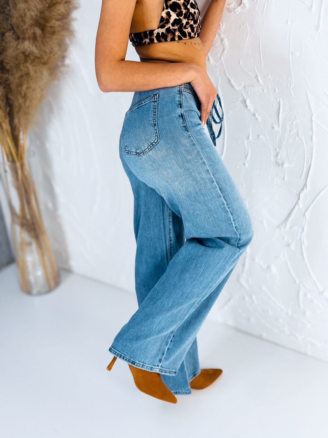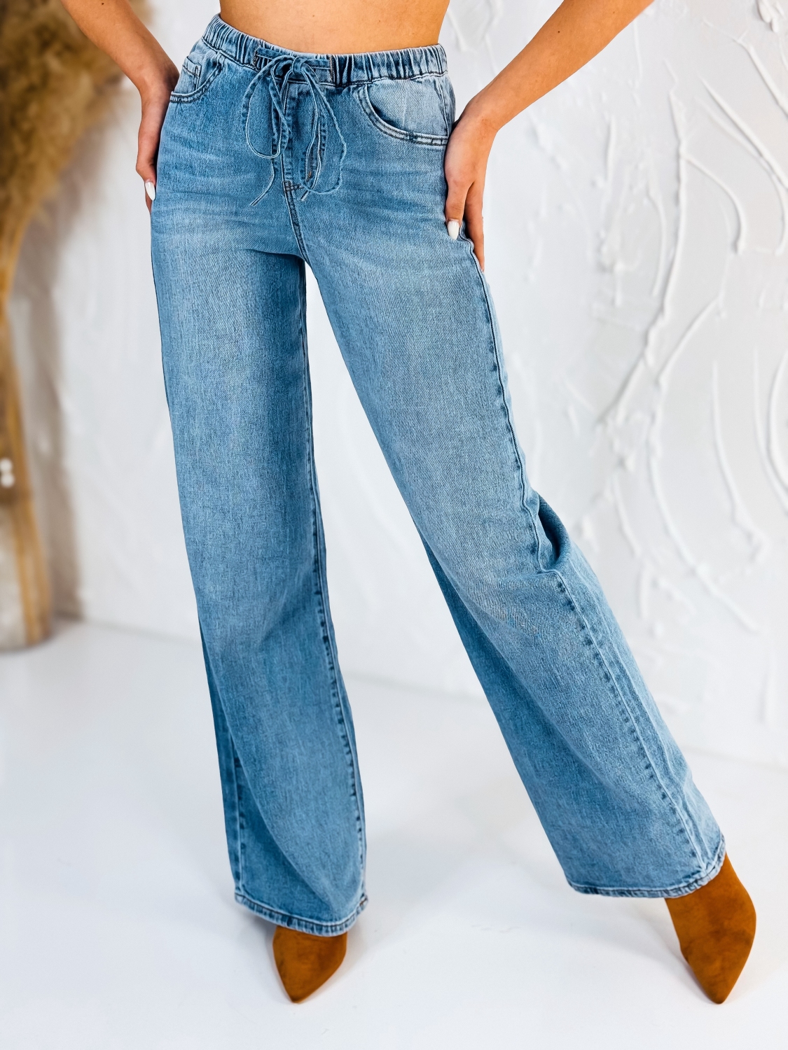 Tieto štýlové dámske rifle v modernom širokom strihu sú ideálnou voľbou pre ženy, ktoré hľadajú pohodlie a zároveň chcú vyzerať trendy. Modré rifľové prevedenie pôsobí nadčasovo a veľmi ľahko sa kombinuje s rôznymi kúskami oblečenia. Rifle majú v páse praktickú gumičku, ktorá sa dokonale prispôsobí postave a zabezpečí maximálne pohodlie počas celého dňa. Viazanie v páse zároveň dodáva rifliam zaujímavý detail a umožňuje lepšie prispôsobiť šírku pásu podľa potreby. Vďaka tomu krásne zvýraznia postavu a vytvoria modernú siluetu. Široké nohavice poskytujú voľnosť pohybu a zároveň pôsobia veľmi štýlovo. Tento strih je momentálne veľmi obľúbený, pretože spája komfort s moderným módnym vzhľadom. Rifle sú ideálne na každodenné nosenie – do mesta, na stretnutia s priateľmi, do práce aj na voľný čas. Skvele sa kombinujú s jednoduchými tričkami, krátkymi topmi, košeľami alebo ľahkými sakami. Doplniť ich môžete športovou obuvou, sandálmi alebo elegantnými podpätkami a vytvoríte tak rôzne štýlové outfity podľa príležitosti.