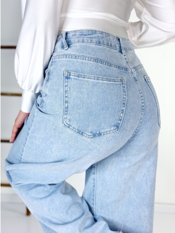 Dámske široké rifle – štýlový kúsok pre každú príležitosť. Objavte dokonalú kombináciu pohodlia a trendového dizajnu s našimi dámskymi širokými rifľami v klasickej modrej farbe. Tento model je ideálny pre ženy, ktoré milujú nadčasový štýl a zároveň si potrpia na pohodlie pri každodennom nosení. Prémiová kvalita a dokonalé spracovanie. Rifle sú vyrobené z vysokokvalitného denimu, ktorý je príjemný na dotyk, priedušný a zároveň dostatočne pevný, aby si udržal svoj tvar aj po opakovanom praní. Pridaný elastan zabezpečuje jemnú pružnosť, vďaka čomu sa nohavice krásne prispôsobia postave a neobmedzujú v pohybe. Moderný strih.