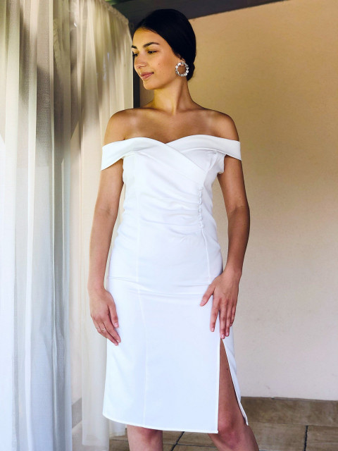 Dámske spoločenské šaty s gombíkmi a razporkom na ramená. Sú vyrobené z jemného a mierne elastického materiálu a majú vystužené prsia. Vzadu zapínanie na zips. Tento model využijete na spoločenské príležitosti ako svadby a oslavy. Vhodné aj ako šaty pre družičky na svadbu. Vezmite si ich na akúkoľvek príležitosť a neostanú Vám tak visieť v skrini po jednej akcii, to Vám sľubujeme :). Šaty sa prispôsobia každej postave. Modelka je vysoká 170 cm a má oblečenú veľkosť UNI.