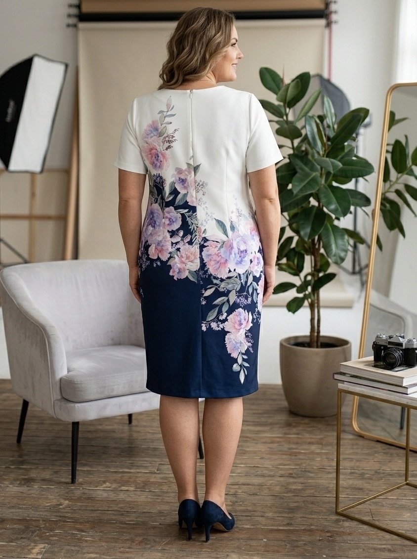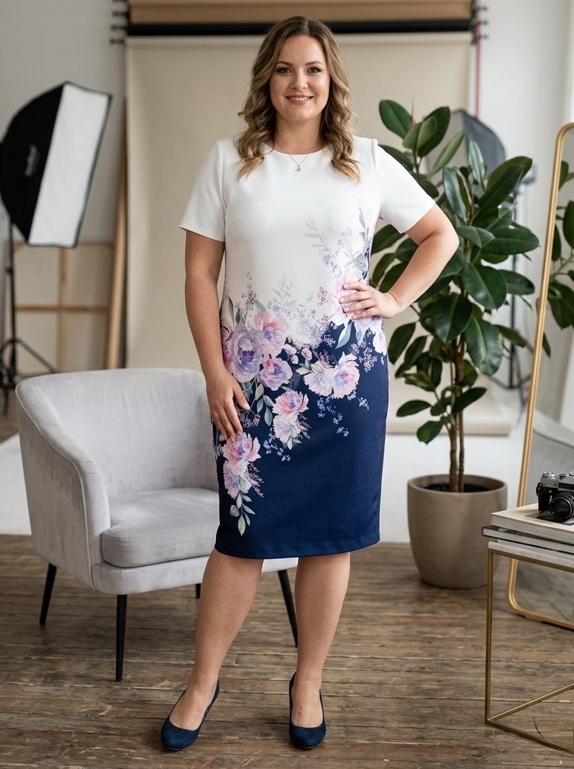 Tieto modré dámske spoločenské šaty pre moletky sú navrhnuté tak, aby pôsobili jemne, žensky a zároveň elegantne. Sú vyrobené z príjemného materiálu, ktorý je pohodlný na nosenie a zároveň pekne drží tvar, takže sa prispôsobí postave bez nepríjemného ťahania alebo obmedzovania pohybu. Strih je navrhnutý tak, aby lichotil plnším krivkám a vytváral vyváženú siluetu. Šaty majú krátky rukáv, ktorý pôsobí ľahko a vzdušne, a zároveň poskytuje dostatočné zakrytie ramien. Na prednej časti sa nachádza dekoratívny kvetinový detail, ktorý dodáva šatám romantický a jemne slávnostný vzhľad. Tento prvok pôsobí ako decentná ozdoba, ktorá zvýrazňuje celkový dizajn bez toho, aby bol príliš výrazný. Zapínanie je umiestnené vzadu na zips, čo zabezpečuje jednoduché obliekanie a zároveň čistý a elegantný vzhľad prednej časti šiat.