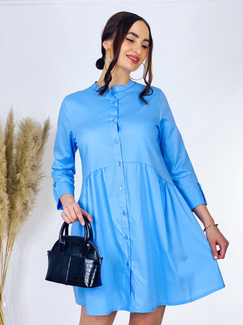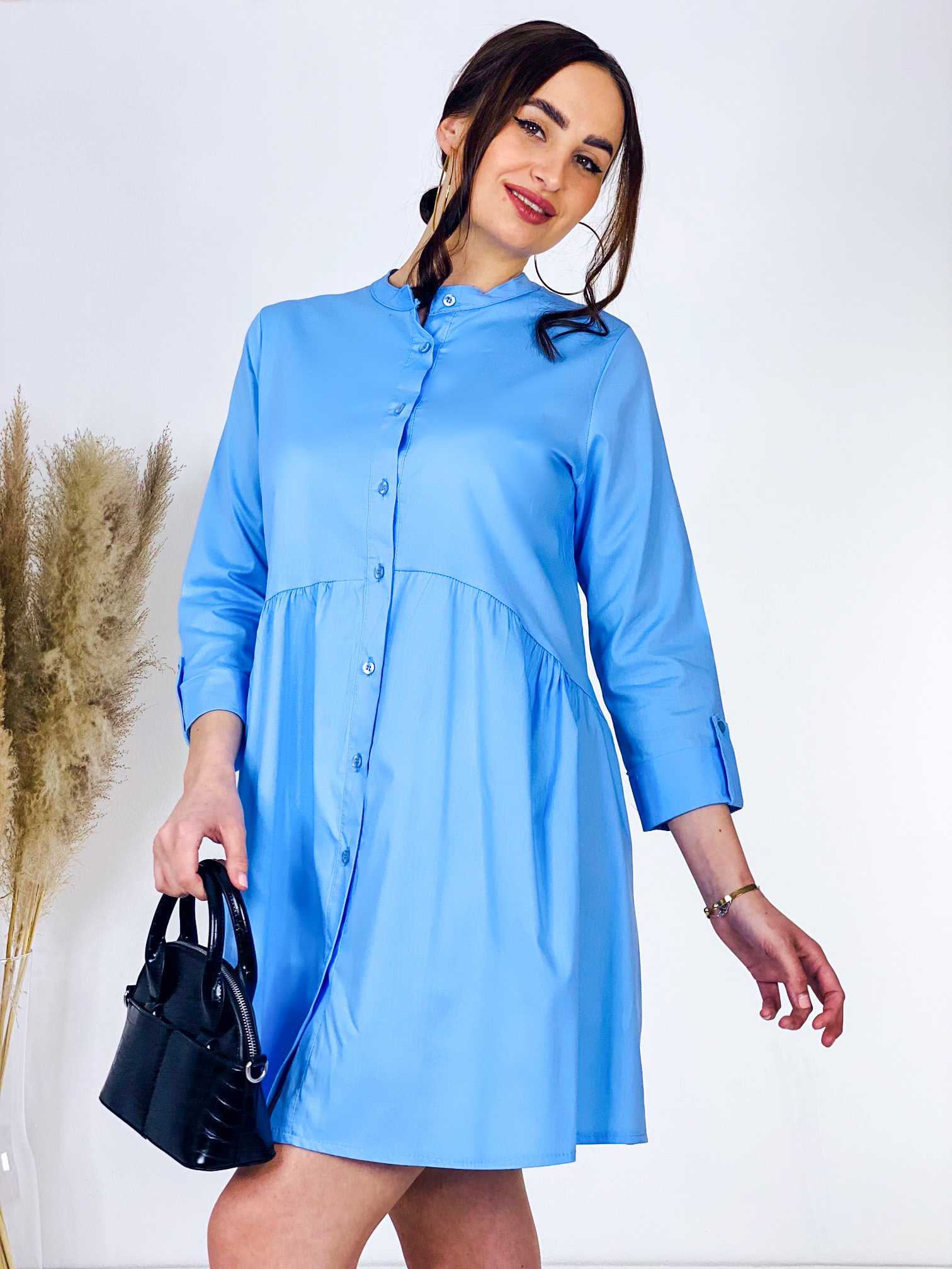 Dámske oversize jednofarebné svetlo modré košeľové šaty Marilyn. Jednoduché, no vždy trendy košeľové šaty na každý deň. Majú 3/4 rukávy, zapínanie na gombíky a sú bez goliera, vďaka čomu pôsobia veľmi sviežo, štýlovo a trendy. Kvalitný a nikdy nestarnúci kúsok pre každú trendovú žienku, ktorý Vám skrátka nesmie chýbať v šatníku. Kombinujte ich s lodičkami a vytvorte tak elegantný outfit. Alebo si obujte tenisky a rifľovú bundu a športový outfit je na svete. Šaty, ktoré sa postarajú o Váš komfort. Modelka je vysoká 175 cm a oblečenú má veľkosť UNI.