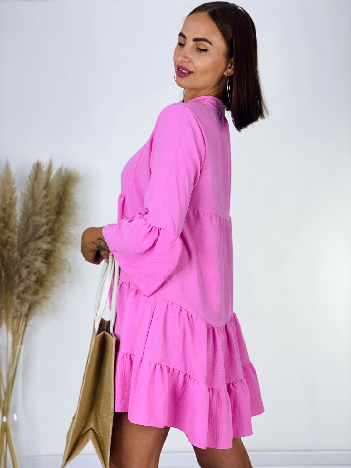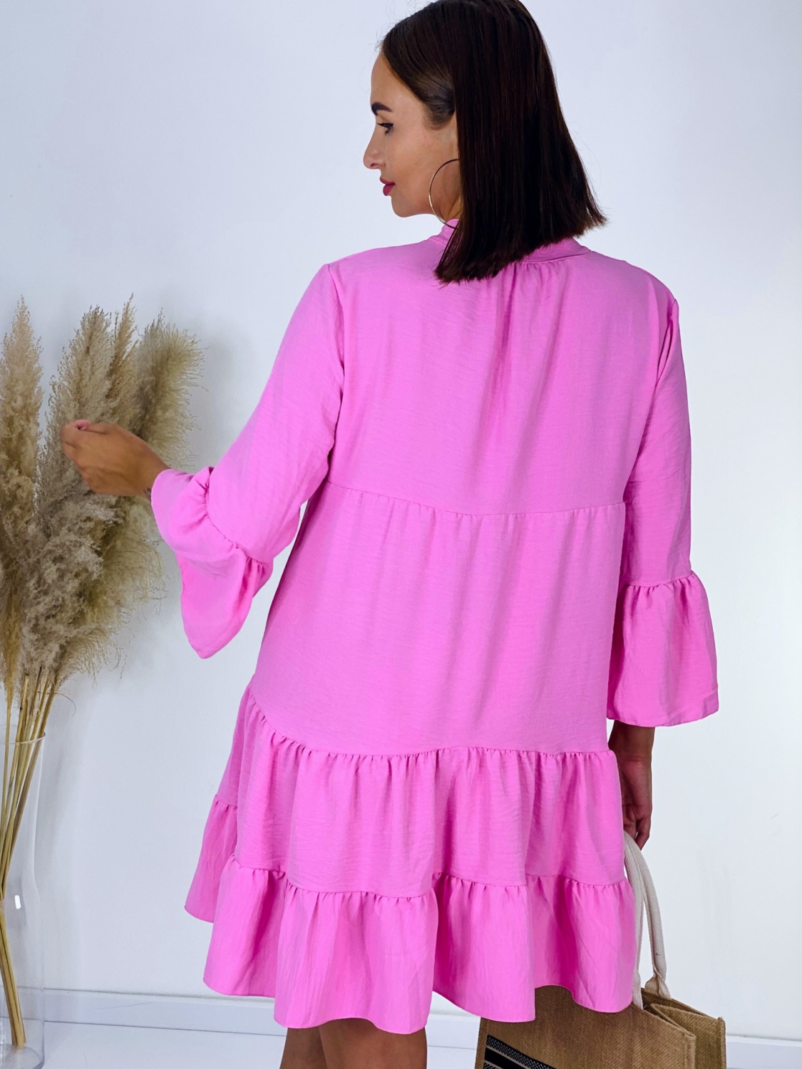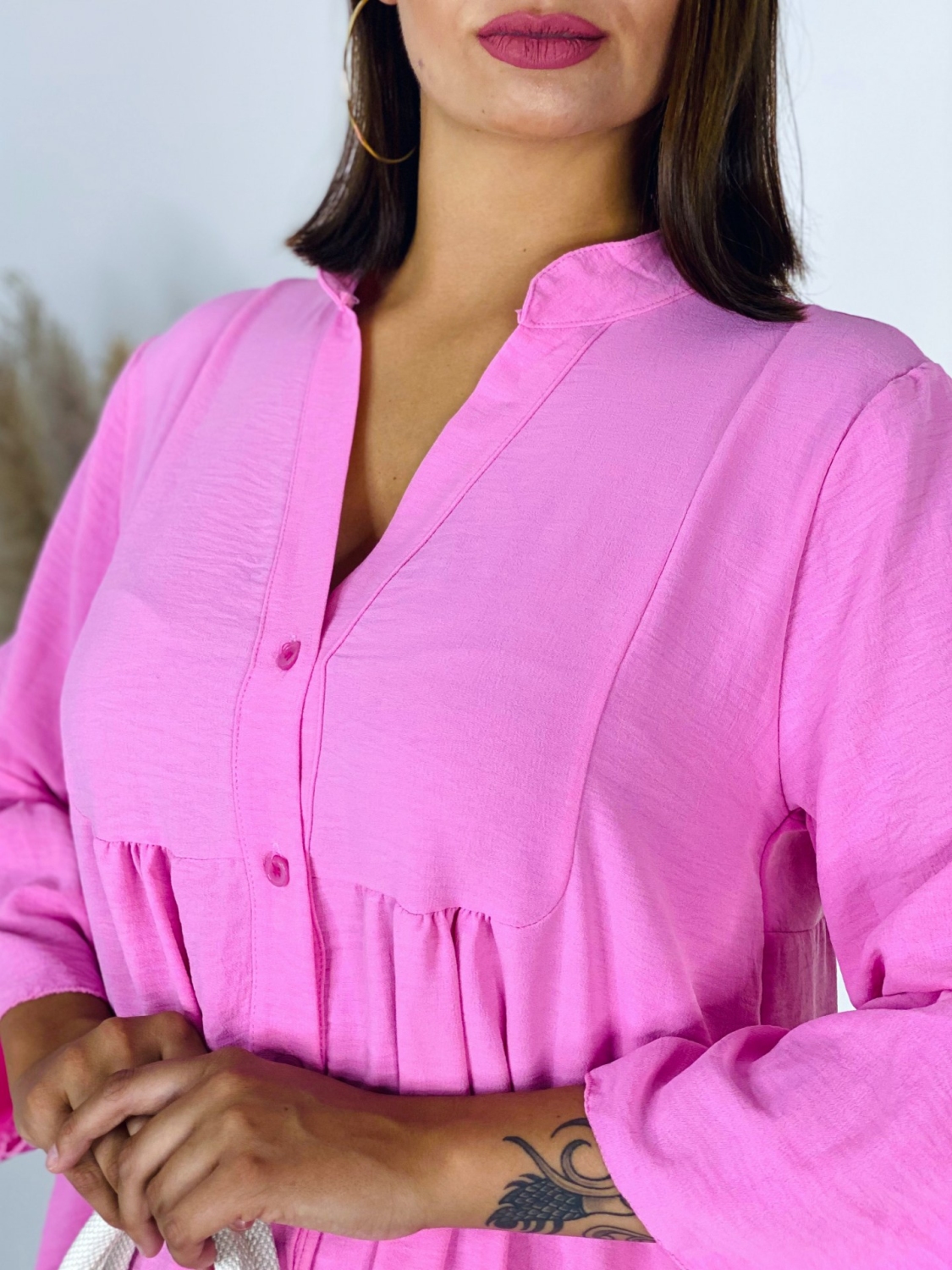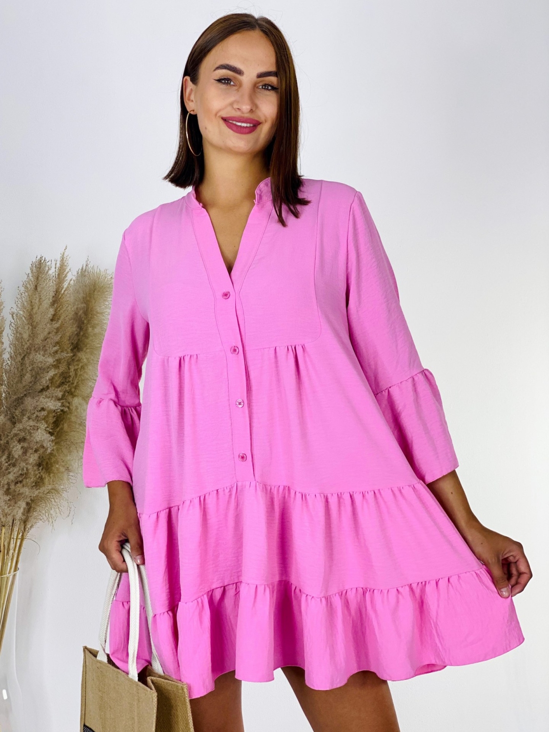 Dámske oversize jednofarebné košeľové šat. Jednoduché, no vždy trendy košeľové šaty na každý deň. Majú 3/4 rukávy, zapínanie na gombíky a sú bez goliera, vďaka čomu pôsobia veľmi sviežo, štýlovo a trendy. Kvalitný a nikdy nestarnúci kúsok pre každú trendovú žienku, ktorý Vám skrátka nesmie chýbať v šatníku. Kombinujte ich s lodičkami a vytvorte tak elegantný outfit. Alebo si obujte tenisky a rifľovú bundu a športový outfit je na svete. Šaty, ktoré sa postarajú o Váš komfort. Modelka je vysoká 175 cm a oblečenú má veľkosť UNI.