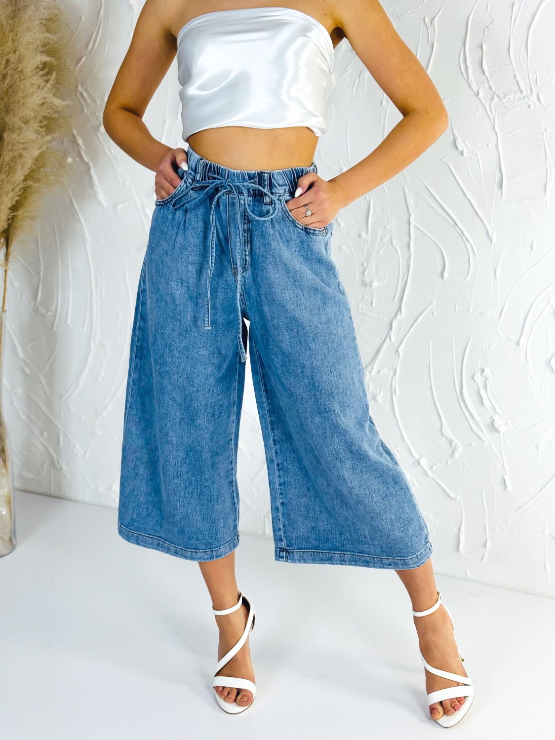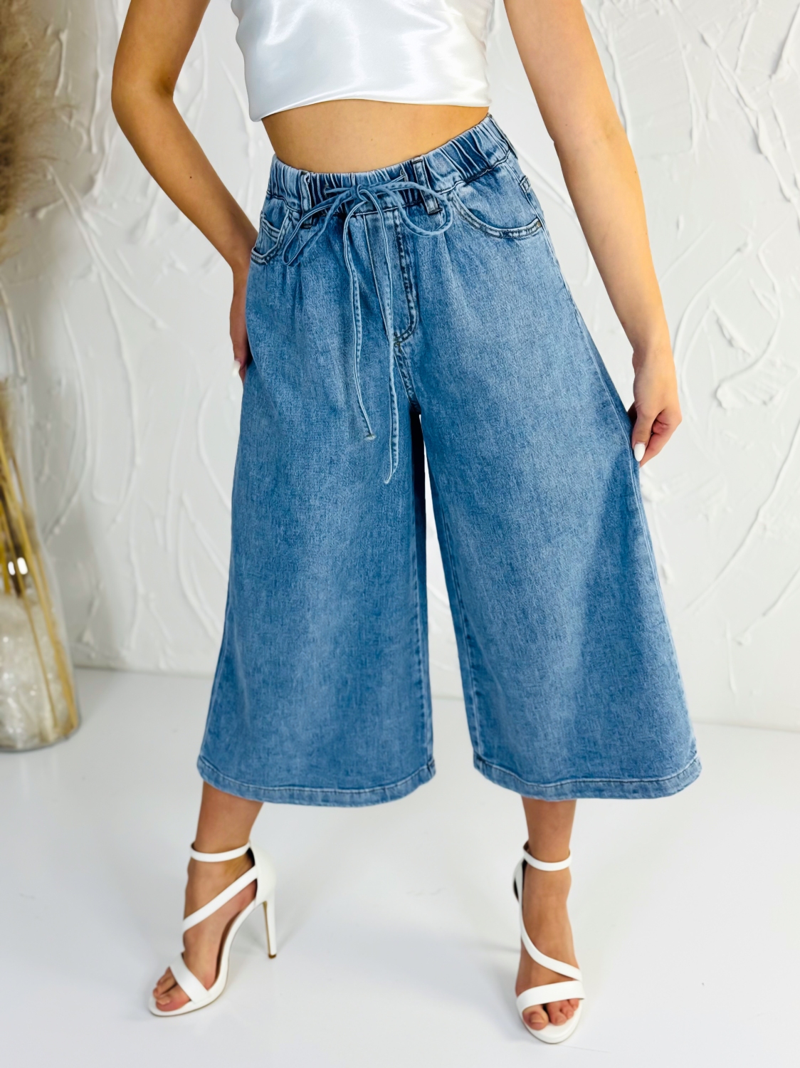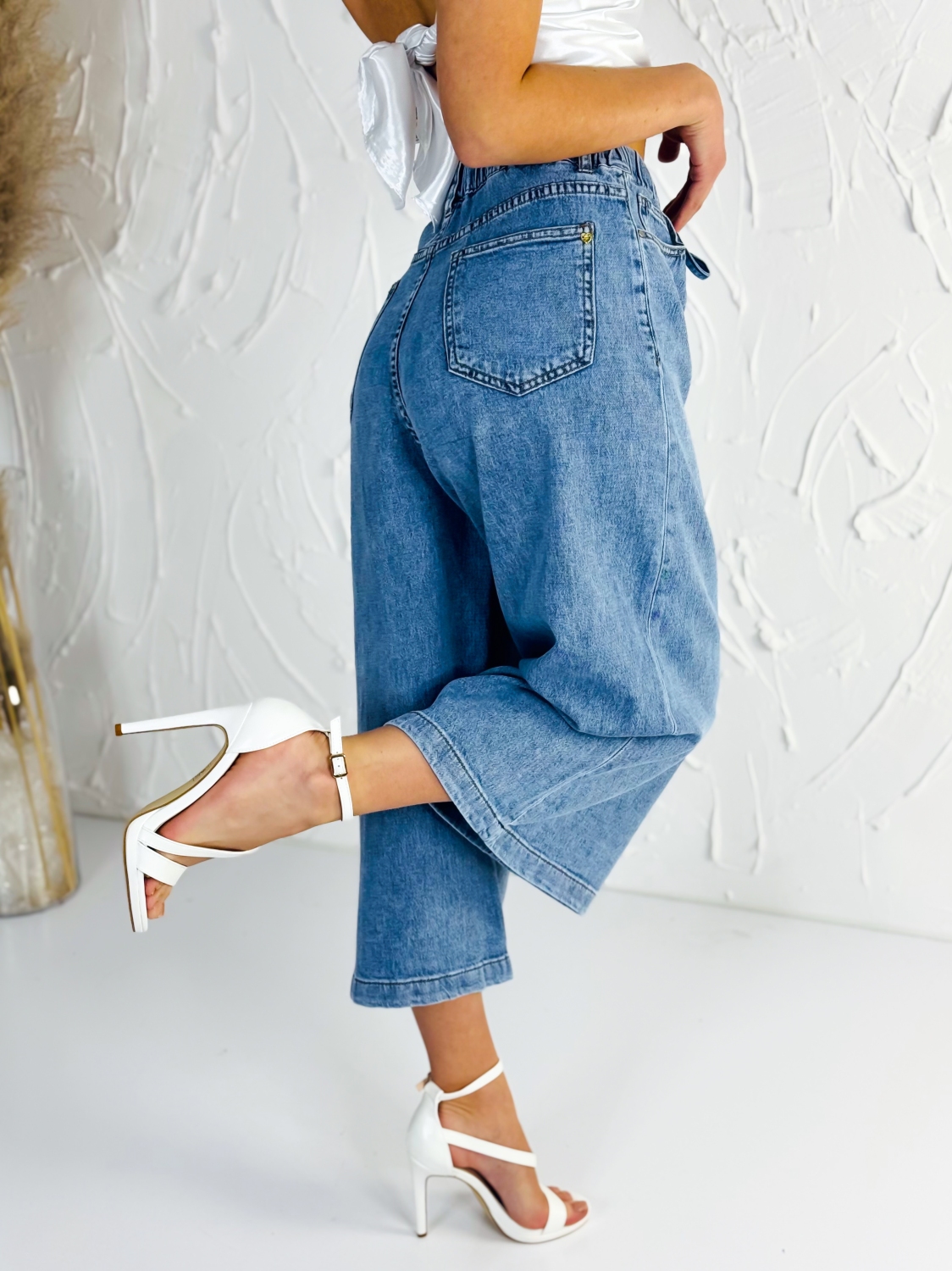 Dámske capri rifle s gumičkou v páse sú štýlovým a pohodlným kúskom, ktorý kombinuje moderný dizajn s praktickosťou a komfortom. Rifle sú vyrobené z kvalitného materiálu, ktorý sa jemne prispôsobí postave, poskytuje pohodlie počas celého dňa a zároveň udržiava svoj tvar. Strih riflí je slim, mierne priliehavý, a vďaka gumičke v páse sa pás prirodzene prispôsobí obvodu, čím zvýrazňuje siluetu a zaisťuje, že rifle držia na svojom mieste bez stiahnutia alebo nepohodlia. Capri dĺžka riflí je 80 cm, čo je ideálne pre teplejšie dni alebo na letné outfity, a umožňuje pohodlné kombinovanie s topánkami typu baleríny, sandále alebo tenisky. Gumička v páse poskytuje flexibilitu a pohodlie, pričom zaručuje elegantný a upravený vzhľad, ktorý ladí s rôznymi štýlmi oblečenia. Tieto capri rifle sú ideálne na každodenné nosenie, voľný čas, prechádzky alebo stretnutia s priateľmi, a ľahko sa kombinujú s tričkami, blúzkami, topmi alebo svetríkmi.