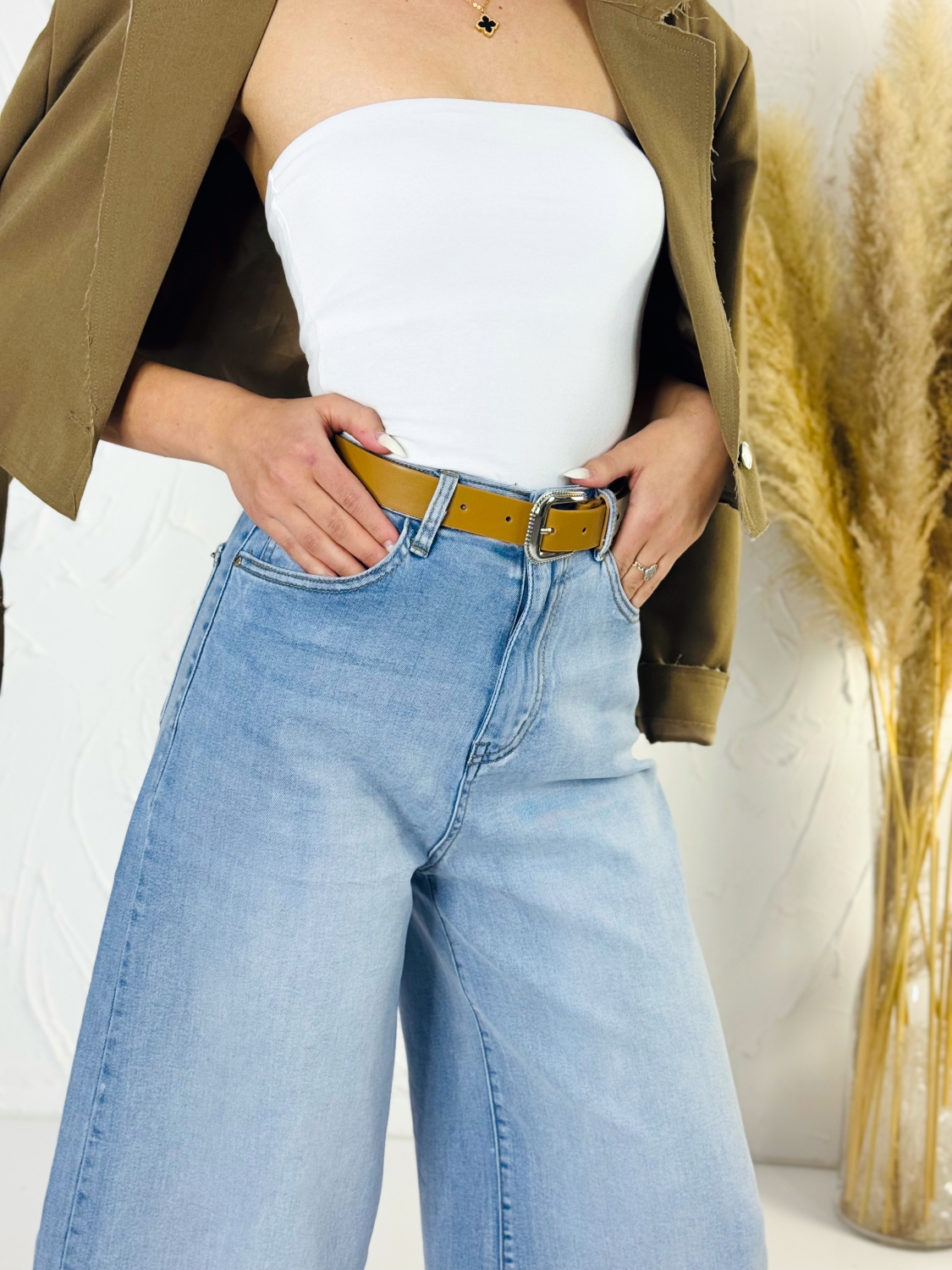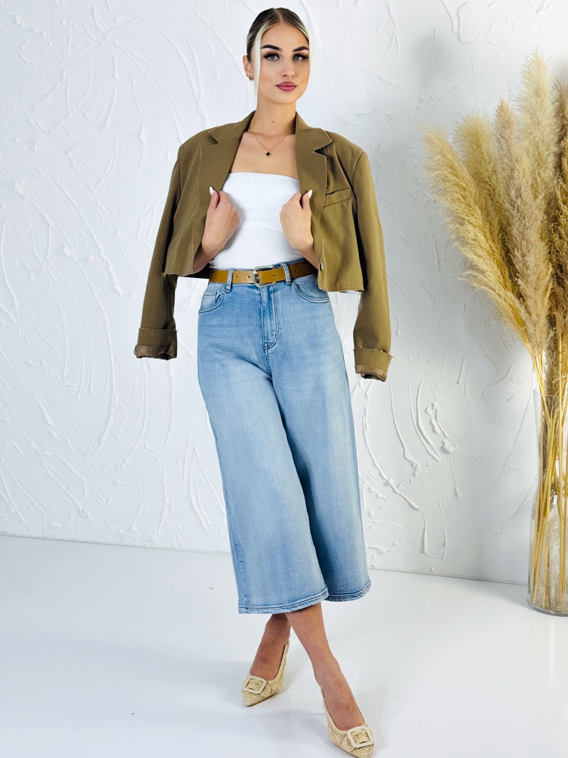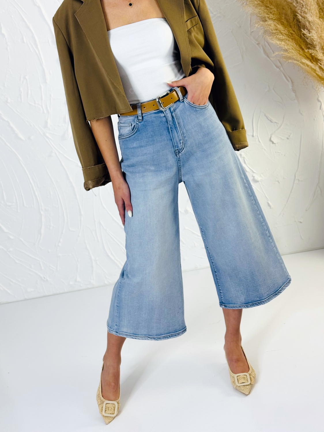 Dámske svetlomodré capri rifle s vysokým pásom a opaskom sú ideálnou voľbou pre ženy, ktoré milujú pohodlie, štýl a nadčasovú eleganciu. Moderný širší strih nohavíc pôsobí veľmi žensky, zároveň je vzdušný a príjemný na nosenie počas celého dňa. Vysoký pás krásne zvýrazní postavu, opticky predĺži nohy a zároveň poskytne pohodlie pri nosení. Kvalitný a jemne pružný materiál sa prispôsobí postave a zaručuje komfort pri chôdzi aj sedení. Svetlomodrá farba pôsobí sviežo, elegantne a ľahko sa kombinuje s rôznymi kúskami z vášho šatníka – či už s jednoduchým topom, košeľou, svetrom alebo ľahkým sakom. Dĺžka nohavíc 84 cm vytvára moderný capri efekt, ktorý je ideálny na teplejšie dni. Tento model je vhodný na každodenné nosenie, do práce, na stretnutia aj voľný čas. Stačí doplniť teniskami, sandálmi alebo lodičkami a vytvoríte štýlový outfit na každú príležitosť. Ak hľadáte pohodlné, elegantné a univerzálne rifle, ktoré nikdy nevyjdú z módy, tento model je skvelou voľbou.