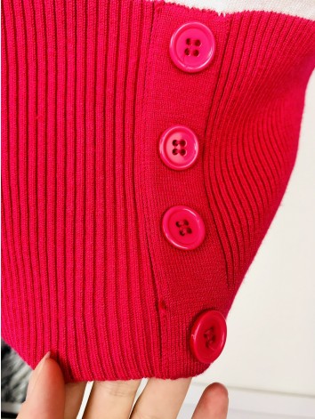 Dámske svetríkové šaty s ozdobnými gombíkmi na ramenách a v spodnej prednej časti. Šaty majú pruhovaný vzor v bielo-ružovej farbe. Pri páse sú putka na opasok, ktorý si viete jednoducho doladiť. Príjemný a hrejivý materiál zaistí pohodlie pri nosení. (Opasok nie je súčasťou.)