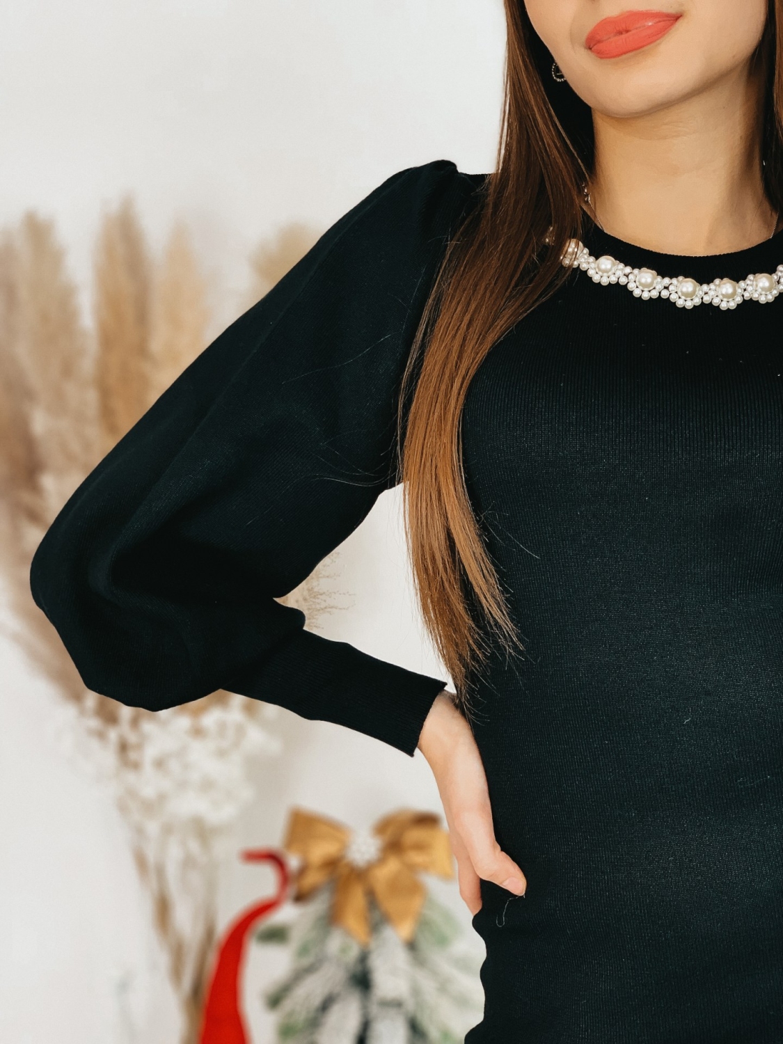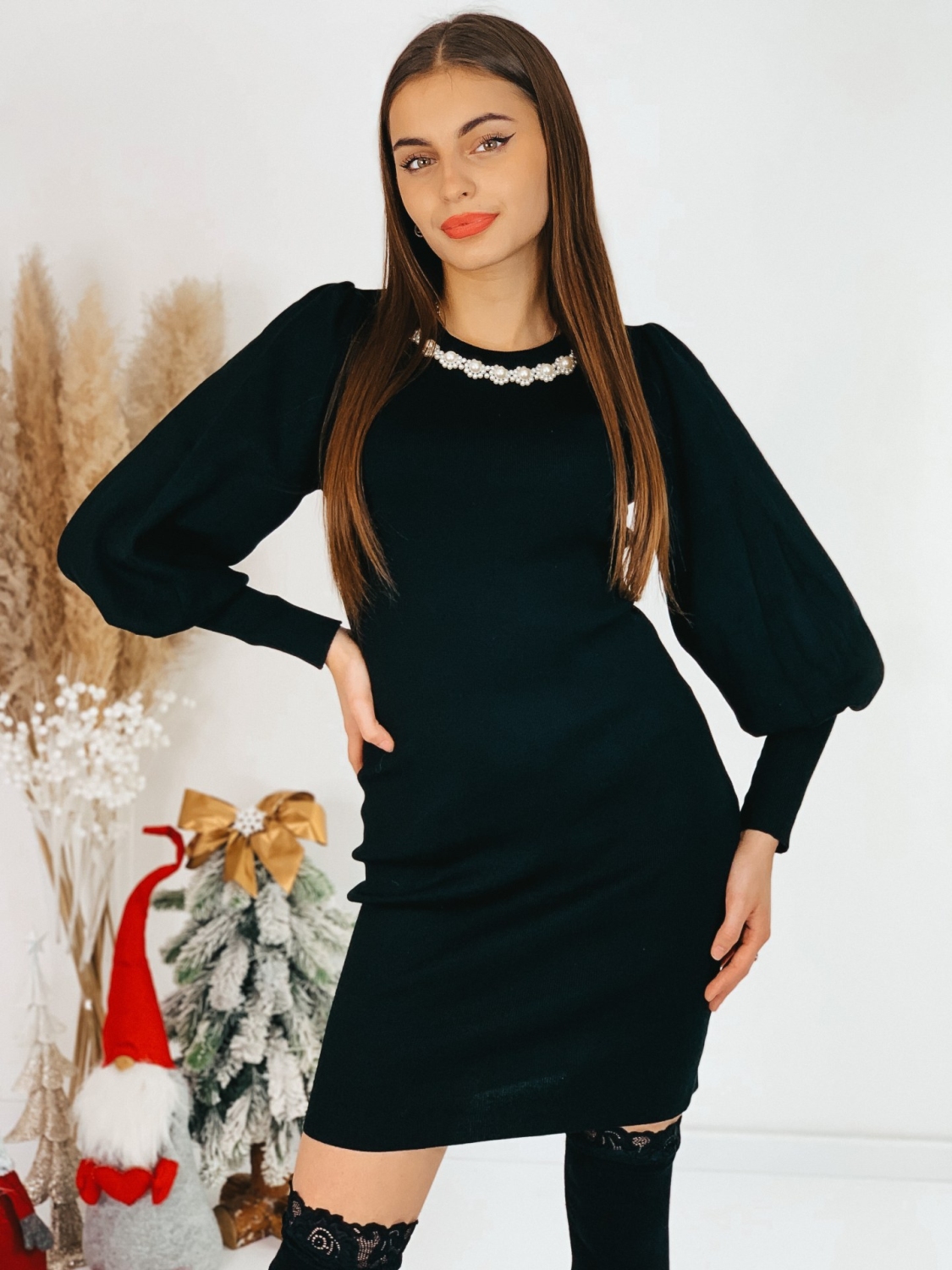 Dámske exkluzívne pletené šaty, ktoré sú vyrobené z kvalitného hrubšieho materiálu a sú doplnené perlami okolo krku a balónovými rukávmi v 70 cm dĺžke. Dĺžka šiat siaha nad kolená. Dlhý rukáv a veľmi príjemný material na dotyk. Kvalitný kúsok pre každú trendovú žienku, ktorá miluje módu a zaujímavé kúsky. Kombinujte ich s čižmami a koženou alebo zimnou bundou. Šaty, ktoré sa postarajú o Váš komfort a prispôsobia sa Vaším krivkám. Zabránia pocitu zimy. Mäkké, príjemné, hrejivé. Modelka je vysoká 175 cm a oblečenú má veľkosť S/M.