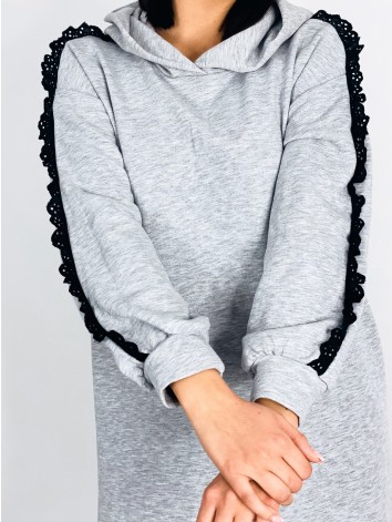 Dámske teplákové oversize šaty, ktoré sú doplnené volánmi v spodnej časti. Vhodné na každý deň, bežné nosenie. Doplnené kapucňou. Maximálne pohodlný materiál týchto šiat si zamilujete rovnako ako my. Myslíme, že každá z nás by mala vlastniť aspoň jedny šaty tohto strihu. Nahodíte na seba a môžete vyraziť. Šaty sú bez zapínania. Modelka je vysoká 175 cm a má oblečenú veľkosť UNI.