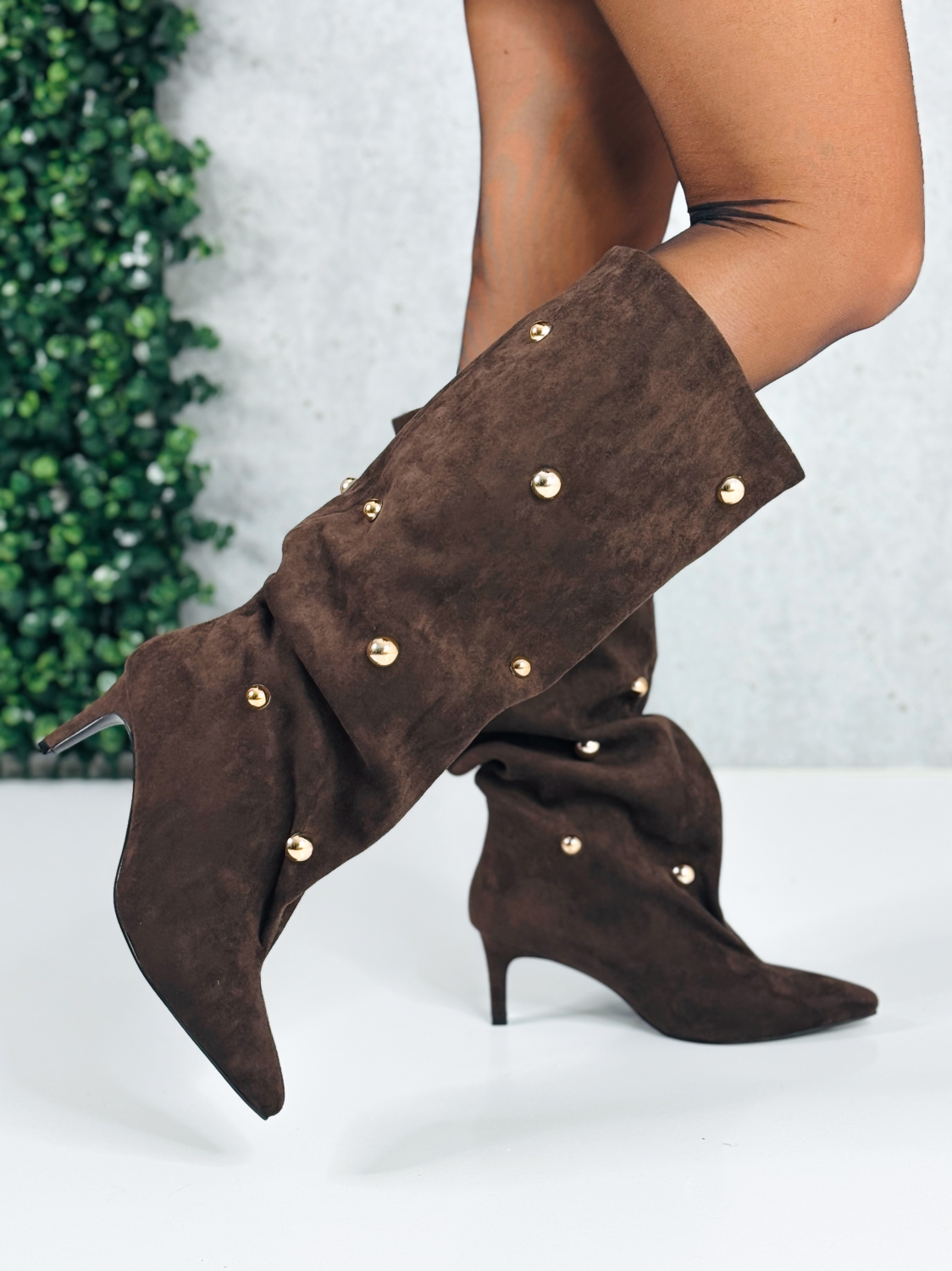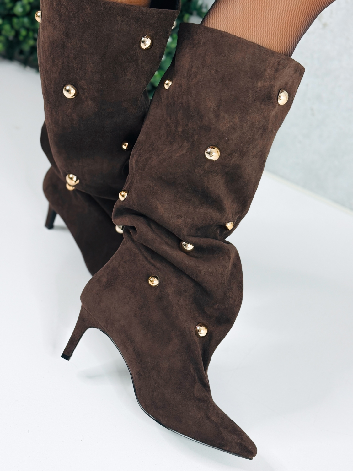 Tieto štýlové dámske čižmy pod kolená sú ideálnou voľbou pre každú modernú ženu, ktorá hľadá kombináciu pohodlia, elegancie a odvážneho dizajnu. Čižmy sú vyrobené z kvalitného materiálu, ktorý zaručuje odolnosť a dlhú životnosť. Ich hladký povrch pôsobí luxusne a zároveň prakticky, čo umožňuje jednoduchú údržbu. Nízky, stabilný opätok poskytuje pohodlnú chôdzu počas celého dňa, zatiaľ čo podkolenná dĺžka elegantne predlžuje siluetu a dodáva ženský šarm. Výnimočný dizajn týchto čižiem dopĺňajú kovové cvoky, ktoré im dodávajú moderný a jemne rockový nádych, ideálne na oživenie každého outfitu. Cvoky sú starostlivo umiestnené tak, aby boli štýlové, ale zároveň neprekážali pri nosení. Čižmy sú vhodné na rôzne príležitosti – od každodenného nosenia do práce či na prechádzky, až po večerné výlety a spoločenské udalosti. Vnútorná podšívka zabezpečuje pohodlie a teplo, zatiaľ čo pevná podrážka zaisťuje stabilitu a bezpečný krok na rôznych povrchoch.