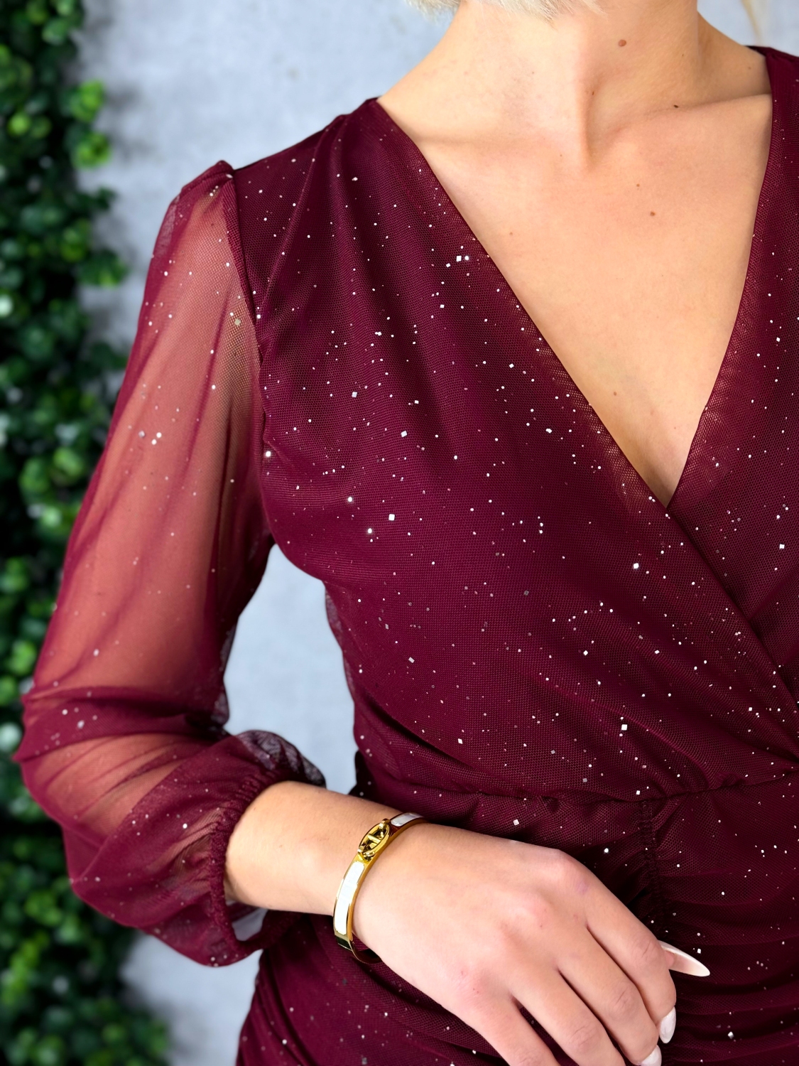 Dámske trblietavé nazberané šaty s priesvitnými rukávmi – dokonalá voľba pre každú ženu, ktorá chce zažiariť. Tieto šaty spájajú ženskosť, eleganciu a moderný glam tak prirodzene, že sa okamžite stanú obľúbeným kúskom vo vašom šatníku. Jemne trblietavý materiál dopĺňa výrazné nazberanie, ktoré krásne tvaruje postavu, zvýrazňuje siluetu a opticky ju zoštíhľuje. Pri každom pohybe vytvárajú šaty luxusný efekt – presne ten, ktorý si večerné udalosti žiadajú. Priesvitné rukávy dodávajú modelu šarm a ľahkosť. Jemná látka pôsobí romanticky a zároveň veľmi trendovo, takže šaty pôsobia elegantne, no stále sviežo a mladistvo. Rukávy sú pohodlné, priedušné a príjemné na nosenie aj počas dlhších akcií. Nazberaná predná časť je navrhnutá tak, aby lichotila rôznym typom postavy – zakryje, čo má zostať skryté, a zvýrazní to najkrajšie. Vďaka premyslenému strihu sa v šatách budete cítiť sebavedomo, žensky a výnimočne od prvého momentu.