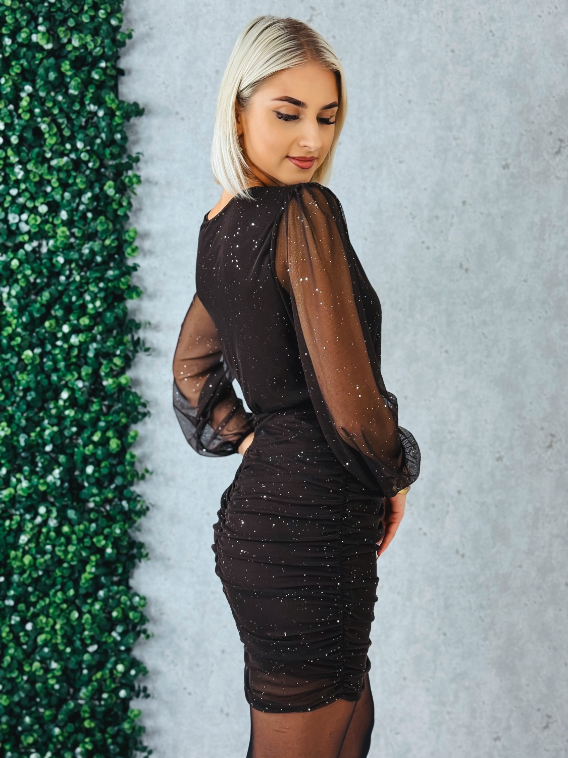 Dámske trblietavé nazberané šaty s priesvitnými rukávmi – dokonalá voľba pre každú ženu, ktorá chce zažiariť. Tieto šaty spájajú ženskosť, eleganciu a moderný glam tak prirodzene, že sa okamžite stanú obľúbeným kúskom vo vašom šatníku. Jemne trblietavý materiál dopĺňa výrazné nazberanie, ktoré krásne tvaruje postavu, zvýrazňuje siluetu a opticky ju zoštíhľuje. Pri každom pohybe vytvárajú šaty luxusný efekt – presne ten, ktorý si večerné udalosti žiadajú. Priesvitné rukávy dodávajú modelu šarm a ľahkosť. Jemná látka pôsobí romanticky a zároveň veľmi trendovo, takže šaty pôsobia elegantne, no stále sviežo a mladistvo. Rukávy sú pohodlné, priedušné a príjemné na nosenie aj počas dlhších akcií. Nazberaná predná časť je navrhnutá tak, aby lichotila rôznym typom postavy – zakryje, čo má zostať skryté, a zvýrazní to najkrajšie. Vďaka premyslenému strihu sa v šatách budete cítiť sebavedomo, žensky a výnimočne od prvého momentu.