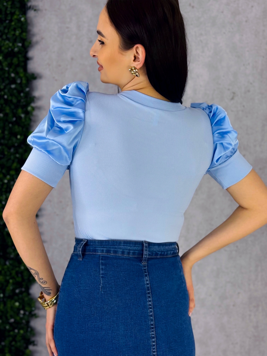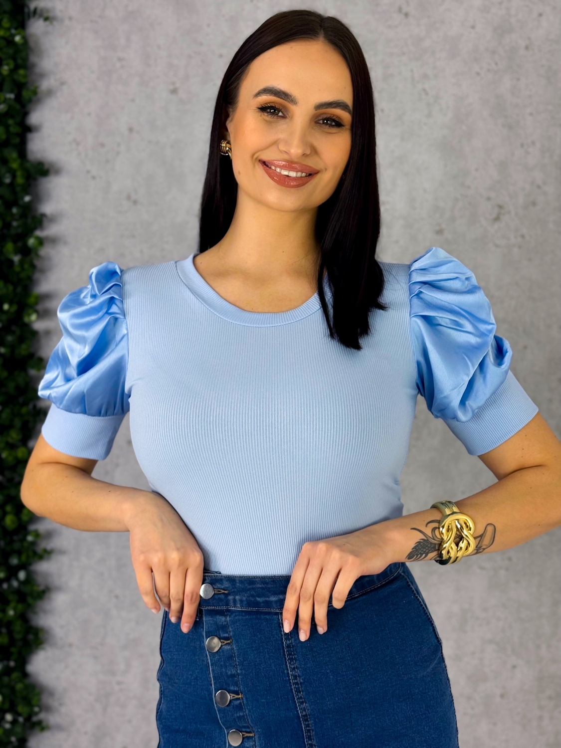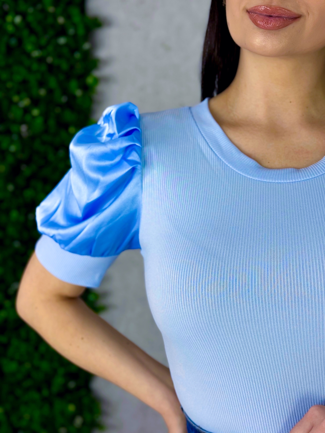 Elegantné dámske tričko s pôvabnými saténovými rukávmi – klasika s nádychom luxusu. Toto tričko je dokonalým spojením pohodlia a štýlu. Je vyrobené z mäkkého, elastického rebrovaného úpletu, ktorý sa krásne prispôsobí postave a vytvára lichotivý strih. Najvýraznejším prvkom sú nadýchané rukávy zo saténového materiálu, ktoré dodávajú outfitu originálny vzhľad. Krátke rukávy sú zakončené širokým rebrovaným lemom, ktorý zabezpečuje pevné držanie a zvýrazňuje ramená. Výstrih je okrúhly, klasický a decentný – ideálny na každodenné nosenie aj špeciálne príležitosti.