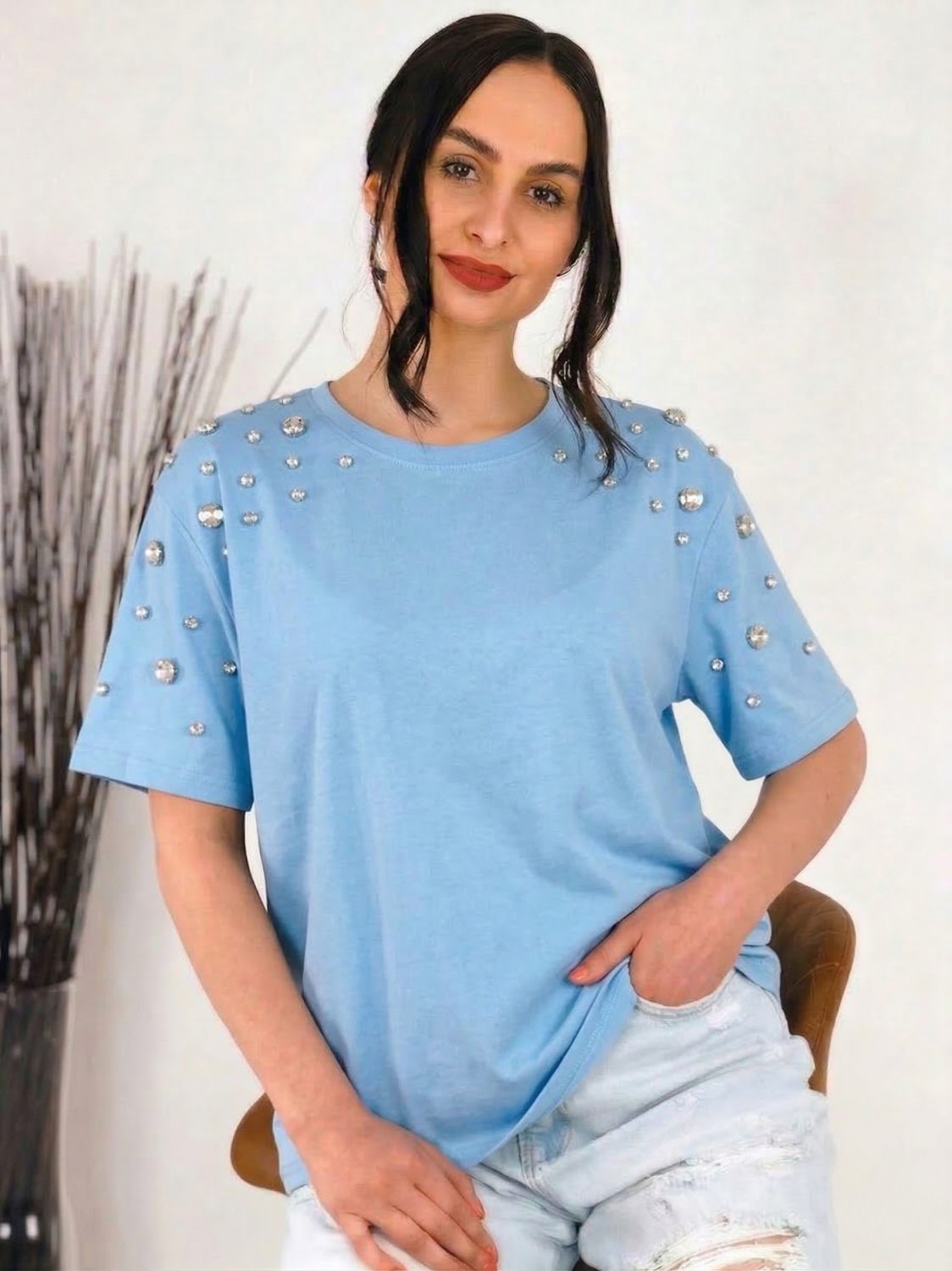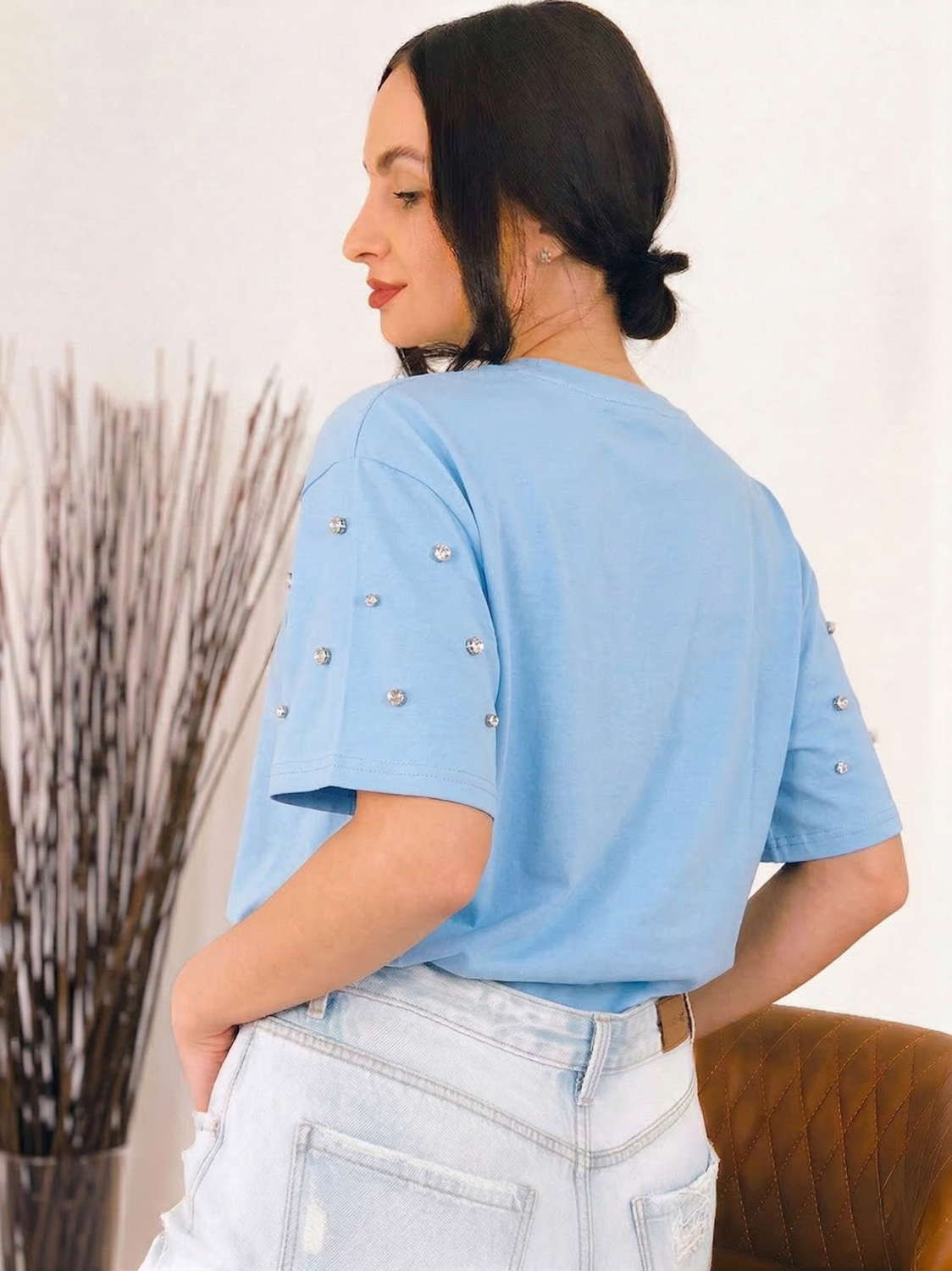 Dámske modré oversized tričko so striebornými aplikáciami na rukávoch