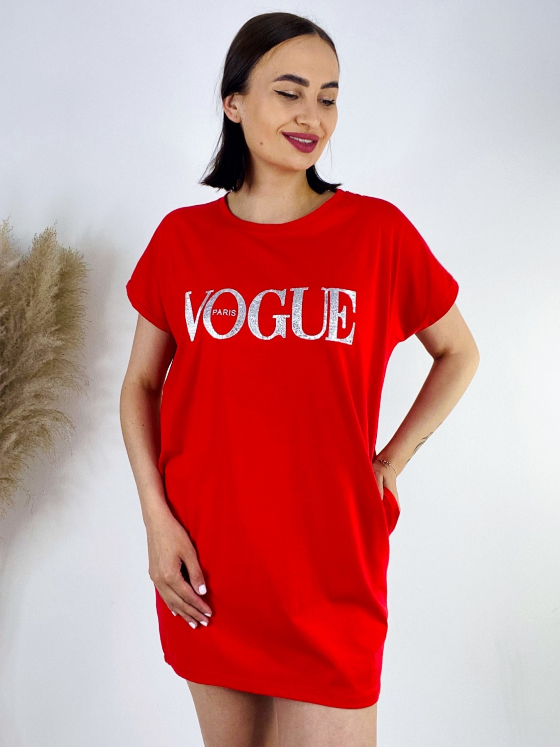 Dámske tričkové šaty s potlačou VOGUE, ktoré využijete na každý deň a budete sa v nich cítiť maximálne pohodlne a trendy. Šaty sú z príjemného a kvalitného materiálu. Oblečte si ich k teniskám alebo šľapkám a vyrazte von. Pri týchto tričkových šatách platí, že vyzerať a cítiť sa budete úžasne iba v pohodlnom a štýlovom outfite. Modelka je vysoká 175 cm a má oblečenú veľkosť S/M.