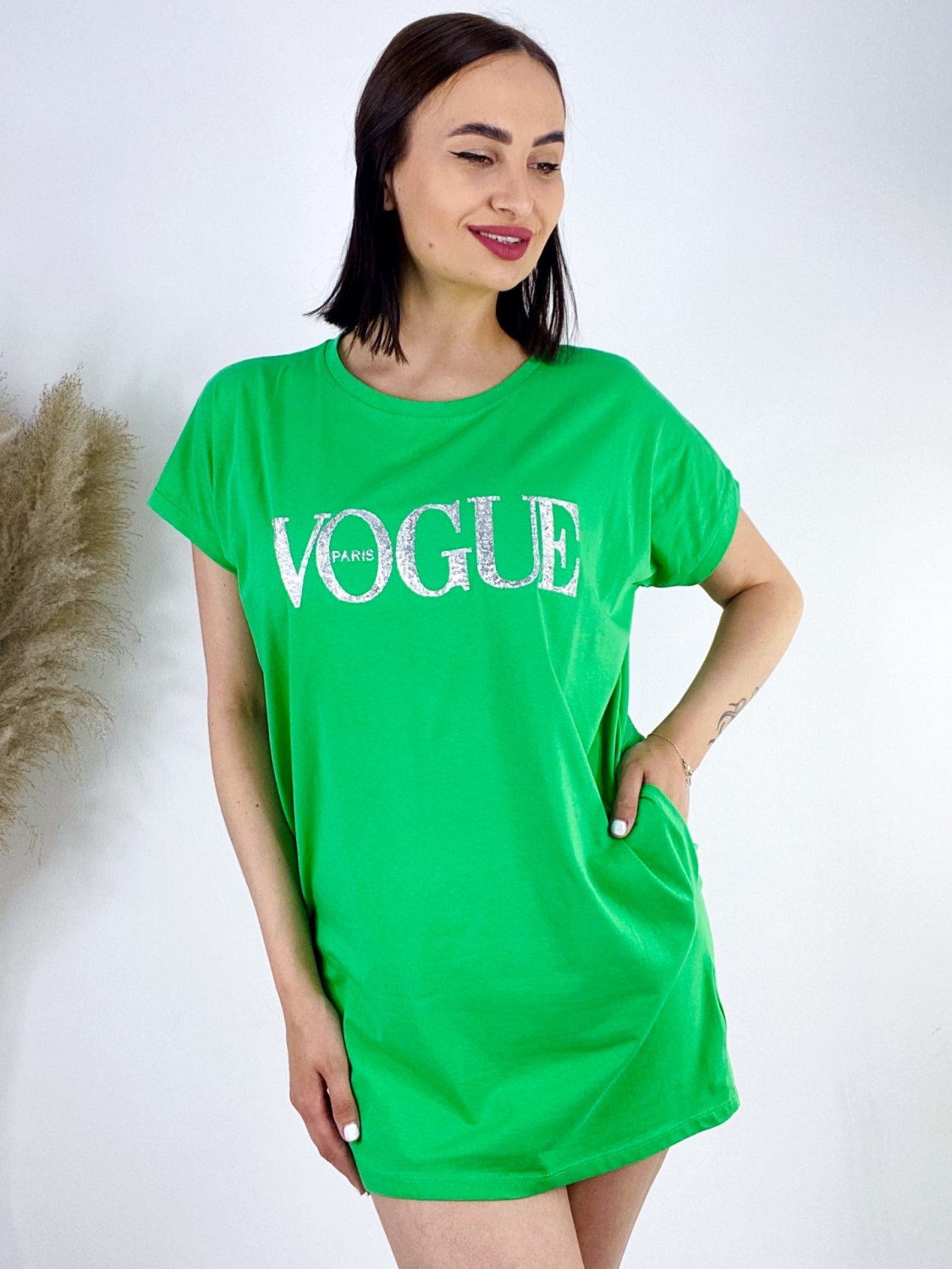 Dámske tričkové šaty s potlačou VOGUE, ktoré využijete na každý deň a budete sa v nich cítiť maximálne pohodlne a trendy. Šaty sú z príjemného a kvalitného materiálu. Oblečte si ich k teniskám alebo šľapkám a vyrazte von. Pri týchto tričkových šatách platí, že vyzerať a cítiť sa budete úžasne iba v pohodlnom a štýlovom outfite. Modelka je vysoká 175 cm a má oblečenú veľkosť S/M.