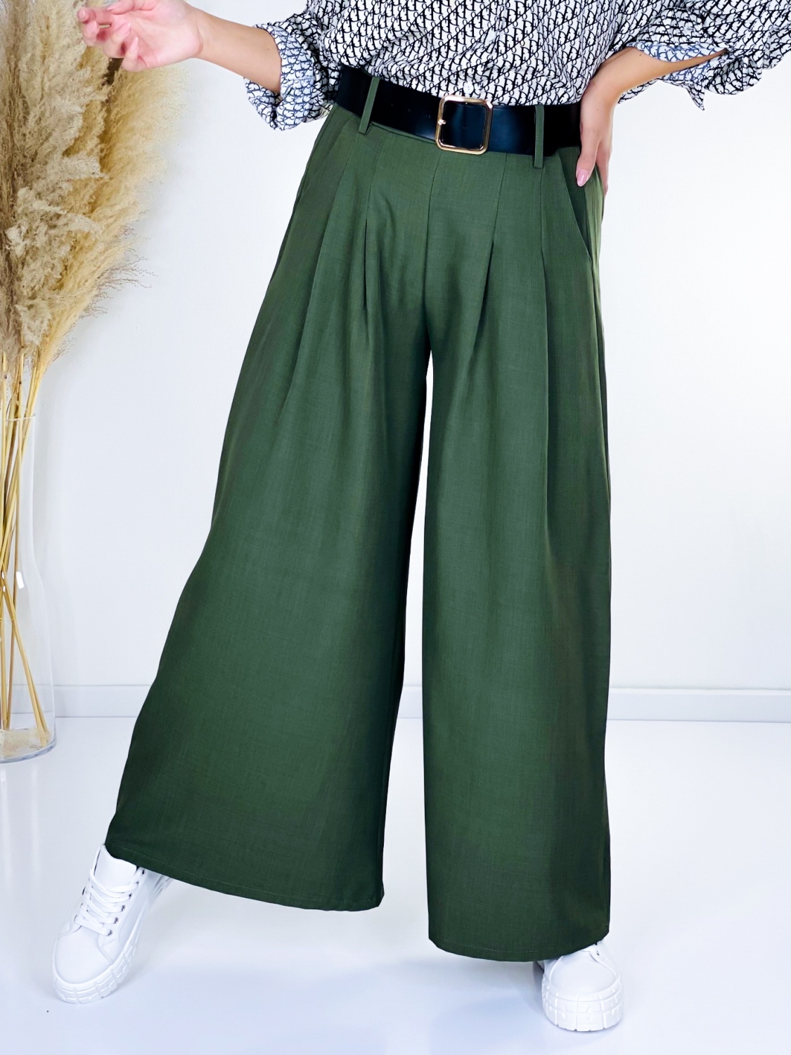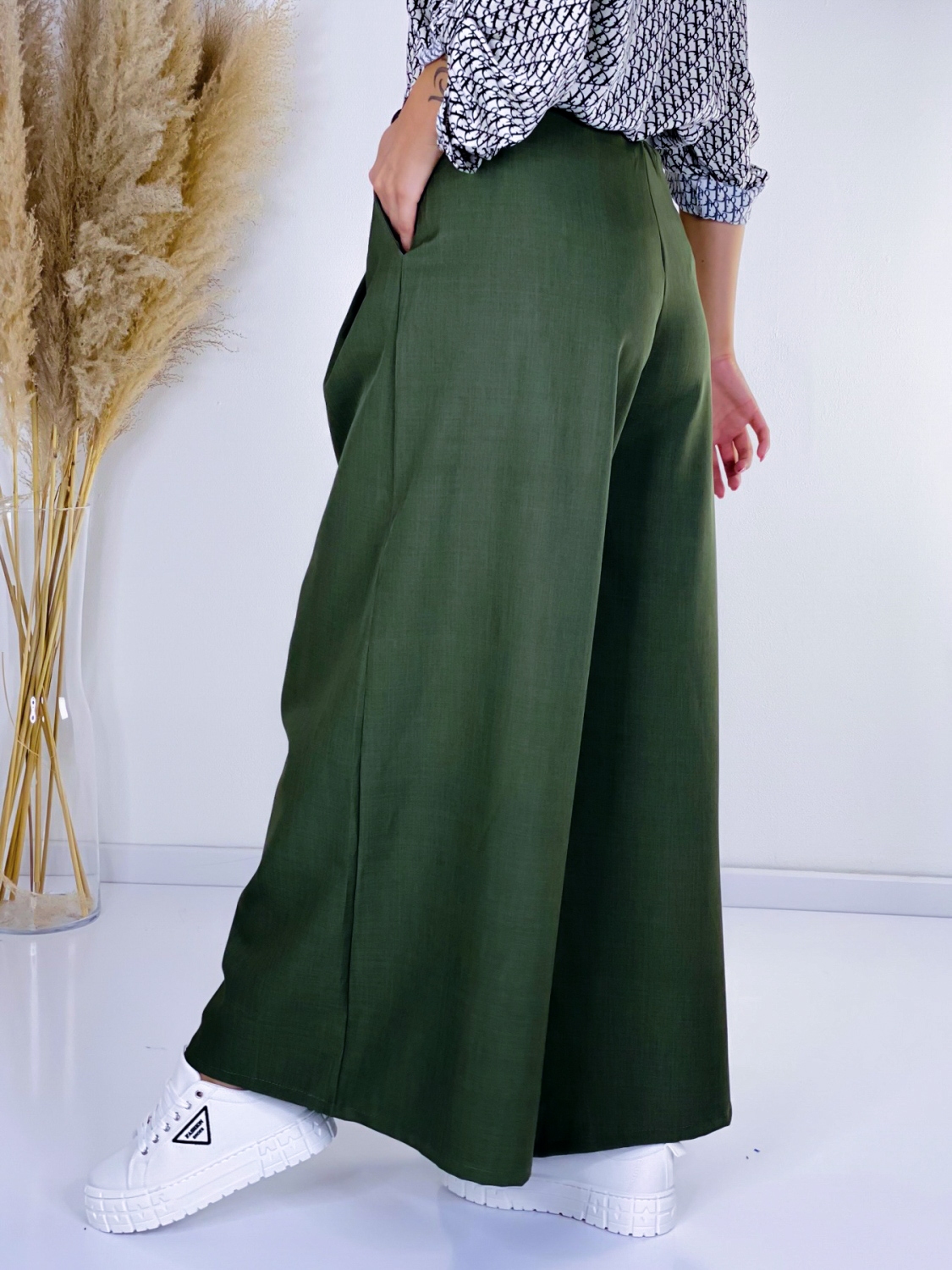 Dámske široké nohavice s vysokým pásom, ktoré sú v spodnej časti rozšírené. Perfektný efekt štíhleho pásu. Pás je pružný, prispôsobíte si ho vďaka gumičke v páse. Pohodlný strih si okmažite zamilujete. Ihneď zalichotia Vašej postave. Obujte si k nim tenisky, dolaďte zvyšok outfitu a vyrazte v trendy kúsku kamkoľvek, nikdy nič nepokazíte. Vrecká na oboch stranách. Modelka je vysoká 175 cm a má oblečenú veľkosť UNI.