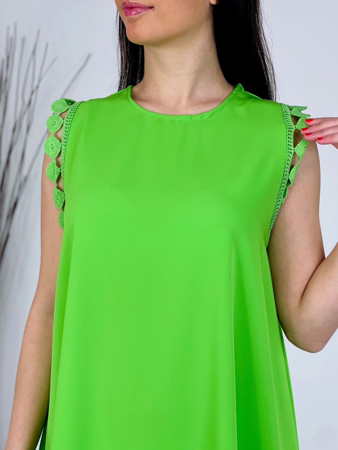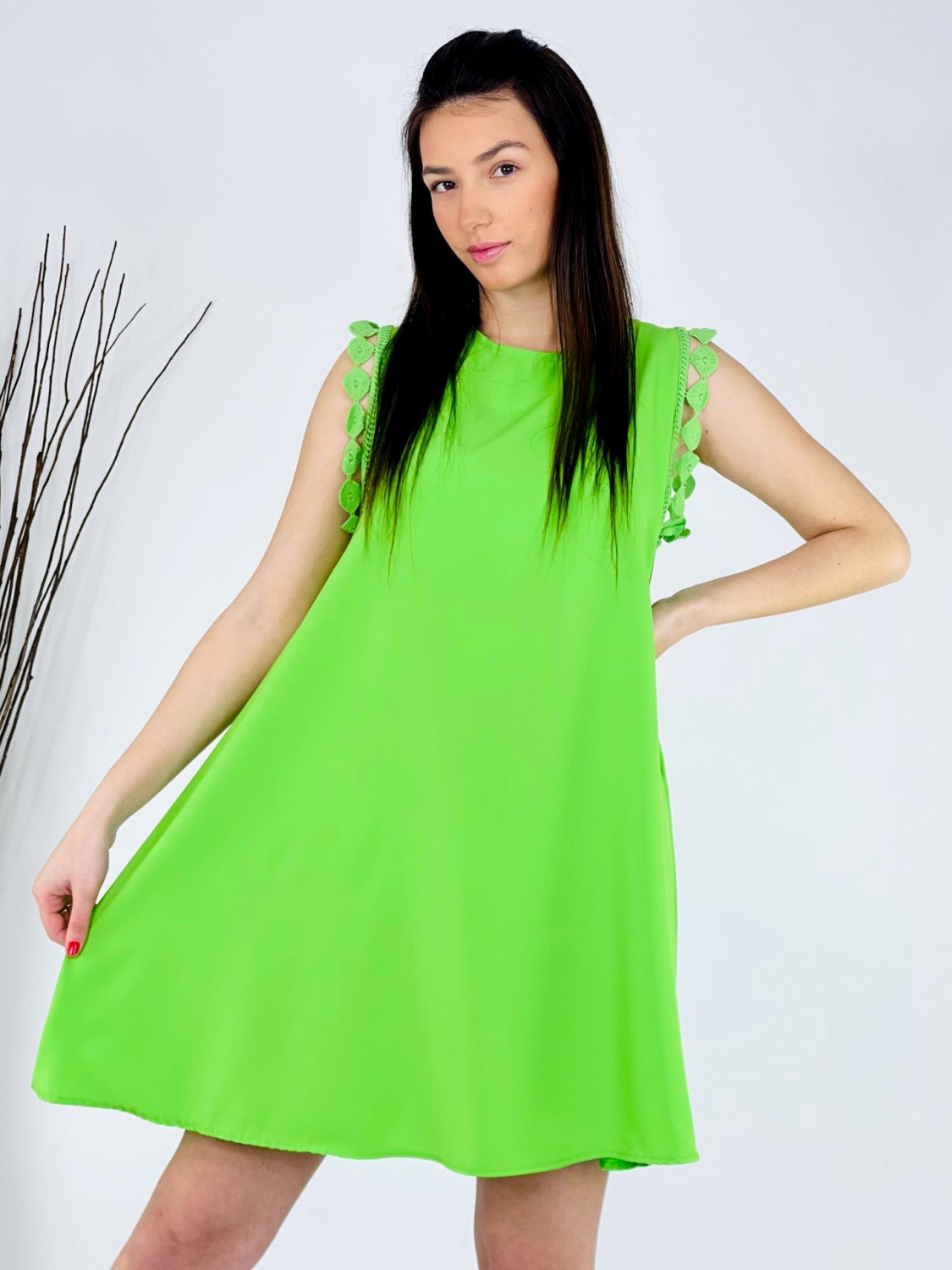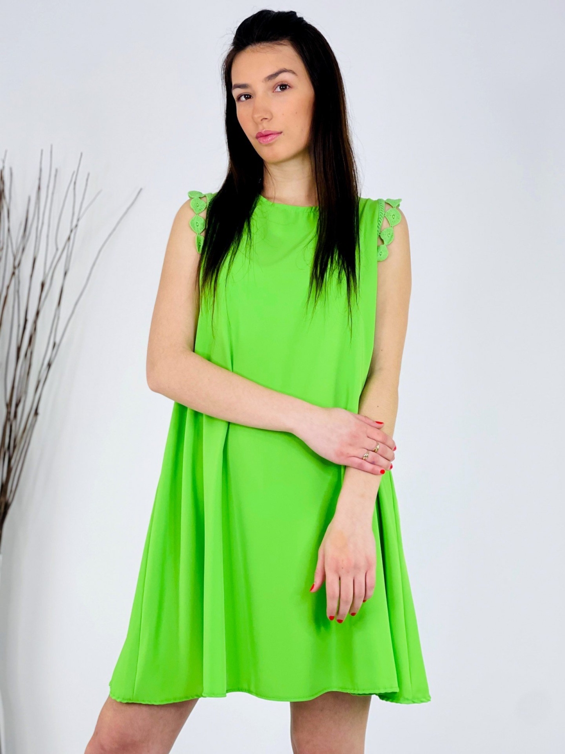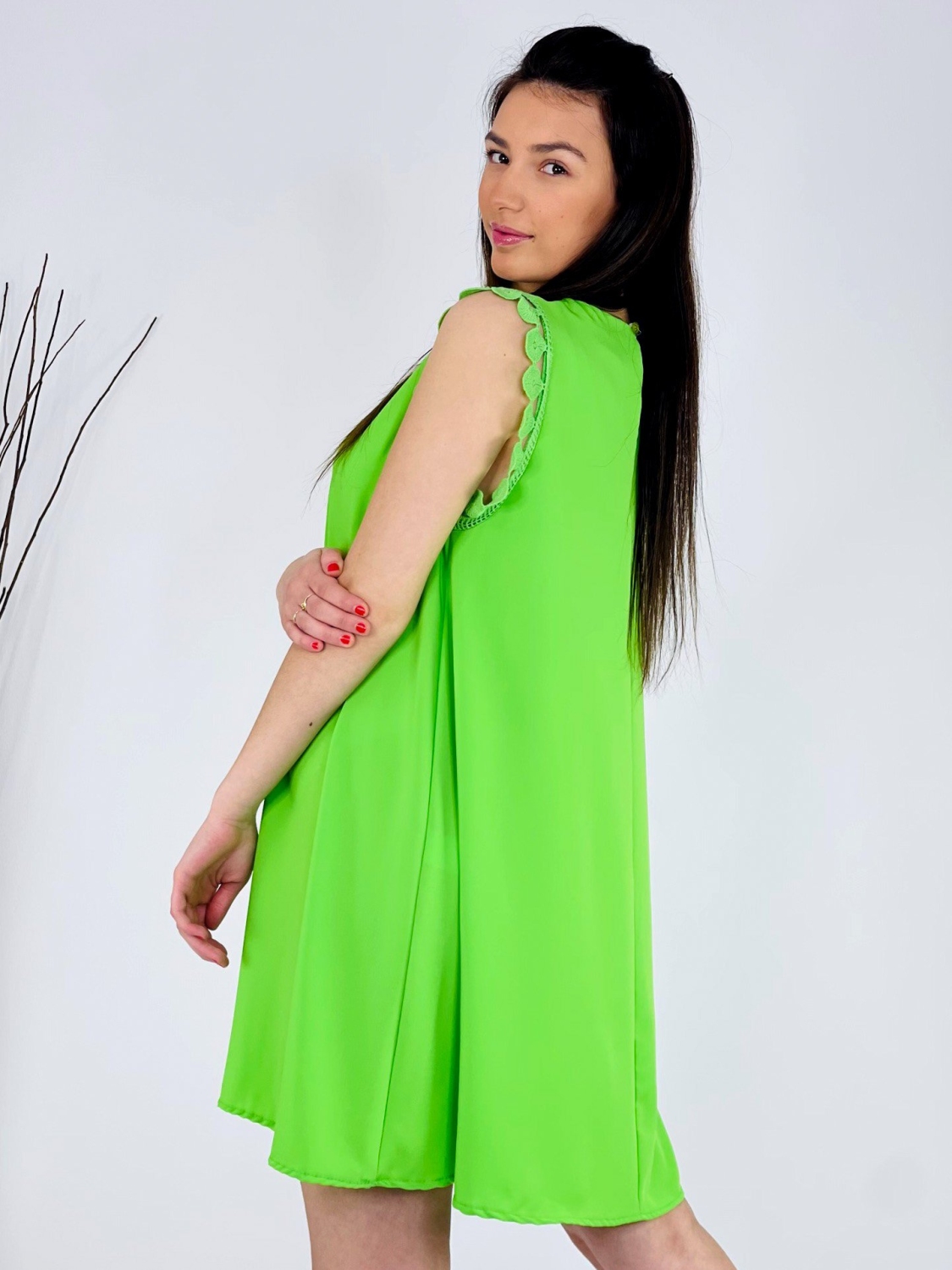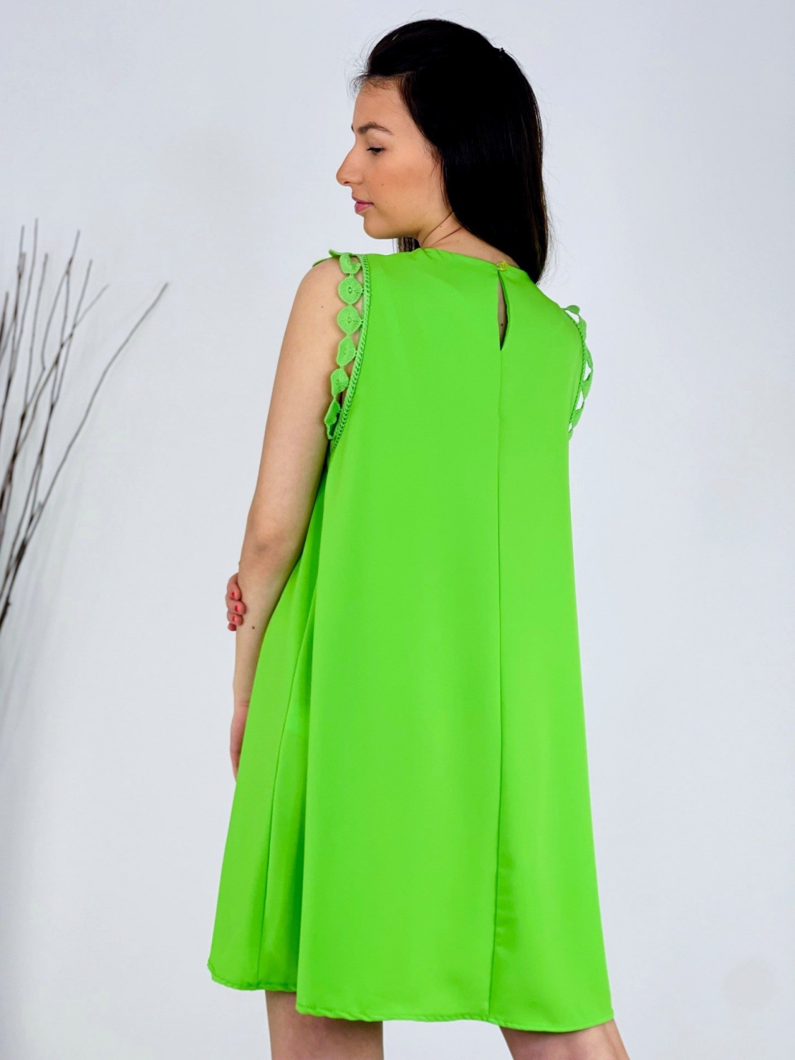 Dámske trendy šaty s ozdobným lémom na ramene, so zapínaním vzadu za krkom a áčkovým strihom. Dĺžka šiat siaha nad kolená a zapínajú sa vzadu na gombík. Kvalitný a veľmi príjemný padavý materiál. Tieto príjemné šaty perfektne ukážu na väčšine postáv, sadnú na veľkosť XS, S, M alebo aj na menšie L. Romantické a ženské strihom. Šaty ľahko skombinujete podľa vlastného vkusu a na akúkoľvek príležitosť, či je to svadba, oslava, párty alebo len tak na kávu, či prechádzku do mesta. Pohodlné a praktické na každodenné nosenie, ale aj na akúkoľvek spoločenskú udalosť. Vzdušný materiál si zamiluje každá z Vás. Modelka je vysoká 170 cm a oblečenú má veľkosť UNI.