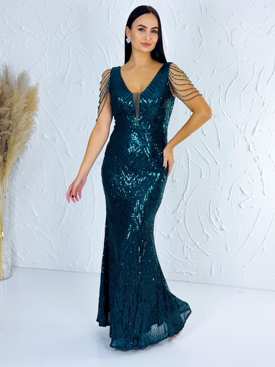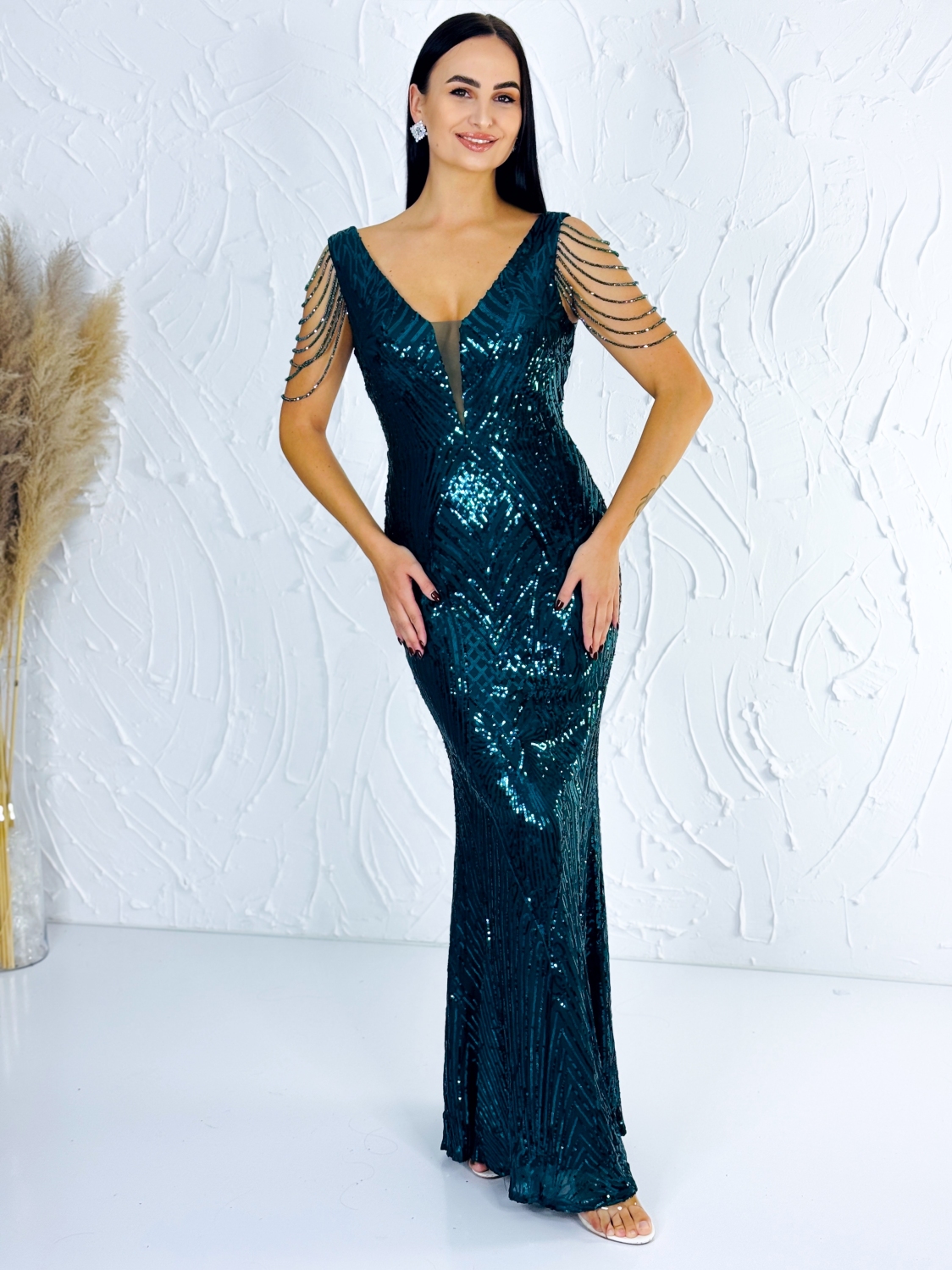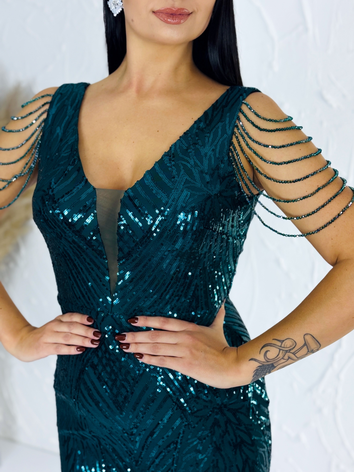 Dámske zelené trblietavé spoločenské šaty s flitrami na ramenách