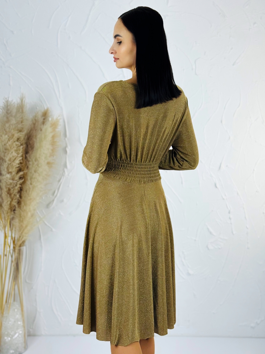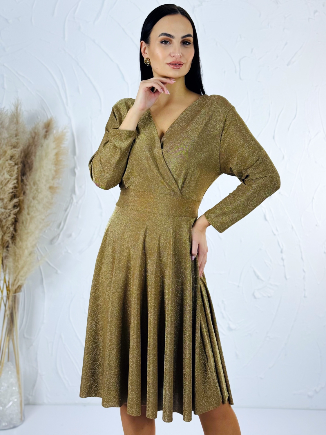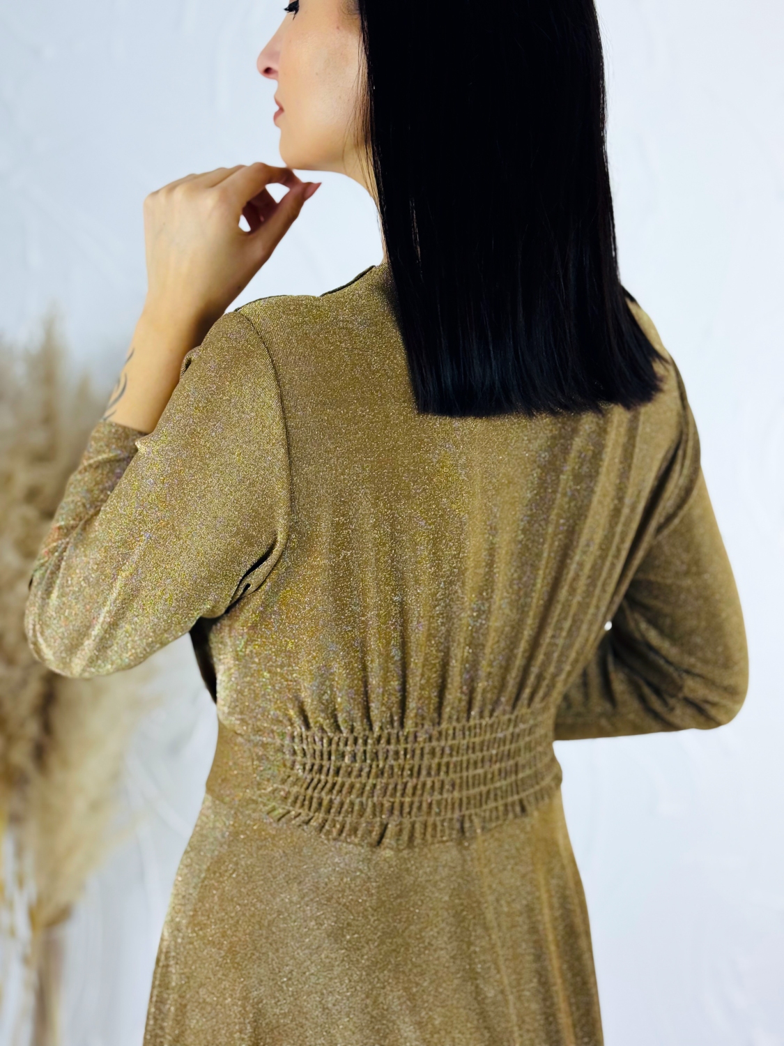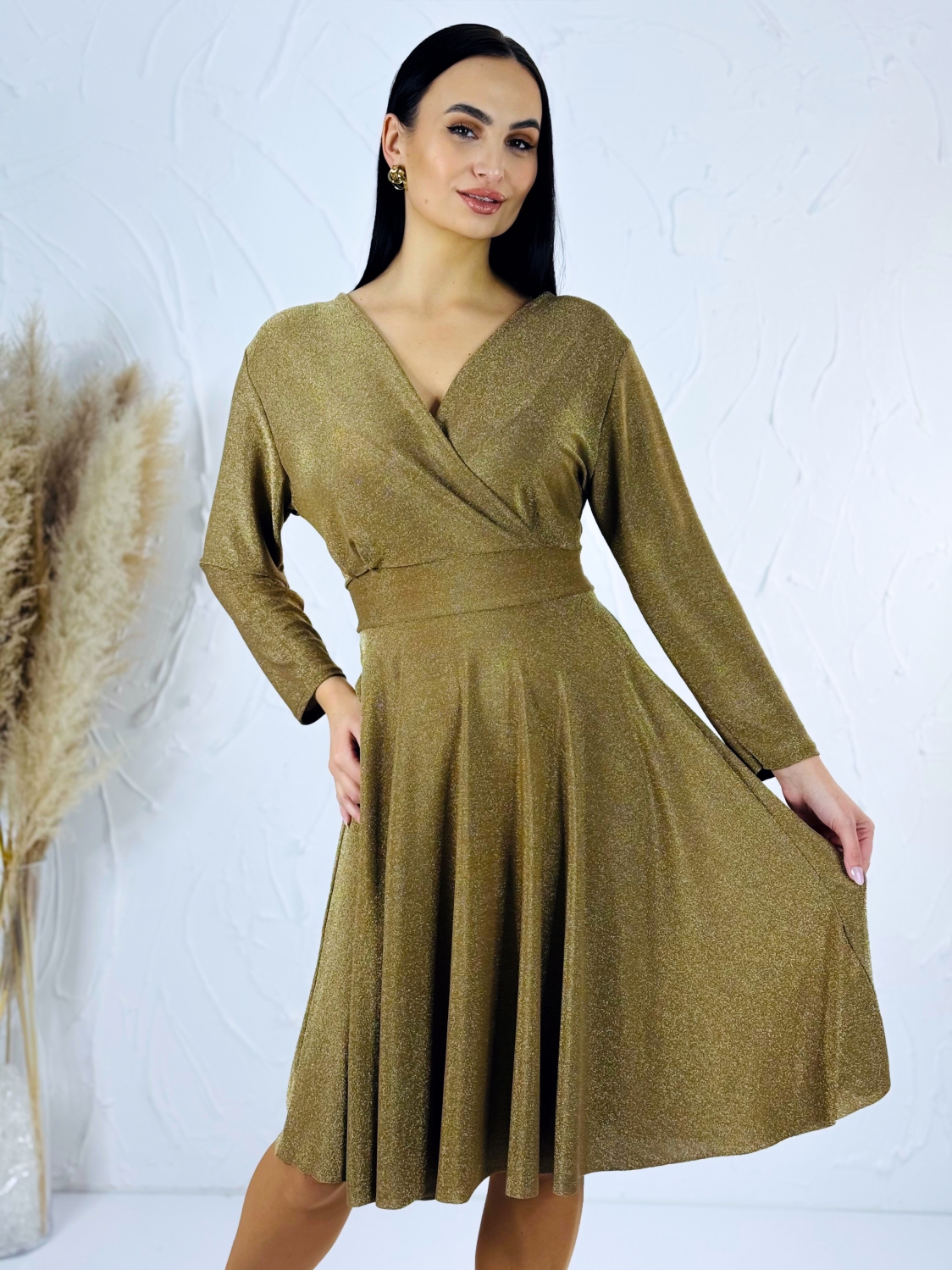 Tieto dámske trblietavé šaty sú stvorené pre ženy, ktoré chcú zažiariť a cítiť sa výnimočne pri každej príležitosti. Elegantný materiál s jemným trblietaním zachytáva svetlo z každej strany a dodáva šatám luxusný, oslňujúci vzhľad. Šaty sú navrhnuté s dôrazom na ženskú postavu – hlboký véčkový výstrih pôsobí zmyselne a zároveň elegantne, pričom jemne zvýrazňuje dekolt a pridáva sofistikovanú rafinovanosť celkovému strihu. Pružný pás je praktickým a zároveň štýlovým prvkom, ktorý opticky zoštíhľuje pás a zdôrazňuje prirodzené krivky. Vďaka voľnému, mierne áčkovému strihu sukne šaty krásne padnú na každú postavu, pohodlne sedia a diskrétne zakrývajú partie, ktoré si želáte nenápadne upriamiť pozornosť. Tento strih je obzvlášť vhodný aj pre moletky, pretože kombinuje komfort s elegantným, lichotivým dizajnom. Dĺžka šiat je premyslená tak, aby pôsobila nadčasovo a elegantne, ideálna na slávnostné večery, svadby, oslavy alebo spoločenské udalosti, kde chcete byť stredobodom pozornosti. Trblietavý efekt látky dodáva šatám jedinečný šarm a glamour pocit.