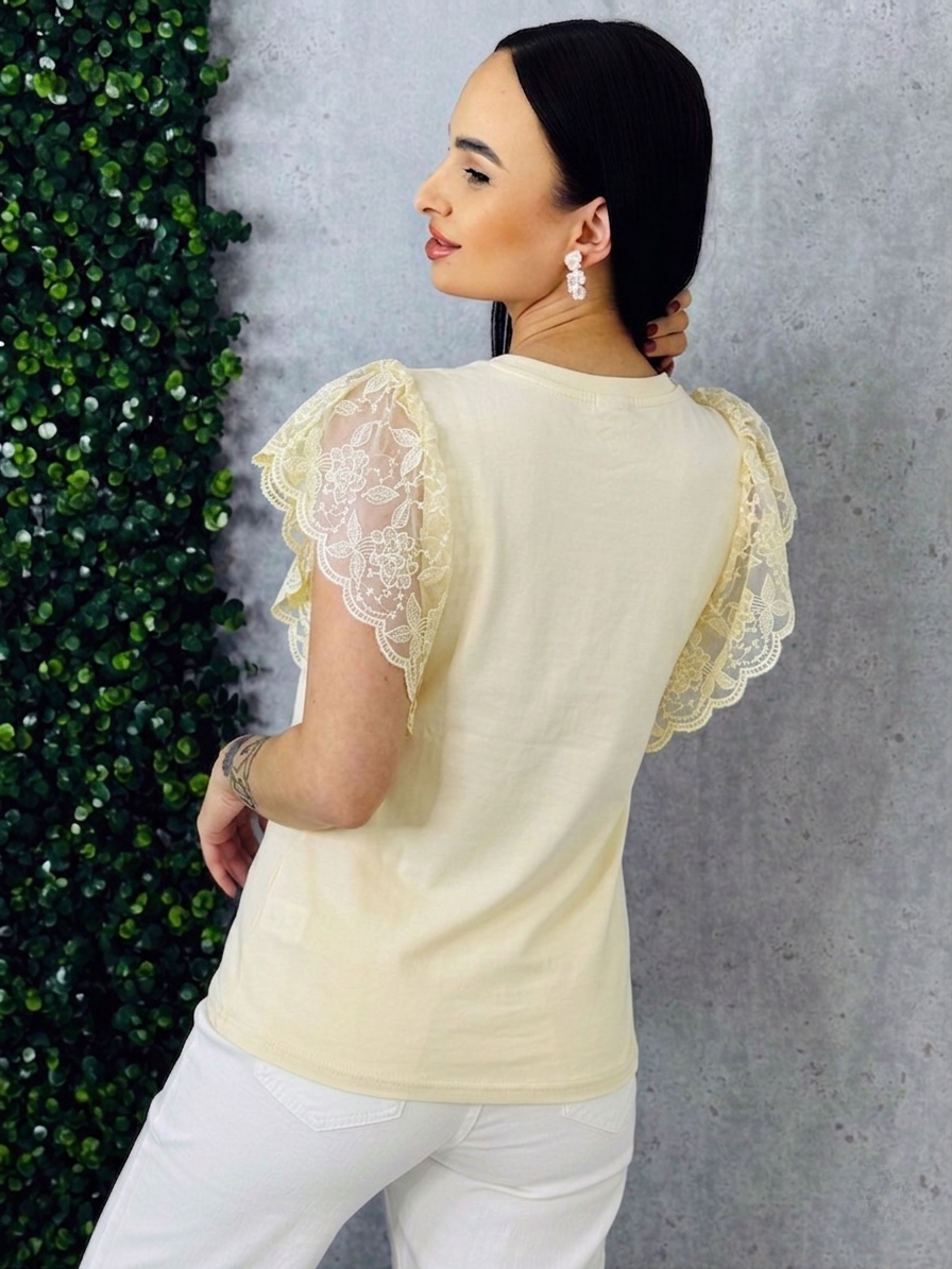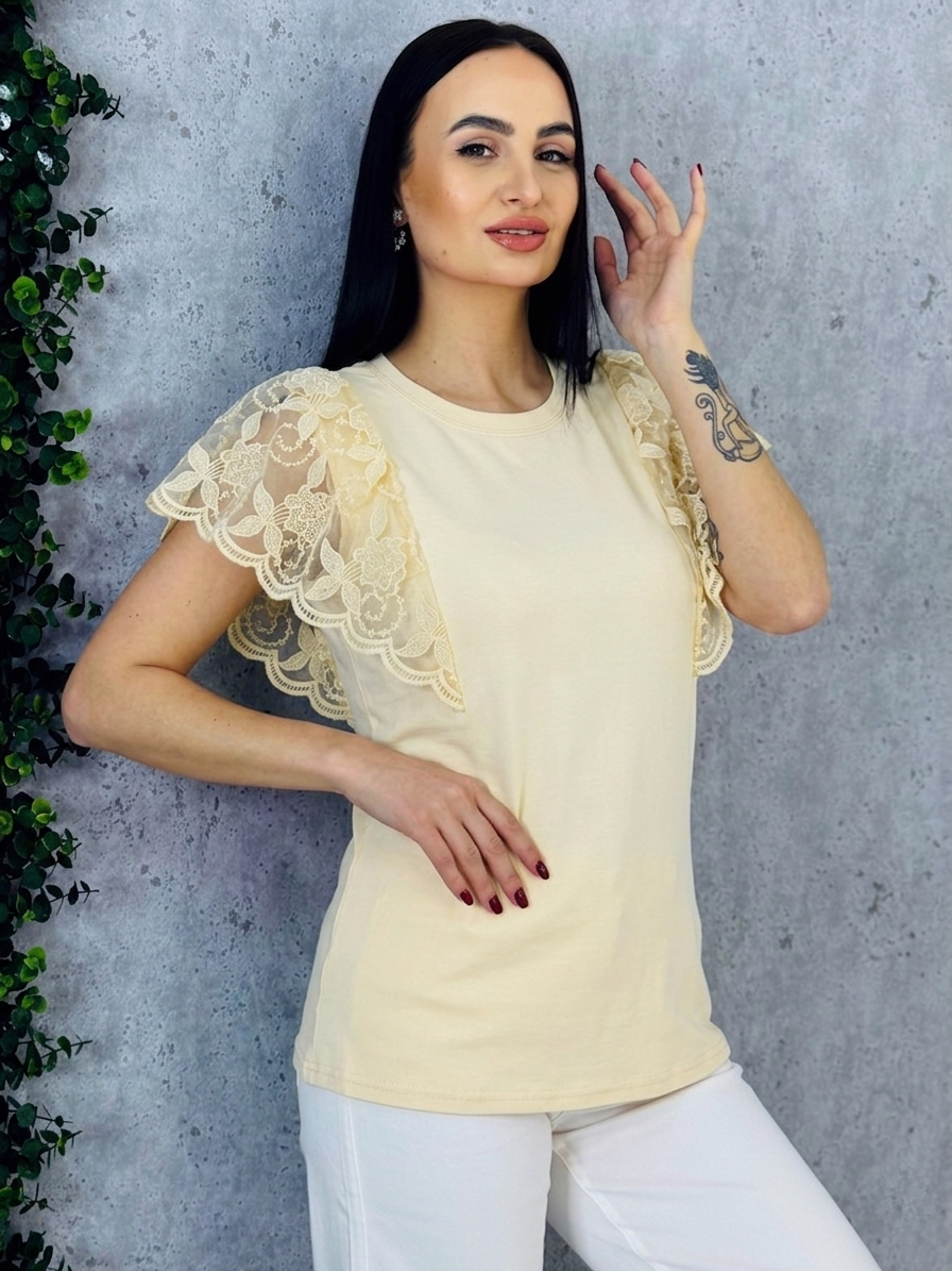 Objavte spojenie elegancie a pohodlia s týmto dámskym tričkom s čipkovanými rukávmi. Vyrobené z jemného, priedušného materiálu, ktorý sa príjemne prispôsobí každej postave, toto tričko vyniká svojím nadčasovým dizajnom a sofistikovaným detailom. Čipkové rukávy dodávajú kúsok ženskosti a romantiky, pričom jemne odhaľujú ruky a vytvárajú ľahko hravý, no elegantný vzhľad. Tričko je ideálne na kombinovanie s rôznymi outfitmi – od elegantných nohavíc a sukne až po obľúbené džínsy. Vďaka klasickému strihu a decentnému okrúhlemu výstrihu sa hodí na každodenné nosenie, do práce, na stretnutie s priateľmi alebo večerné výlety. Jeho ľahká údržba a kvalitné spracovanie zaručujú dlhú životnosť a stálu krásu materiálu aj po opakovanom praní. Toto tričko je perfektnou voľbou pre ženy, ktoré chcú byť štýlové a zároveň sa cítiť pohodlne – detailné čipkovanie dodáva jemný nádych luxusu a zaručuje, že váš outfit bude vždy pôsobiť upravene a elegantne. Vytvorte si svoj dokonalý look s týmto kúsok, ktorý kombinuje sofistikovanosť, ženskosť a praktickosť v jednom.