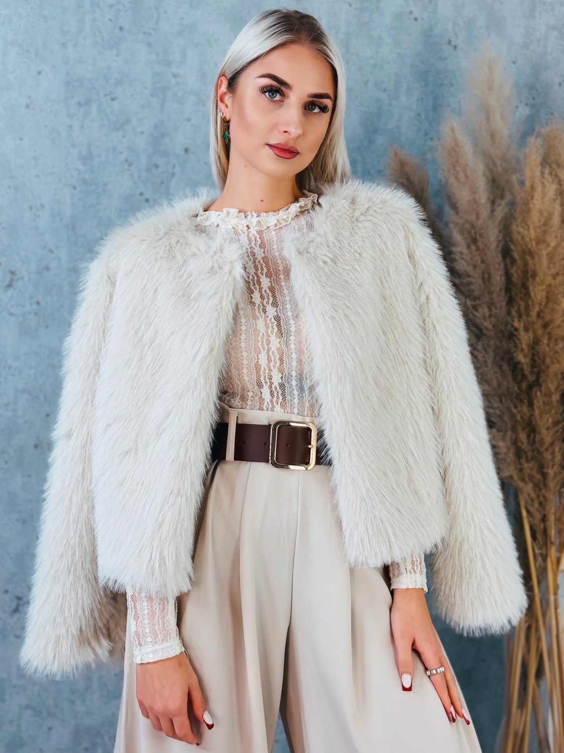 Dámske kožušinové bolerko je výrazným módnym kúskom, ktorý okamžite dodá outfitu pocit tepla, pohodlia a luxusu. Je vyhotovené z bohatej, huňatej kožušiny s jemným vlasom, ktorá je príjemná na dotyk a krásne drží tvar. Vďaka svojmu krátkemu strihu pôsobí bolerko ľahko a elegantne, pričom zvýrazňuje hornú časť postavy bez toho, aby zakrývalo siluetu. Bolerko je ideálne na nosenie počas chladnejších dní a večerov, kedy chcete zostať v teple, ale zároveň si zachovať ženský a upravený vzhľad. Huňatá štruktúra dodáva modelu objem a luxusný efekt, vďaka čomu sa stáva neprehliadnuteľným doplnkom k šatám, sukniam či elegantným nohaviciam. Je vhodné pre spoločenské udalosti, oslavy, večere, svadby, plesy, ale aj ako štýlový vrchný doplnok na prechodné obdobie. Toto kožušinové bolerko je určené pre ženy, ktoré majú rady kvalitné spracovanie, nadčasový dizajn a chcú svojmu outfitu dodať výrazný, ale stále vkusný módny akcent.