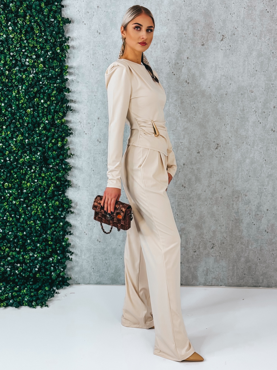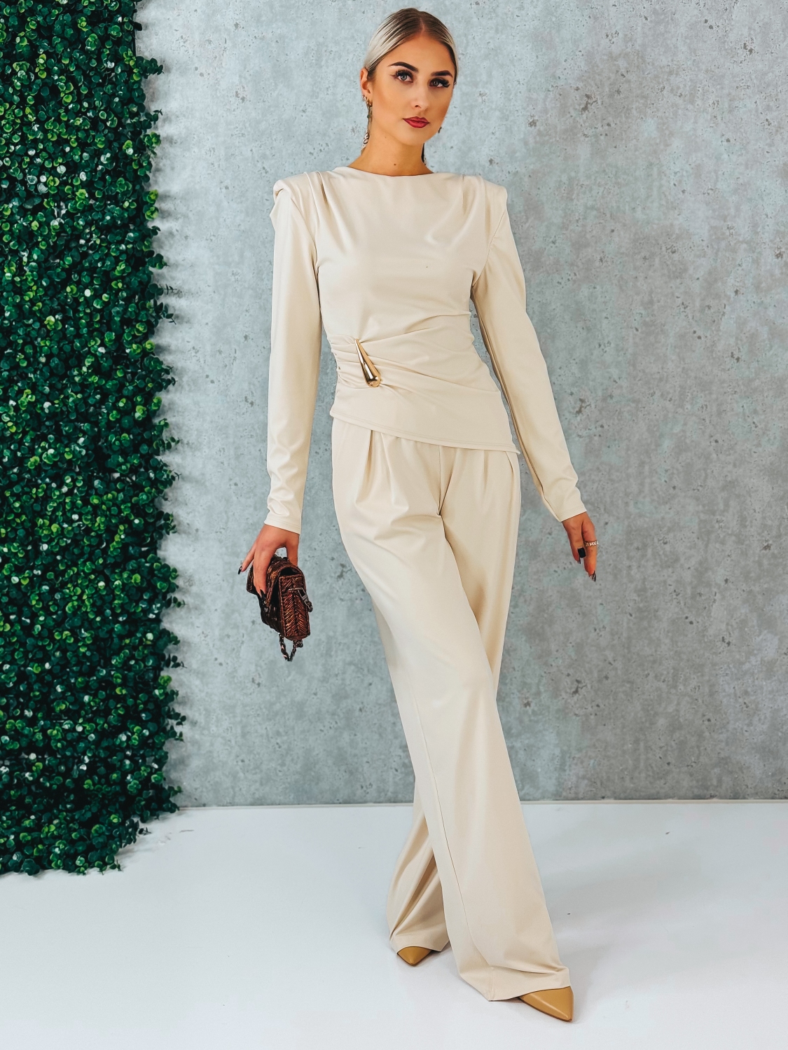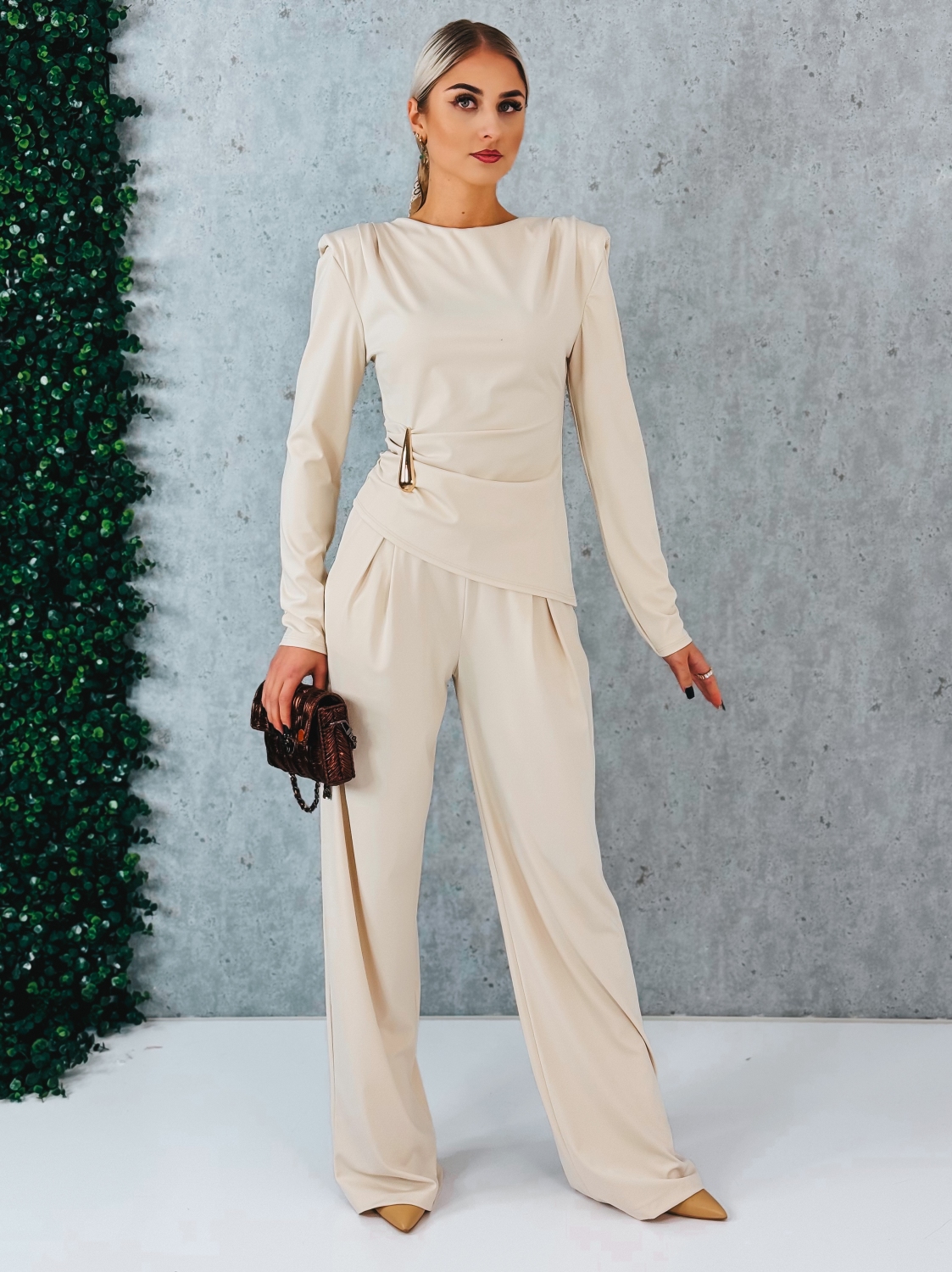 Dámsky priliehavý komplet so širokými nohavicami a topom s výrazným detailom je dokonalou voľbou pre ženy, ktoré chcú pôsobiť elegantne, žensky a zároveň moderne. Tento model je navrhnutý tak, aby zvýraznil postavu a zároveň poskytol maximálne pohodlie počas nosenia. Nohavice majú široký strih, ktorý pôsobí vzdušne a sofistikovane. Sú vyrobené z pružného materiálu, vďaka čomu sa krásne prispôsobia postave, nikde netlačia a zabezpečujú komfort počas celého dňa. Vysoký pás opticky predĺži nohy a spolu so širokými nohavicami vytvára elegantnú siluetu. Top s dlhým rukávom je priliehavý a krásne tvaruje vrchnú časť postavy. Na boku je ozdobený zlatou sponou, ktorá dodáva celému modelu luxusný a moderný nádych. Jemné riasenie v oblasti pásu zvýrazňuje ženské krivky a vytvára efekt štíhlejšej siluety. Práve tento detail robí komplet výnimočným a dodáva mu sofistikovaný charakter. Celý komplet pôsobí harmonicky a veľmi žensky. Je ideálny na spoločenské udalosti, večerné stretnutia, oslavy, ale aj na príležitosti, keď chcete zaujať a cítiť sa sebavedomo. Stačí doplniť lodičky alebo elegantné sandále a vytvoríte outfit, ktorý podčiarkne vašu osobnosť a zvýrazní krásu postavy bez zbytočnej okázalosti.