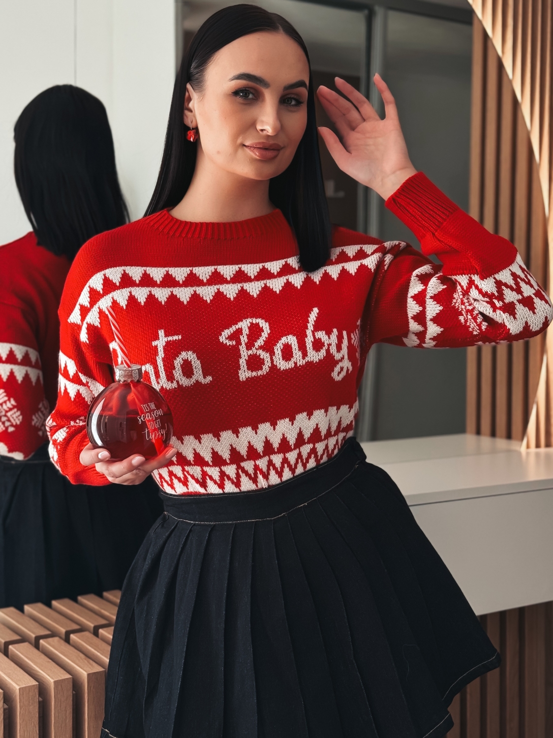 Dámsky červený vianočný sveter s nápisom Santa baby. Sveter je vyrobený z kvalitného a veľmi pohodlného materiálu. Sveter je s dlhým rukávom. Jemný, mäkký a hrejivý zároveň. Sľubujeme Vám, že si tento svetrík obľúbite hneď pri prvom oblečení a už ho nebudete chciet dať dole. Štýlový kúsok z novej kolekcie, ktorý Vám v šatníku zaručene nesmie chýbať. Jednoducho ho skombinujete a budete zaručene štýlová. Sveter môžete darovať aj ako darček pod vianočný stromček. Modelka je vysoá 175 cm a oblečenú má veľkosť UNI.
